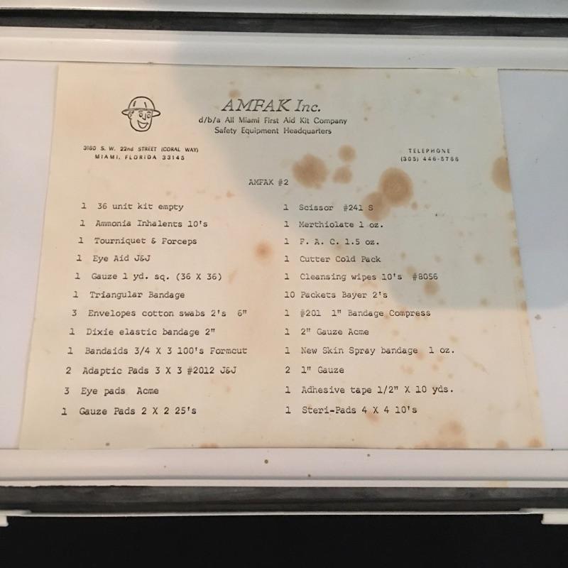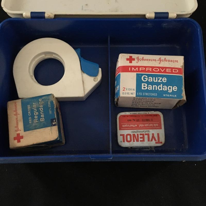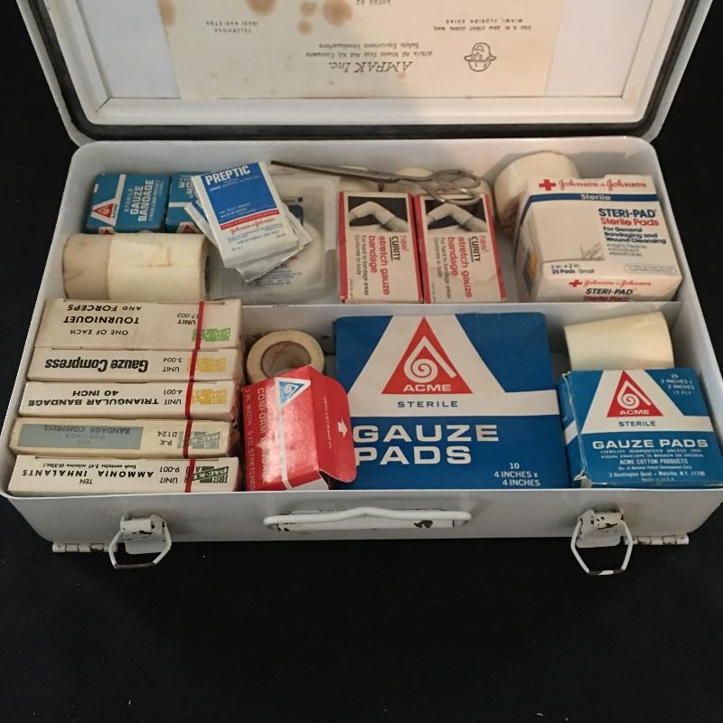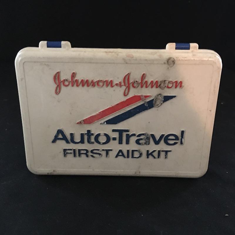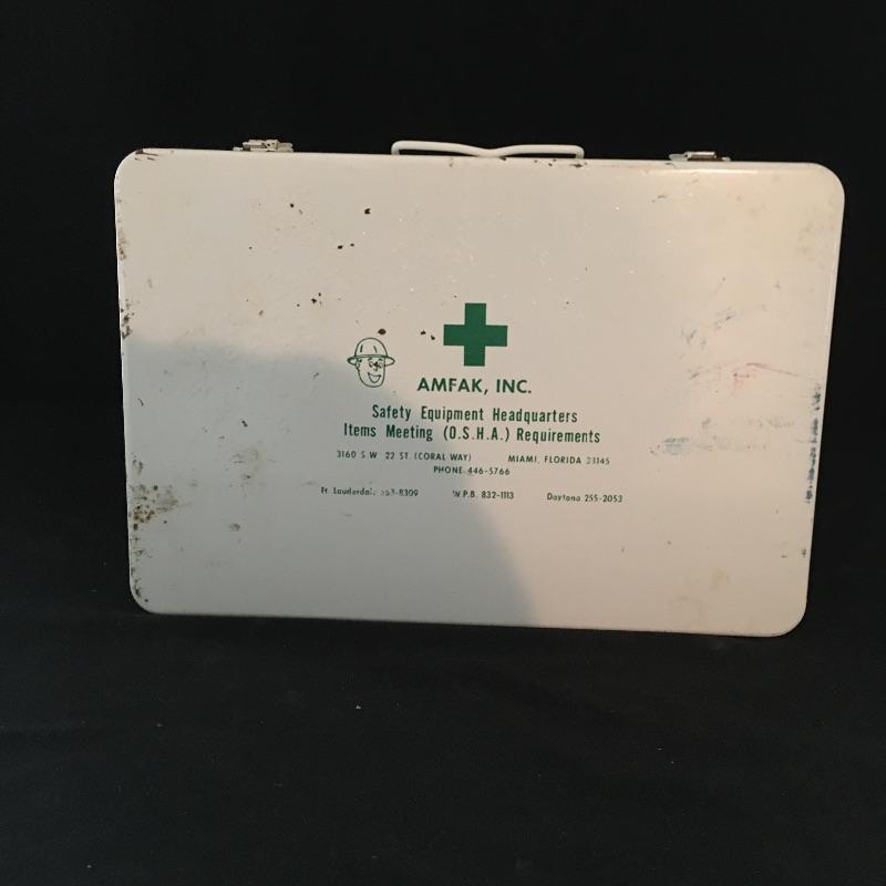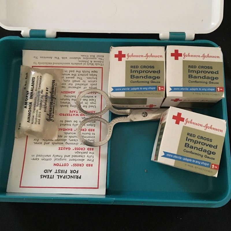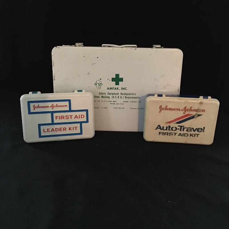 What a neat find! Three vintage first aid boxes. Lot includes two Johnson and Johnson plastic first aid boxes and a metal AMFAK box that measures 9.5” x 13.5” x 3”. Contents included, but we do not guarantee effectiveness.