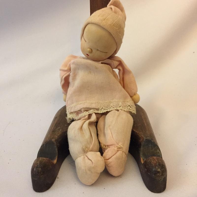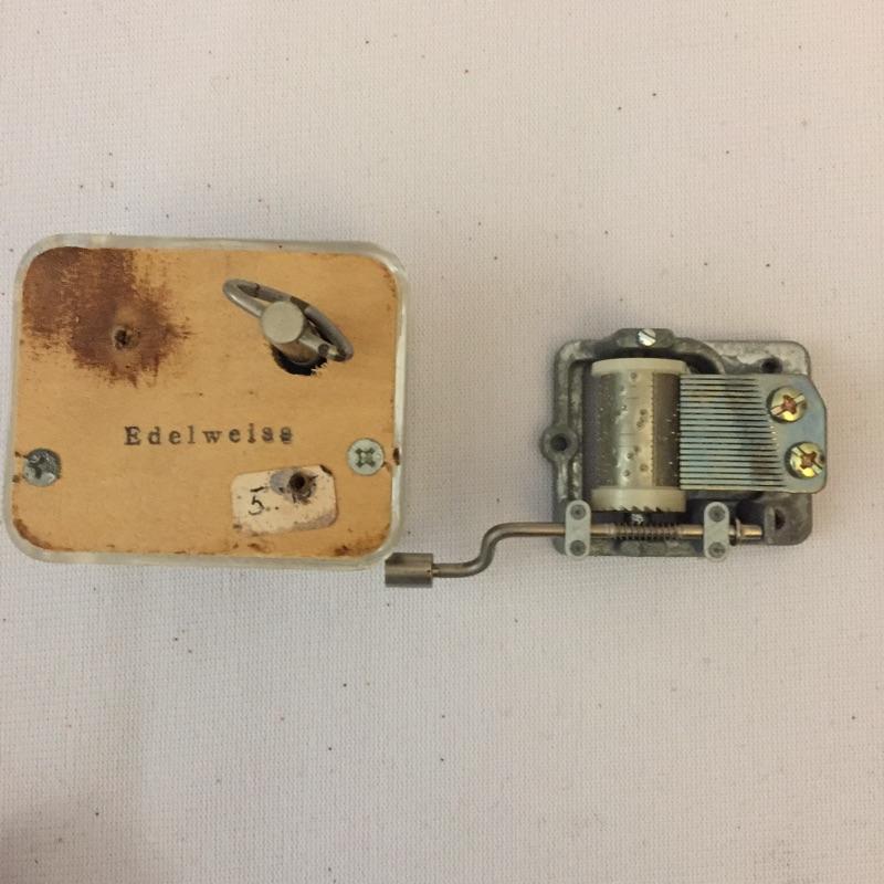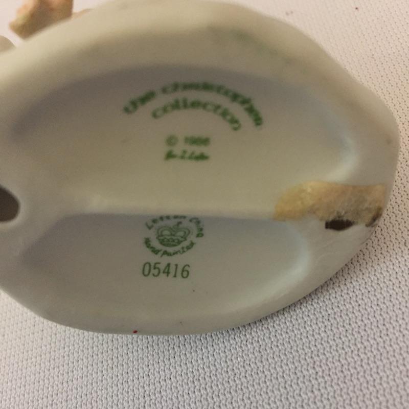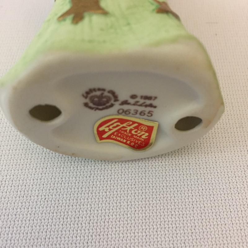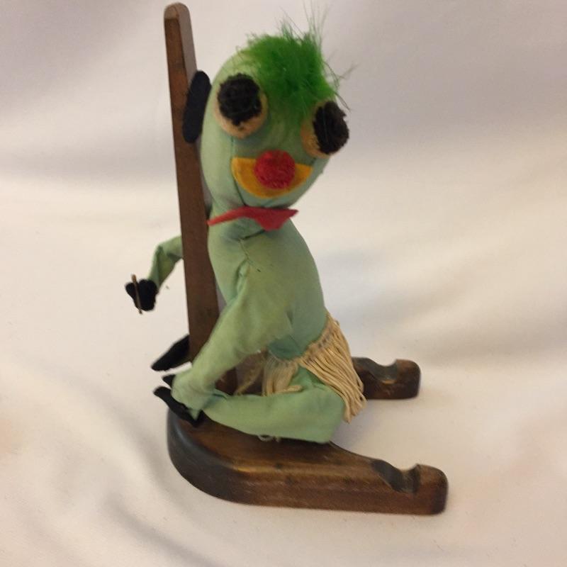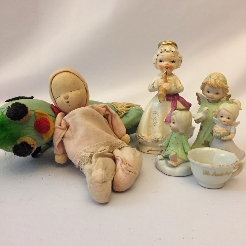 Sweet assortment of figurines and dolls for a collector or child’s bedroom. Three Lefton China and one other figurine and a tiny tea cup complete the China items. Also included are two music box parts one of which plays Edelweiss, the other Moonlight Sonata. Last but not least we have two very old antique stuffed toys, a pink baby doll and the rather unusual green guy who is called Snuggles and will hug whatever he is given to hug.