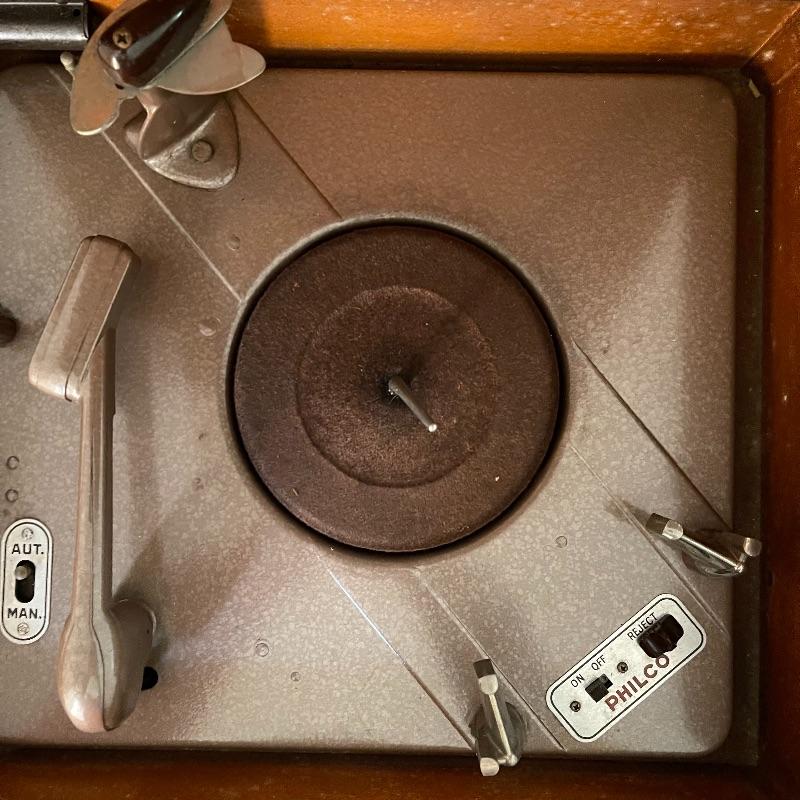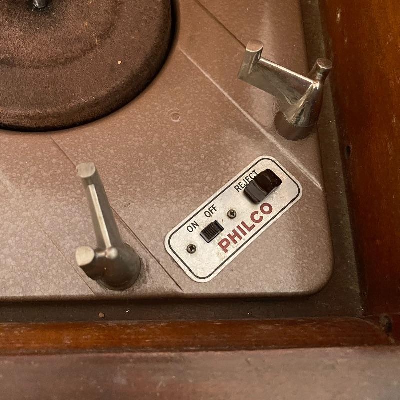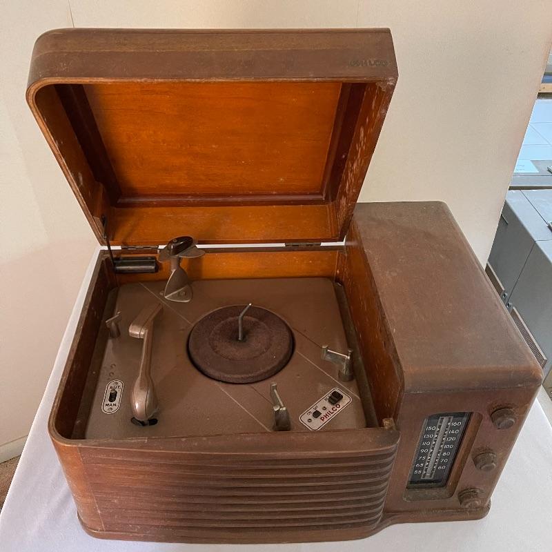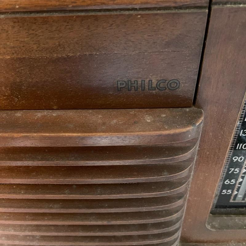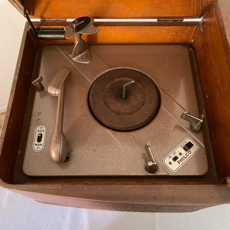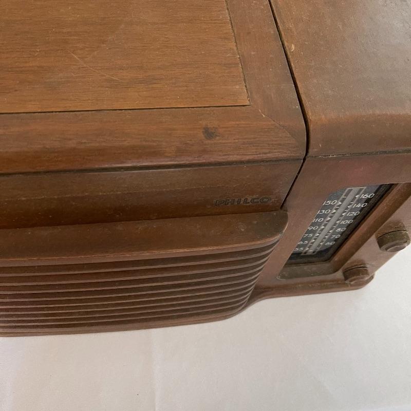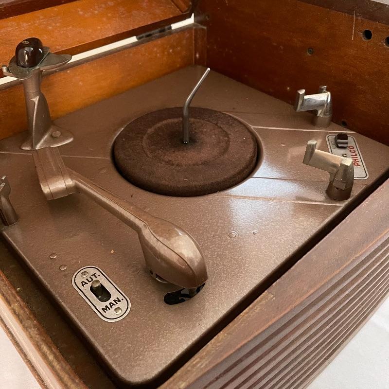 Vintage Philco phonograph/turntable and radio. Made in 1946, the model is 46-1203. The whole body is wooden and solid. Unit has plug but only makes a humming sound when plugged in.