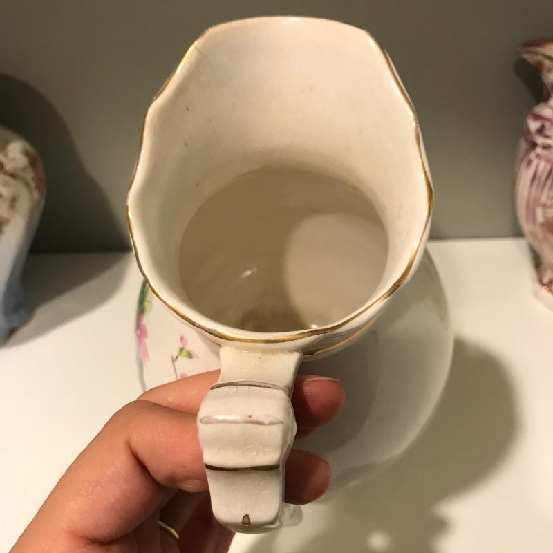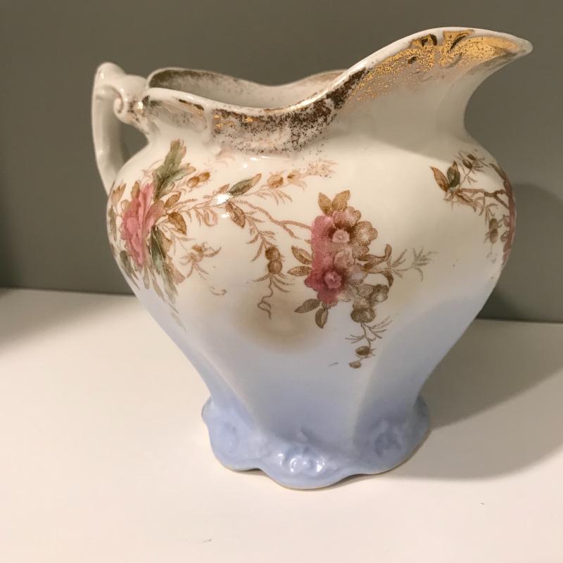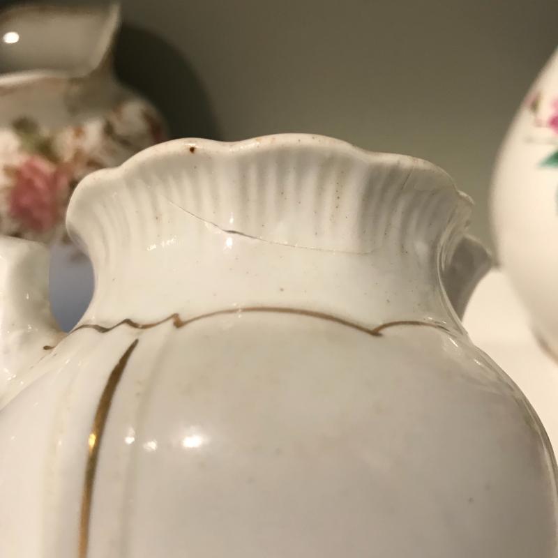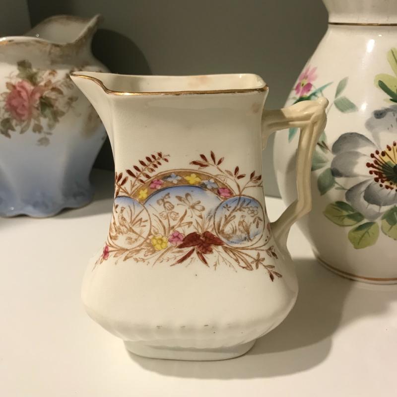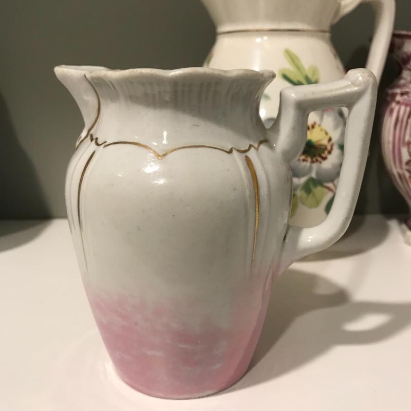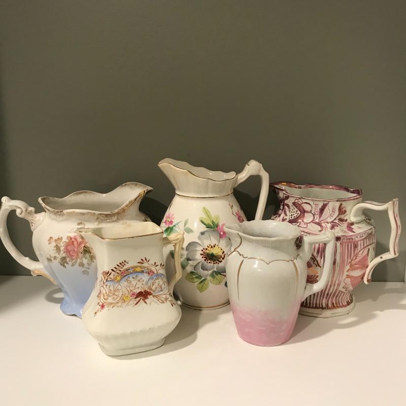 Five delicate pitchers to add to or begin your collection. The tallest measures 7”h. Some wear and cracks noted in photos. Local Pick up