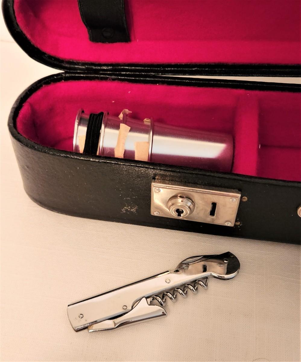 This cool piece has never been used - MidCentury liquor case/travelling bar contains spot for bottle, has it's own opener, and set of stainless jiggers all in the form of an 18" long violin case. Locks - has the keys.