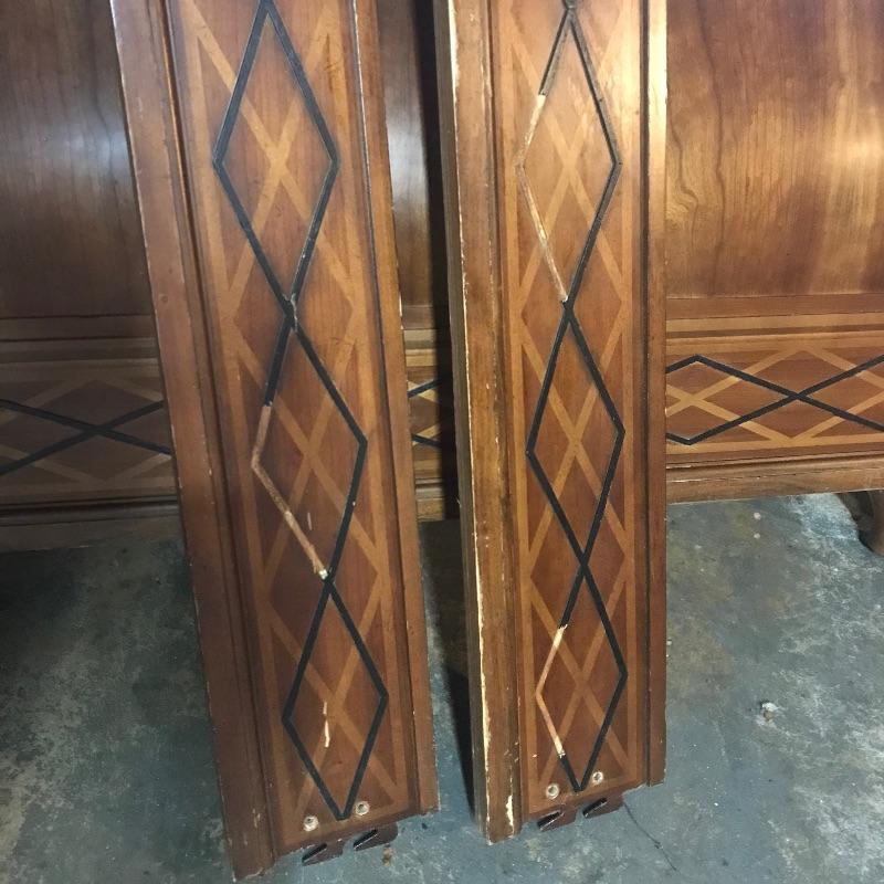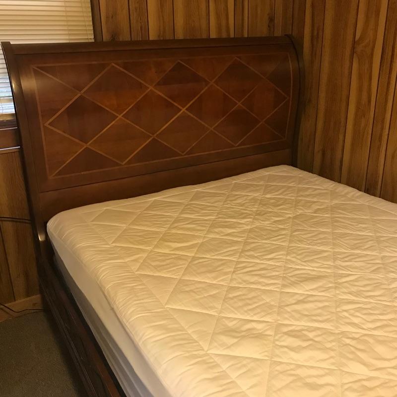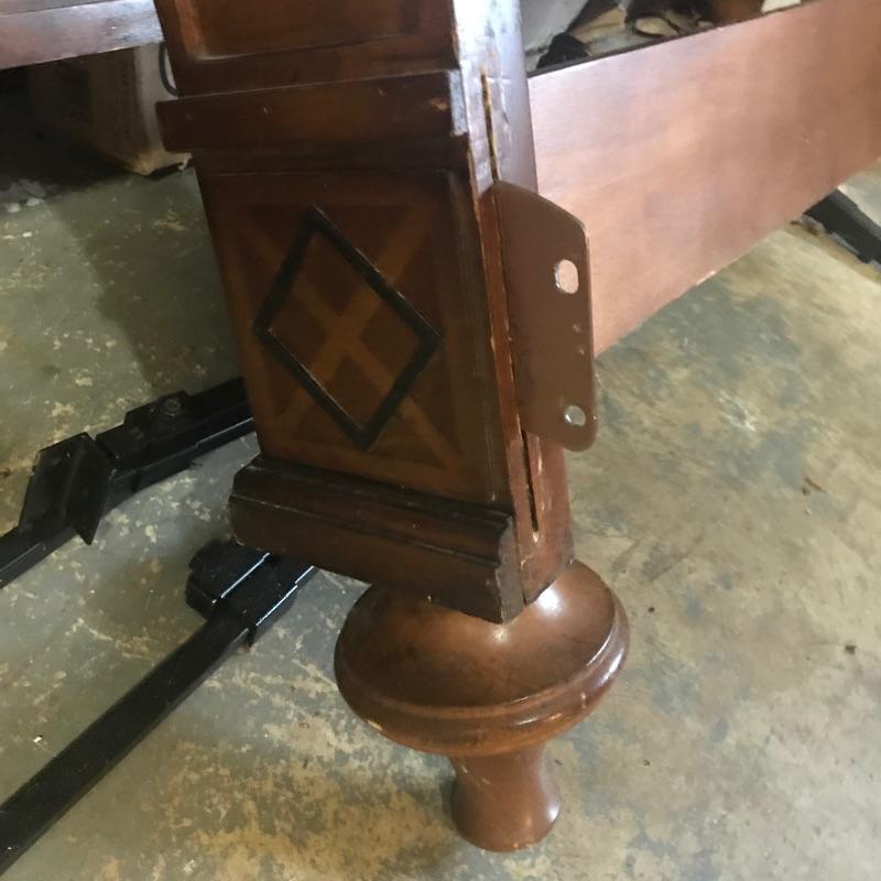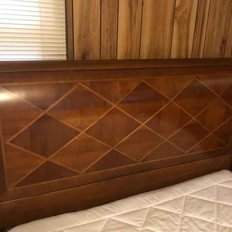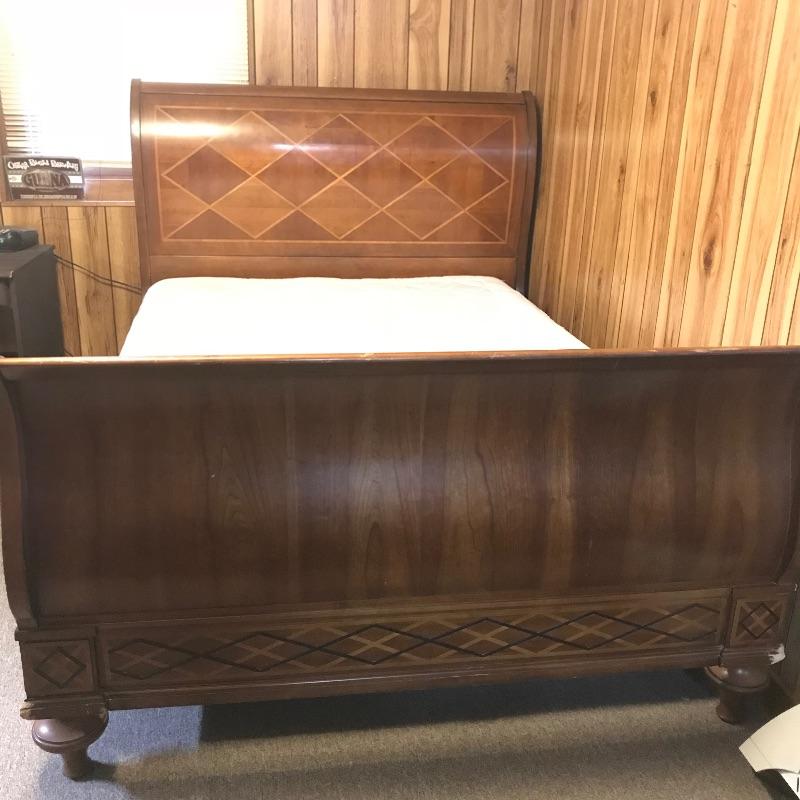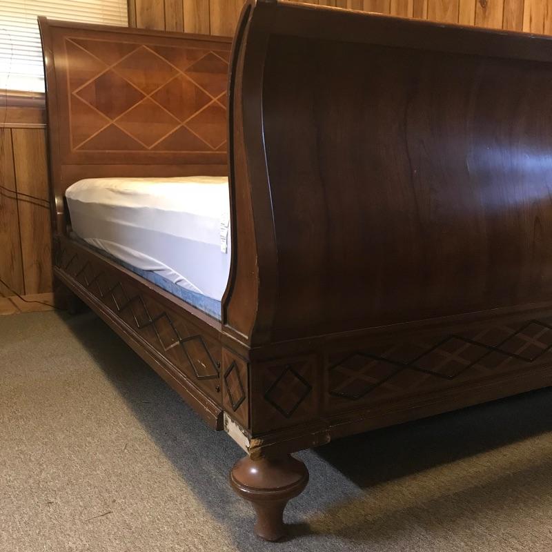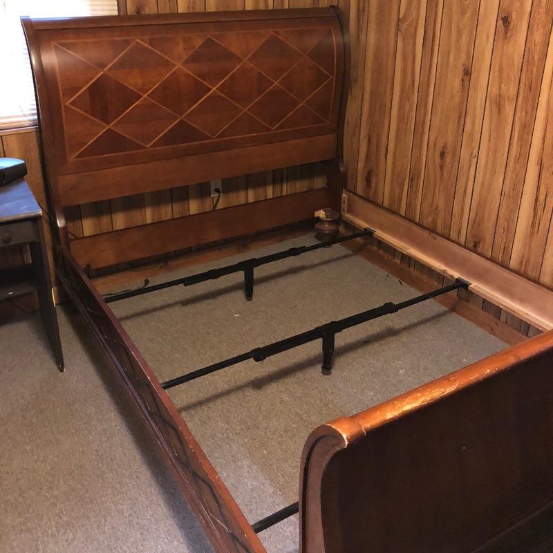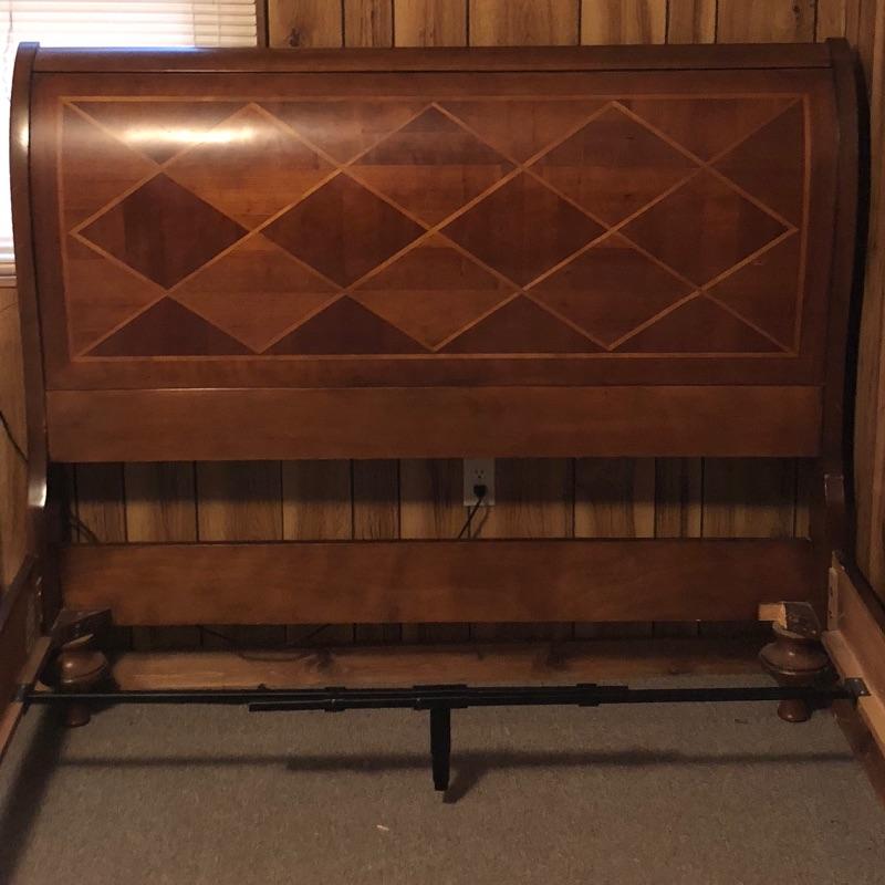 Do you want a bed that makes a statement? Here you go! Beautiful solid wood sleigh bed with rails. Bed has nice diamond design on headboard and side rails. Foot board corners near feet are in need of sanding and rails show wear. The rails have some missing pieces of the black diamond designs of the diamonds, would be an easy fix for a wood worker, or easily covered up by either black polish or a long comforter. Bed comes with a 3 pc metal frame that screws into side rails. Queen mattress box springs not included. Headboard is approximately 64.5” x 58”. Headboard and footboard both have some wear or scratches shown in images, it appears they can easily be covered up. One rail hardware appears stuck in the headboard, but bed appeared sturdy when fully assembled. Local pick up only.