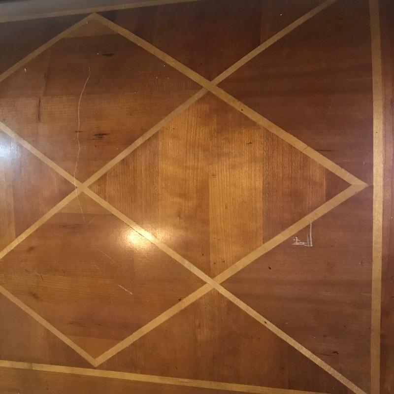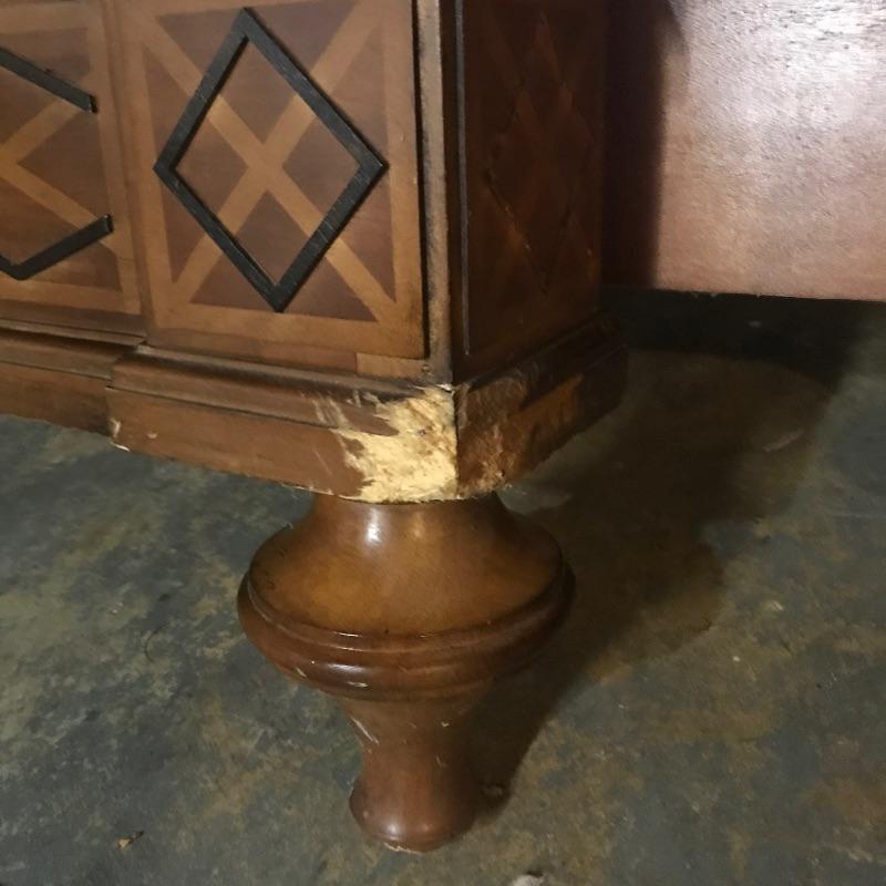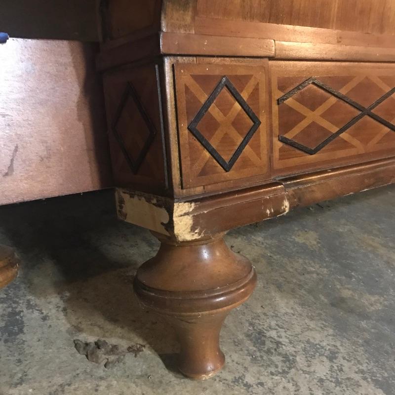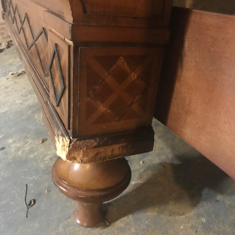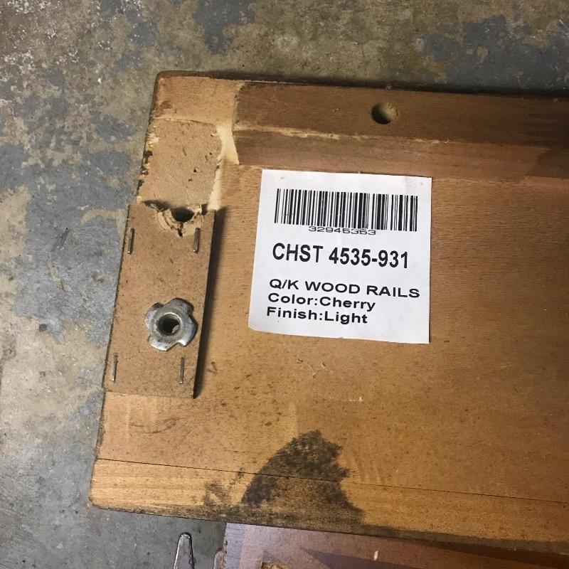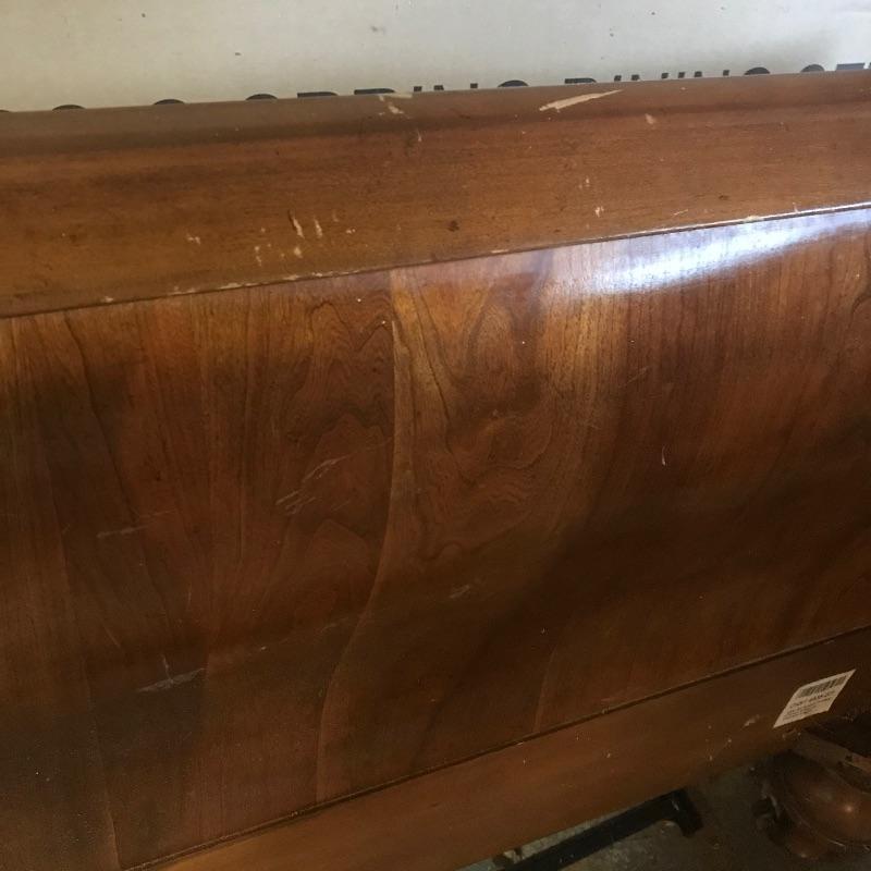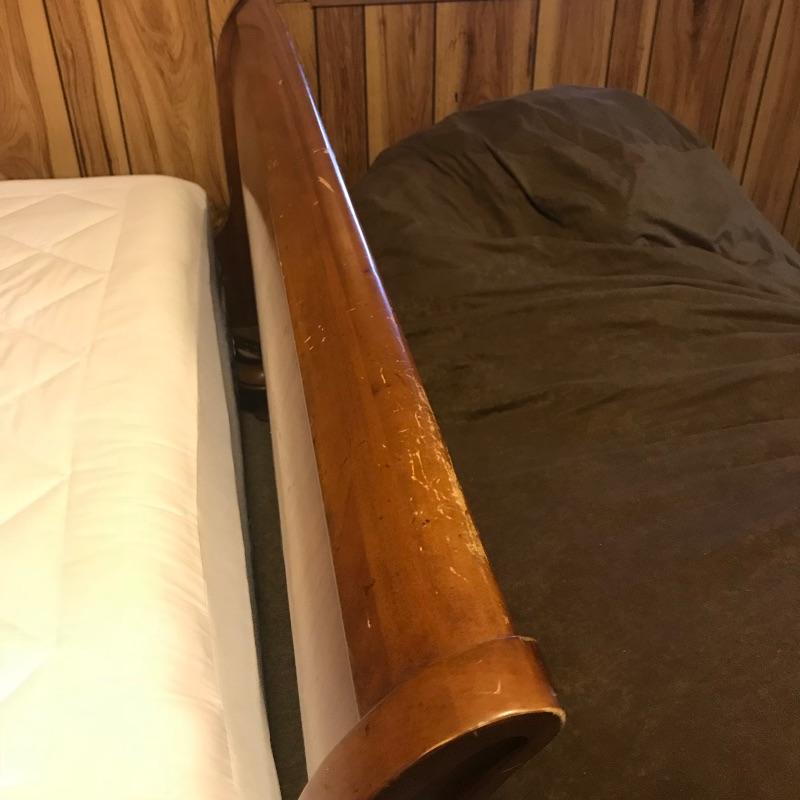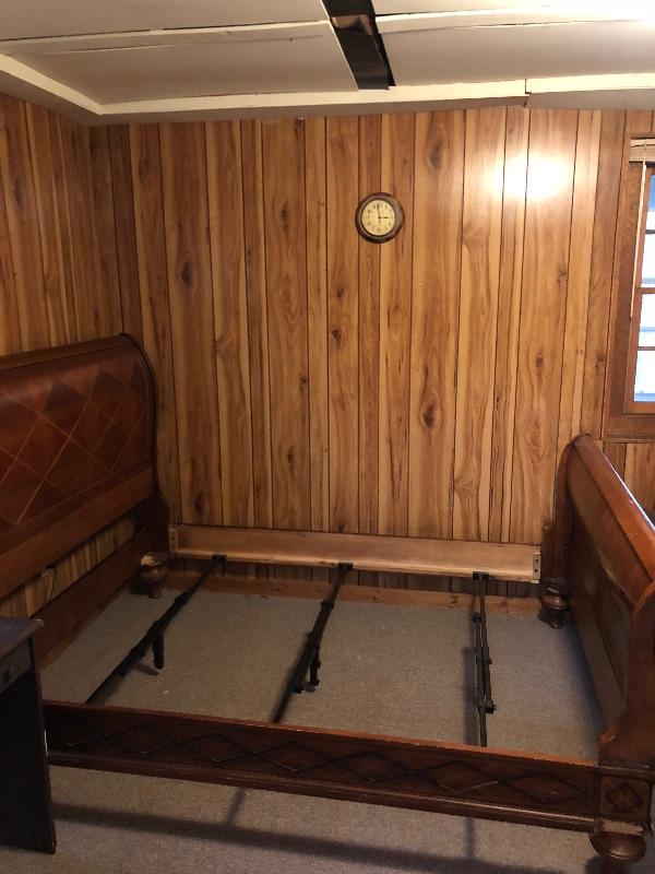 Do you want a bed that makes a statement? Here you go! Beautiful solid wood sleigh bed with rails. Bed has nice diamond design on headboard and side rails. Foot board corners near feet are in need of sanding and rails show wear. The rails have some missing pieces of the black diamond designs of the diamonds, would be an easy fix for a wood worker, or easily covered up by either black polish or a long comforter. Bed comes with a 3 pc metal frame that screws into side rails. Queen mattress box springs not included. Headboard is approximately 64.5” x 58”. Headboard and footboard both have some wear or scratches shown in images, it appears they can easily be covered up. One rail hardware appears stuck in the headboard, but bed appeared sturdy when fully assembled. Local pick up only.