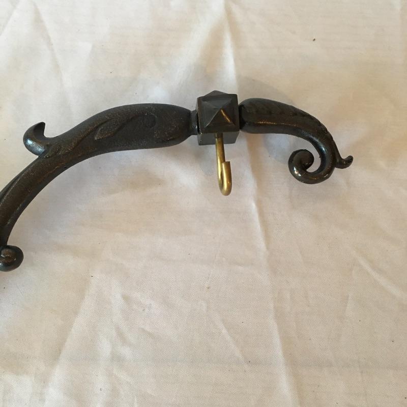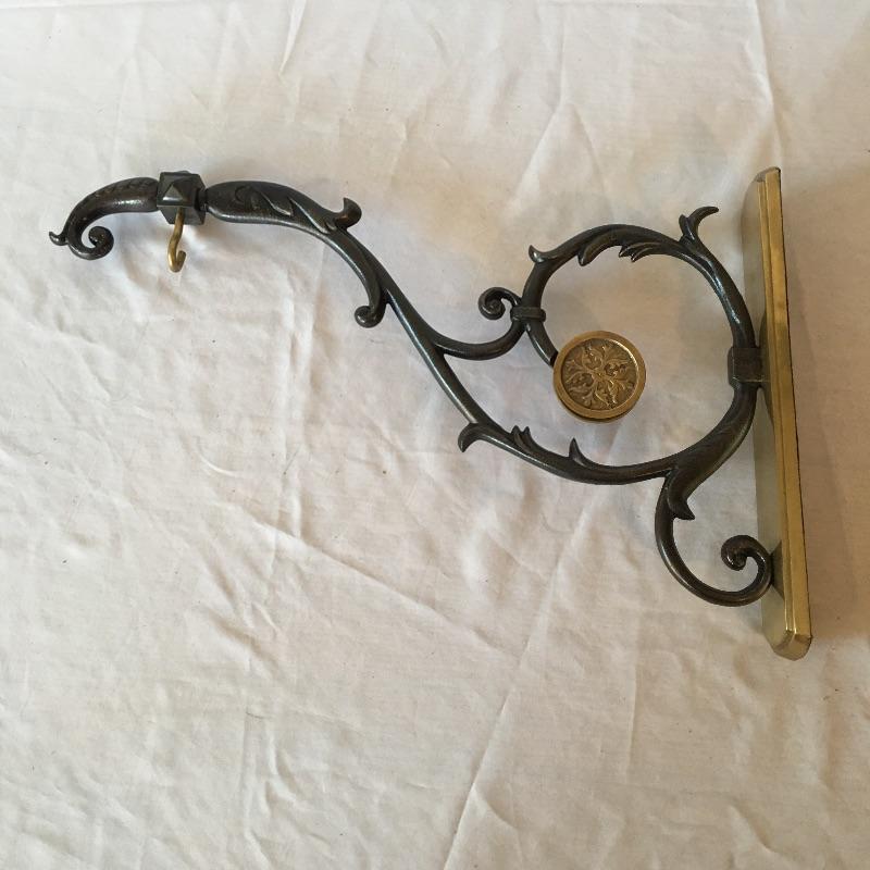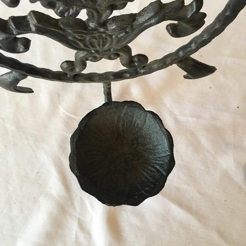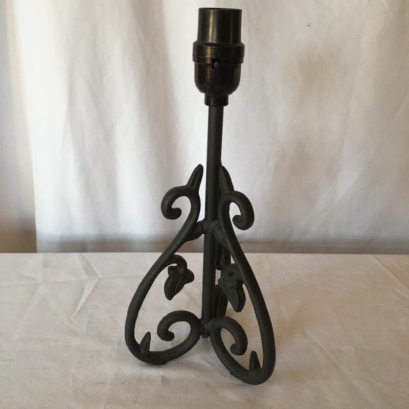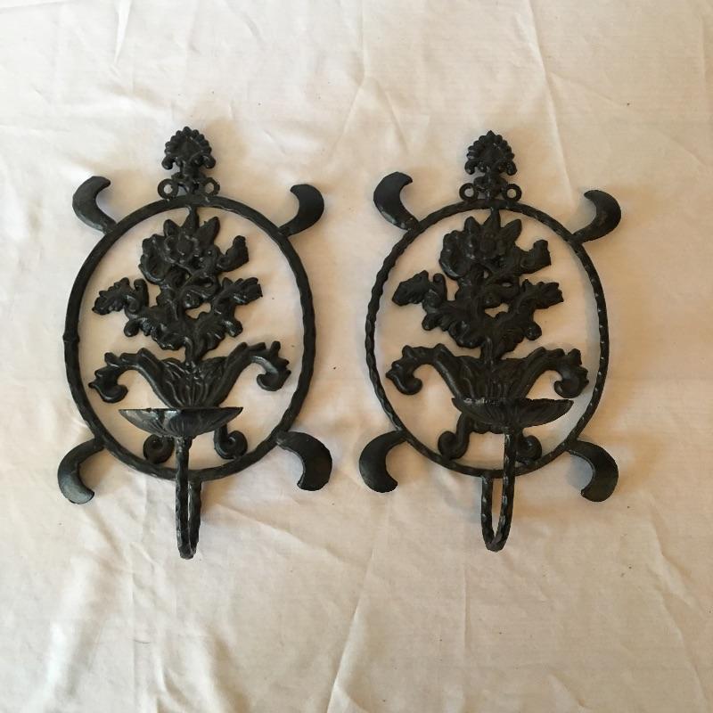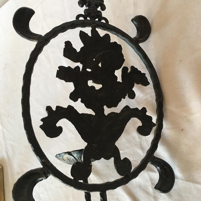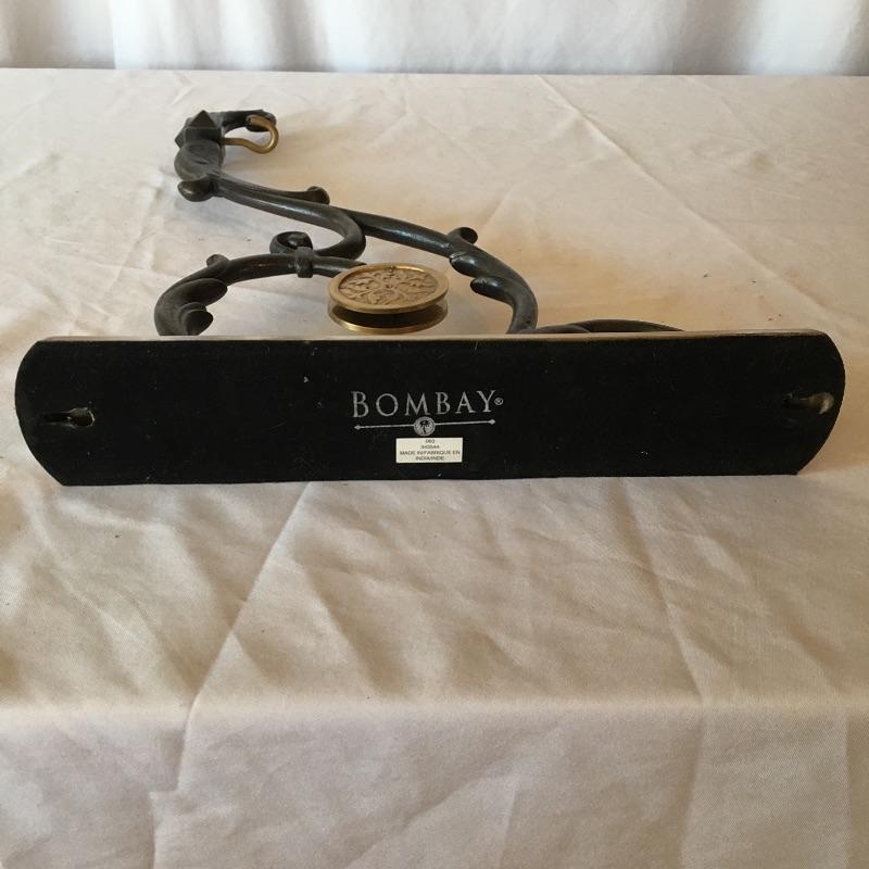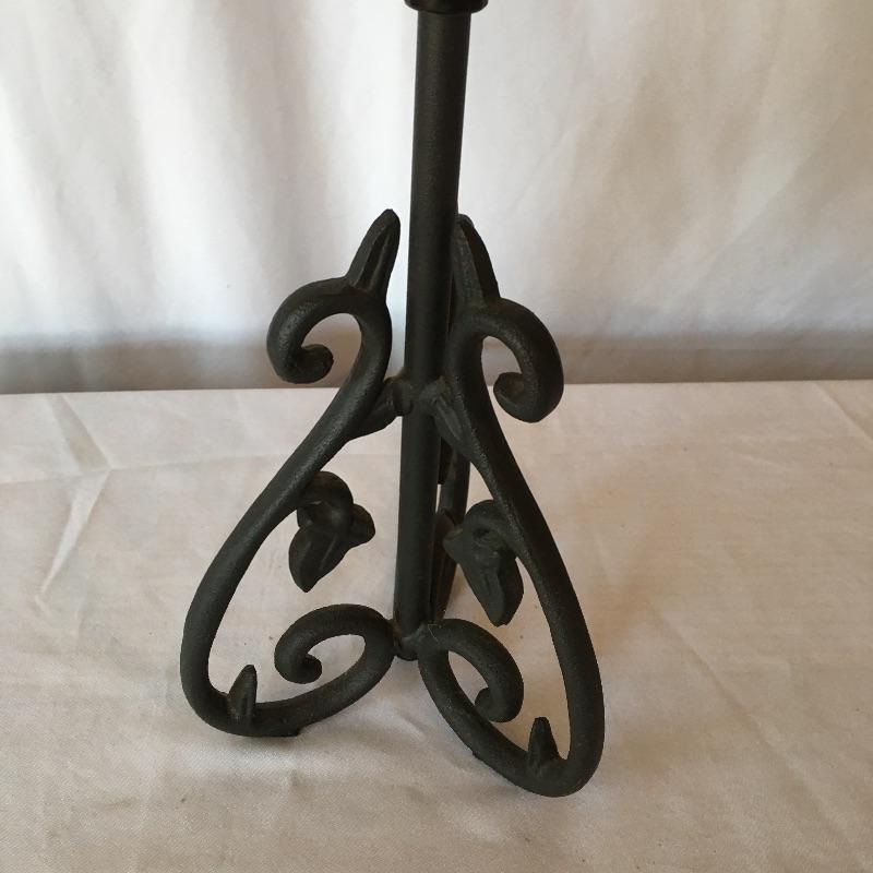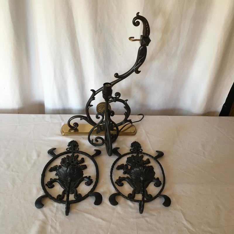 This is a nice array of wrought iron that includes a pair of candle holders, table lamp and a Bombay sign holder. Sign holder measures 2.75” x 14” x 22”. Lamp worked when tested and will require a new shade.