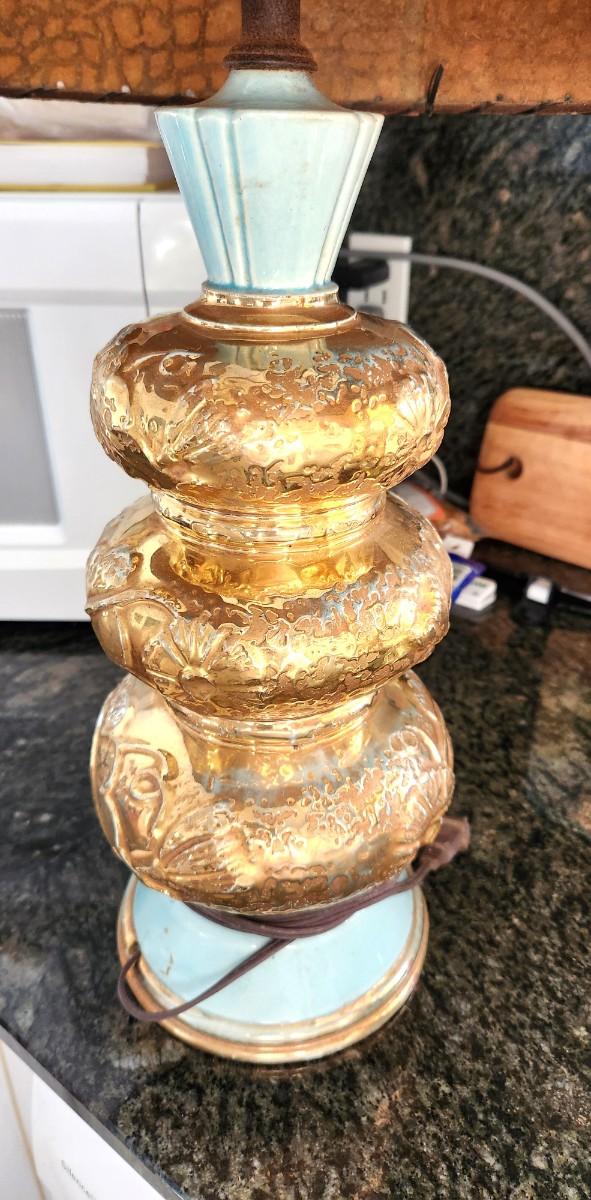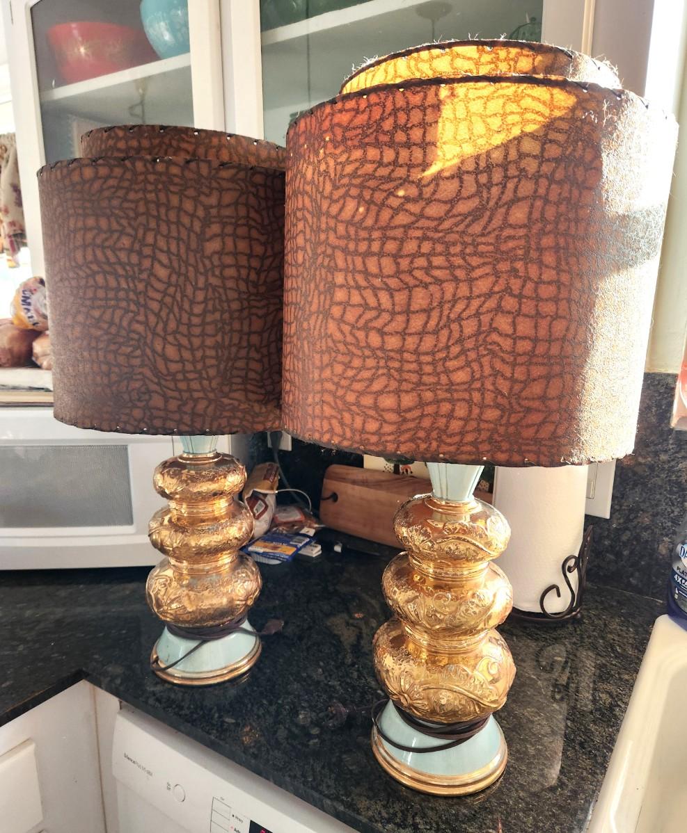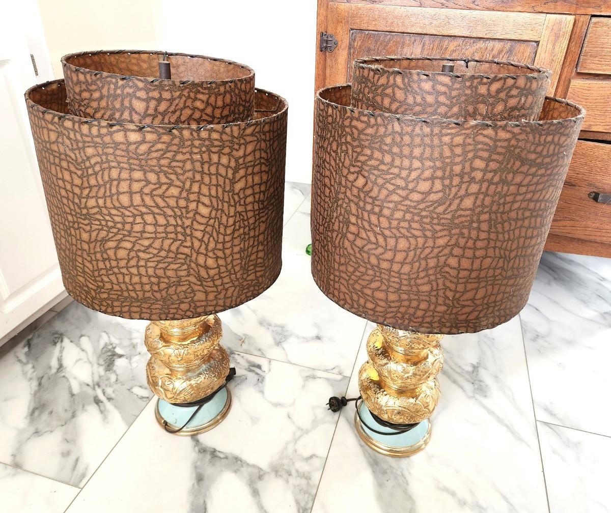 These 1950's/60s lamps SCREAM Mid-Century - and they even have the original fiber glass shades! Both in working condition - looks like one has been rewired at some point. Each stands about 28" tall. Very good vintage condition. Aqua blue ceramic covered in "weeping gold" - they are a KILLER. Very difficult to find a matched pair.