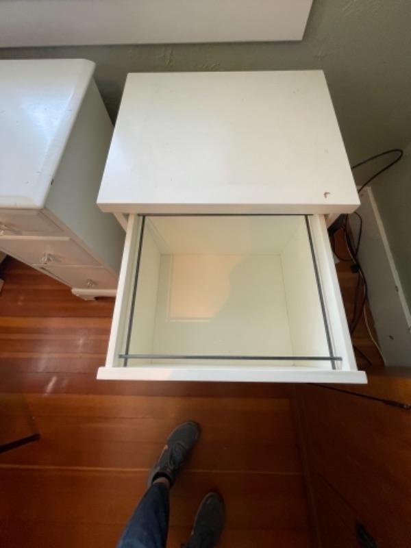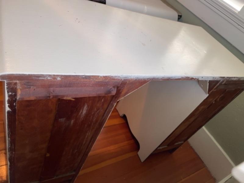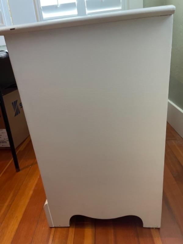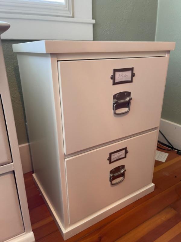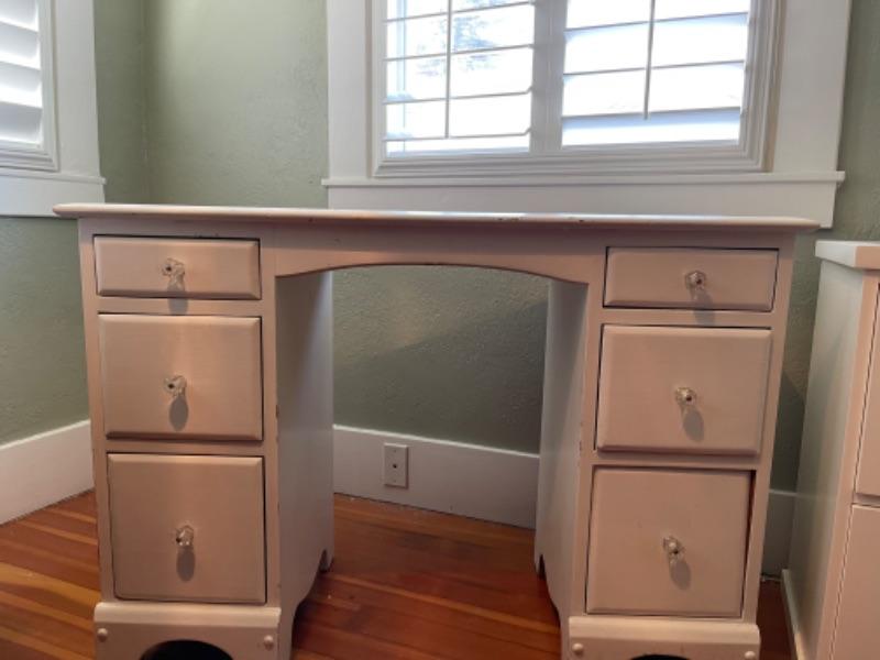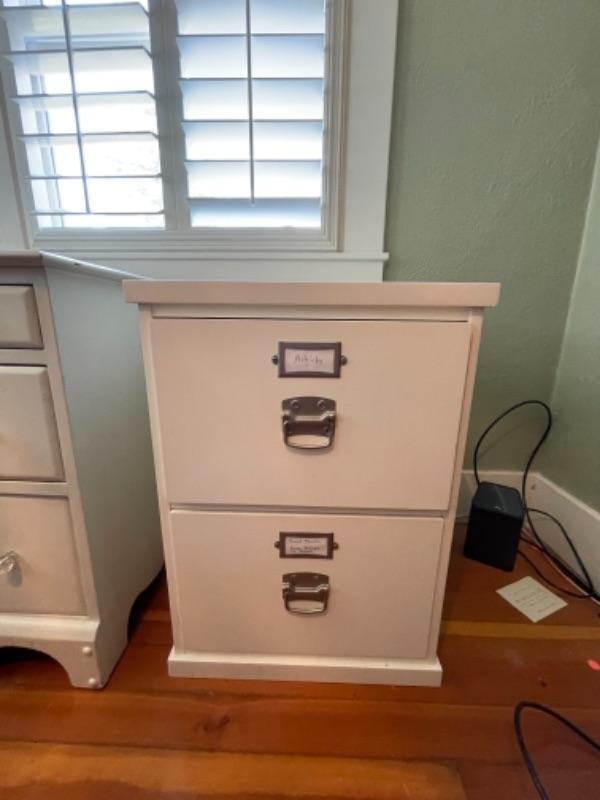 Lot 142OF. Vintage painted desk (42”W x 18”D x 30”H) with filing cabinet (20”T x 20-1/2”L x 17”D)--$45
