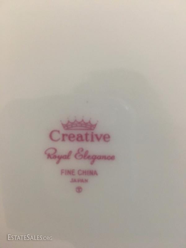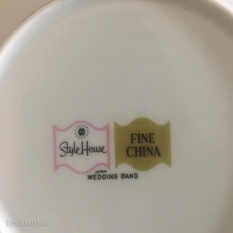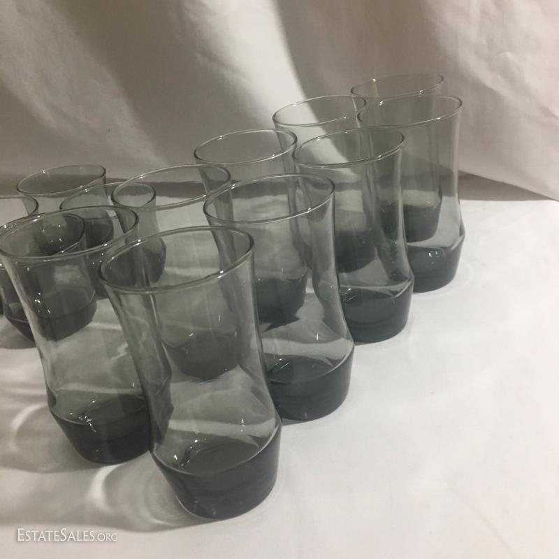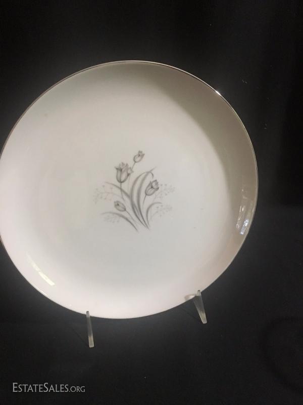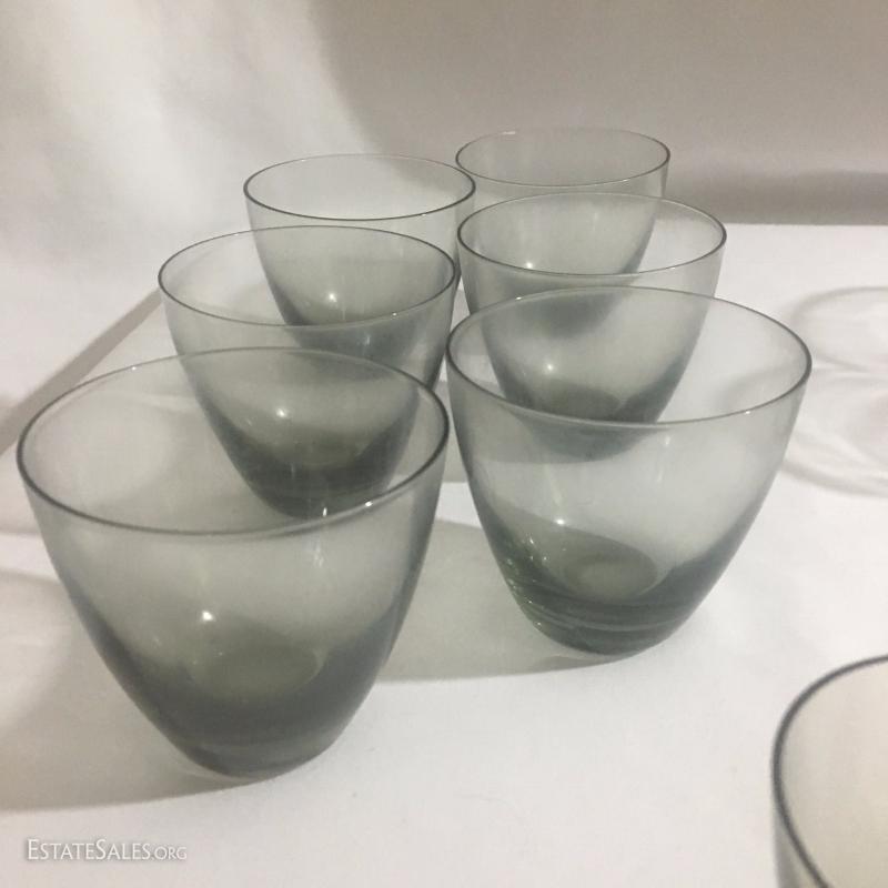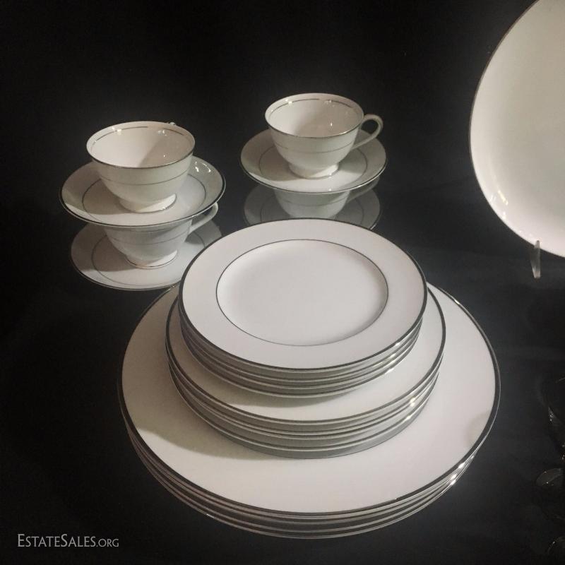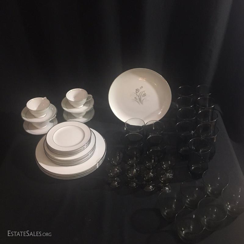 20 piece China set by Style House. Wedding Band. Tiny chips on sides of a few plates. 1 Serving Plate by Creative Royal Elegance. 27 drinking glasses in Smokey grey color. See photos.