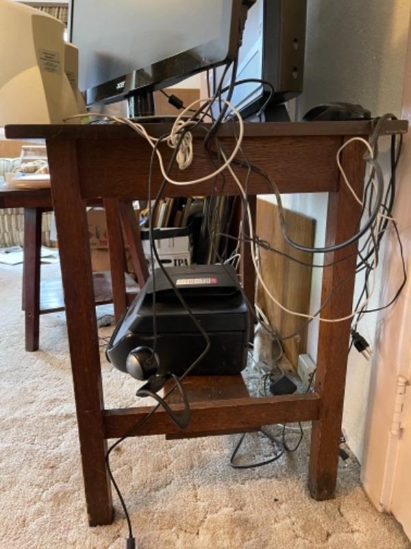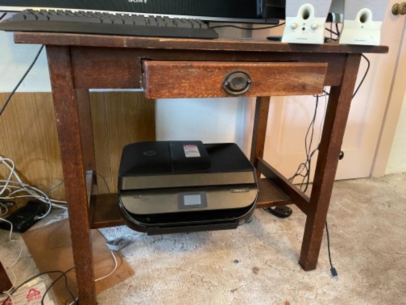 Lot 143. 46-inch Sony flat-screen television, wall clock, monitor, keyboard, speakers HP Office Jet 5255, mouse, camera, Mission style table (34”L x 24” W x 30”H); square swivel table 23,5” square (24”H)--$85