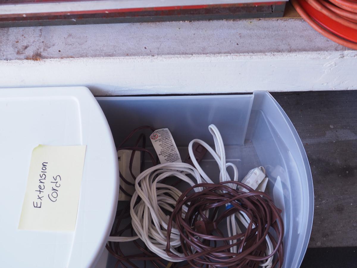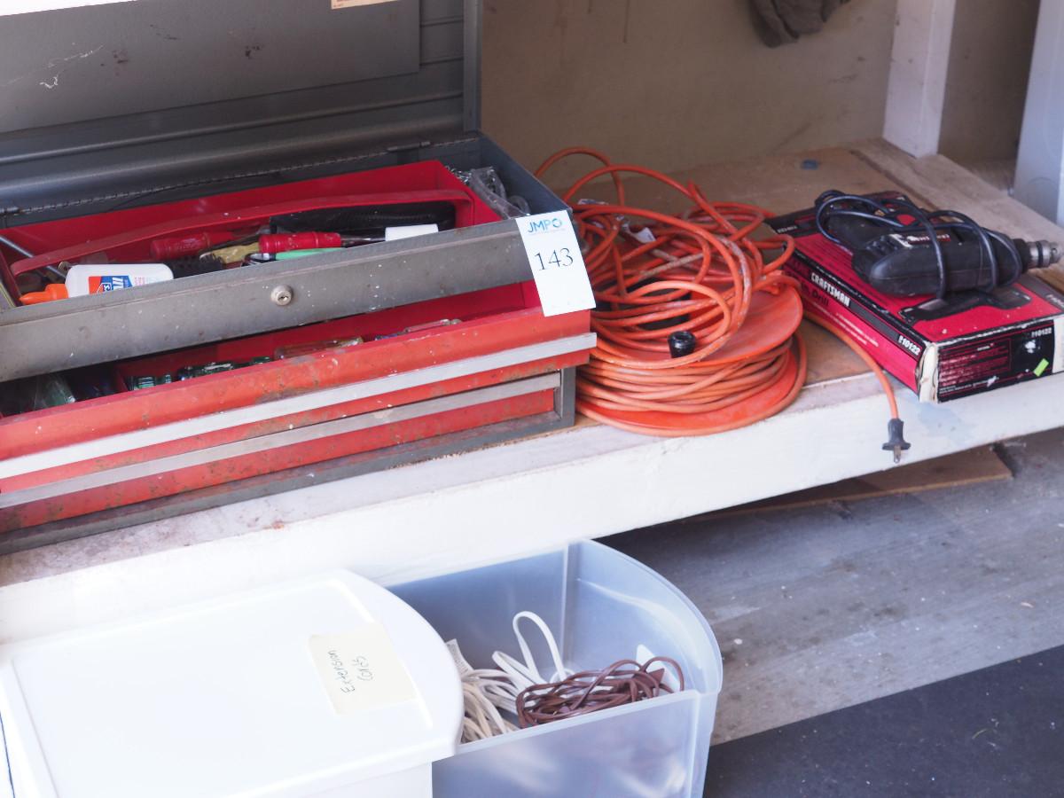 Lot 143 Craftsman vintage tool chest, tools, extension cords plastic bin, lower shelf work bench contents