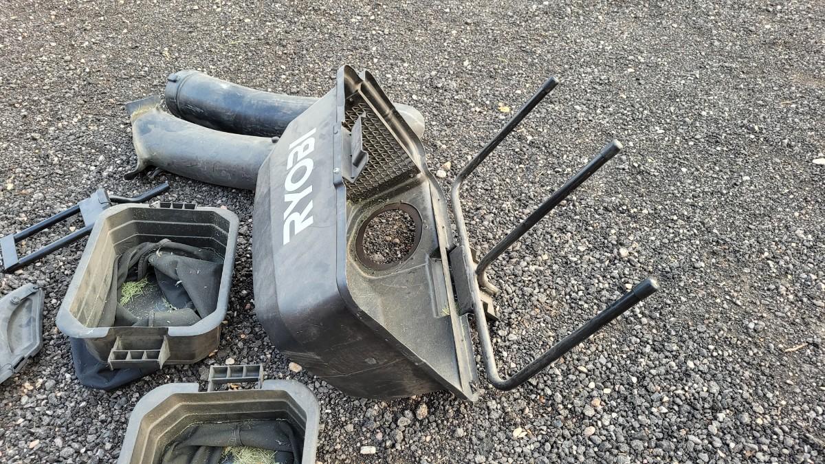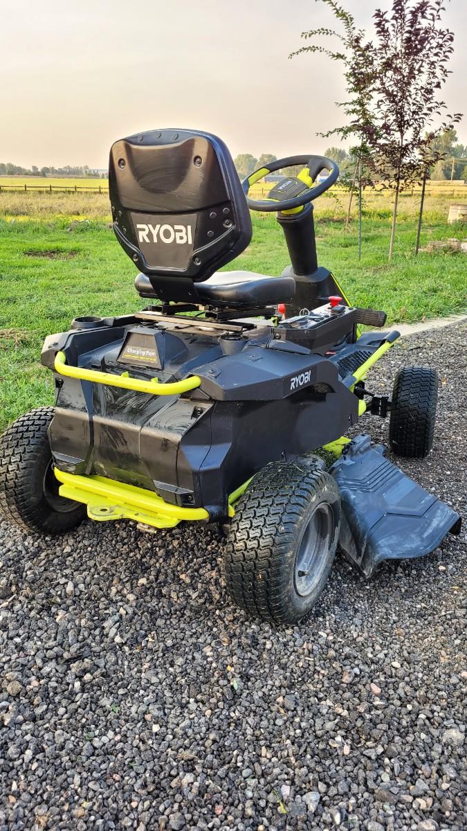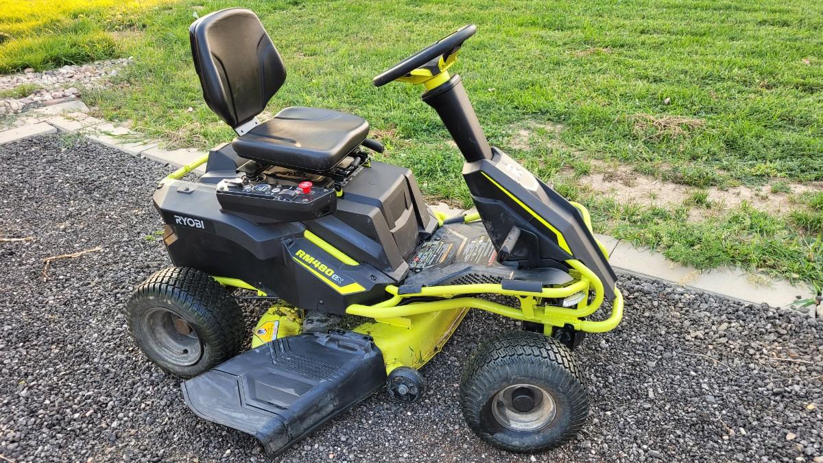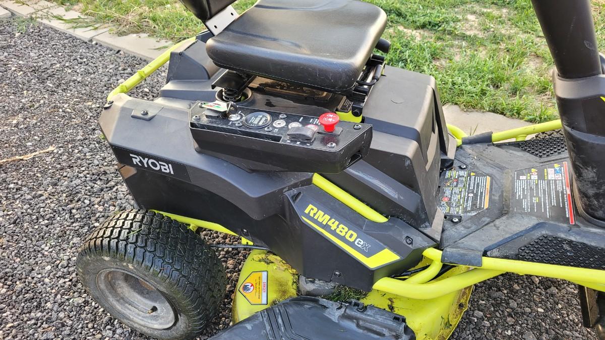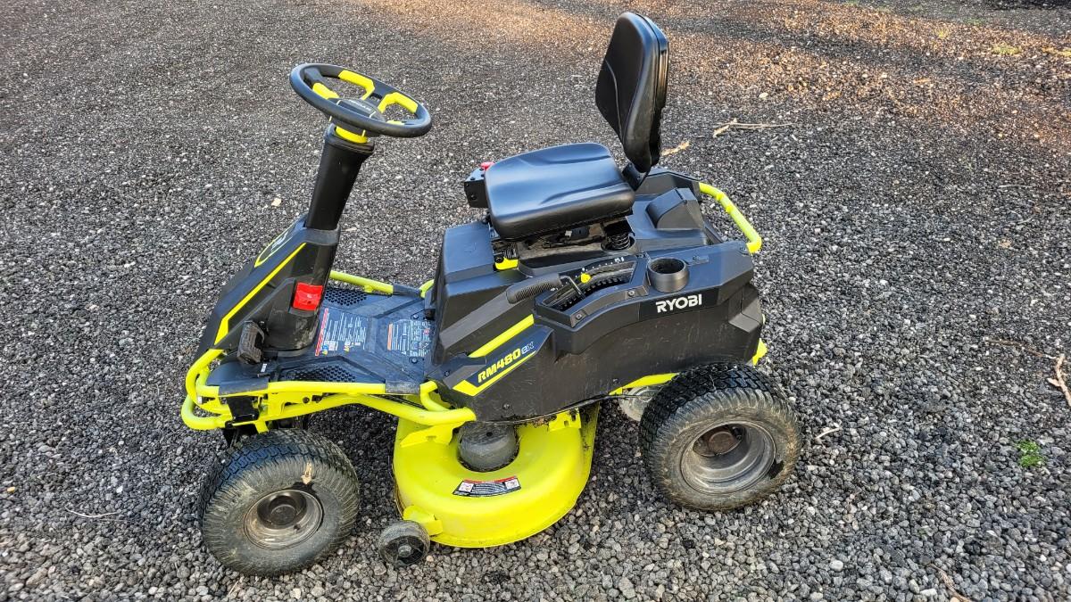 Lot 143: RYOBI RM480EX Electric Riding Lawnmower w/ Collection System and Charger COMPLETE & TESTED A+