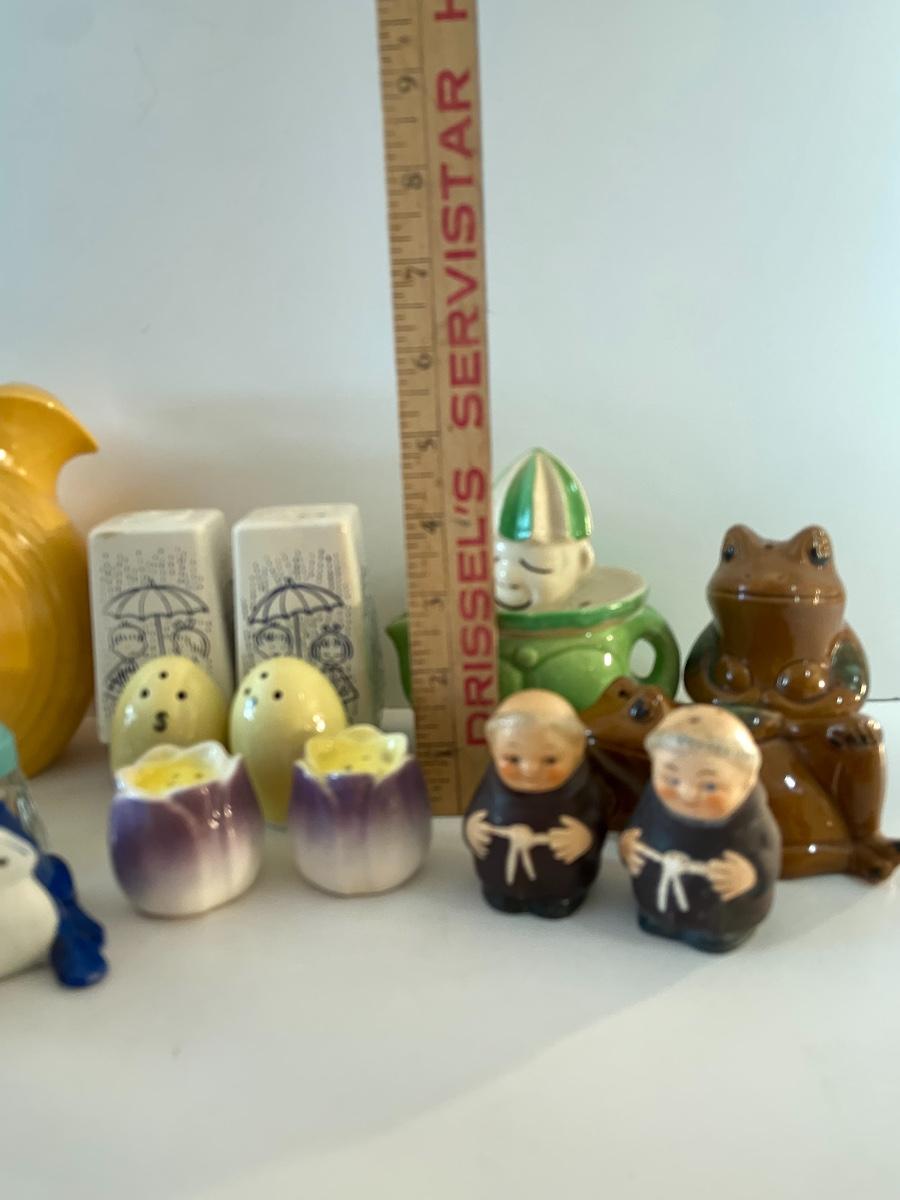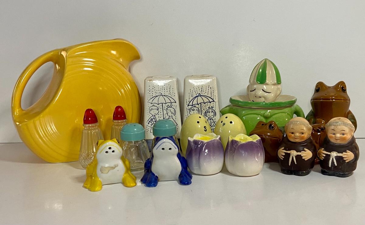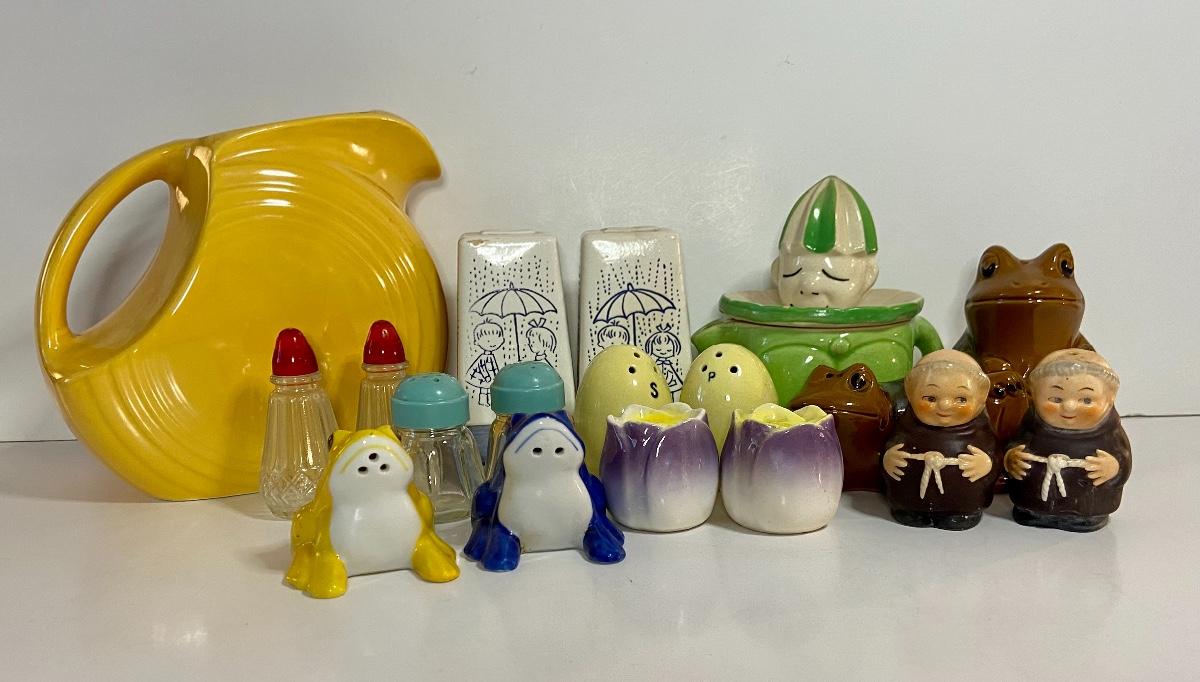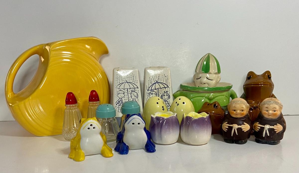 Excellent lot of collectibles including vintage Howard Holt salt and pepper set with umbrellas, vintage Japan salt/pepper sets, a juicer, and yellow Fiesta Pitcher. Please see all pictures as they are the best representation of the items. The pictures show condition, measurements if taken, and what is included in the lot. Due to the large amount that we photograph and the time frame, we are not always able to take measurements. All items unless noted, are pre-owned and have been used. If you purchased furniture, you must bring help. We do not allow one person to carry large furniture out on their own. Bring help, tools and a truck for the safety of our client’s homes, and your personal safety. Company policy. Thank you.