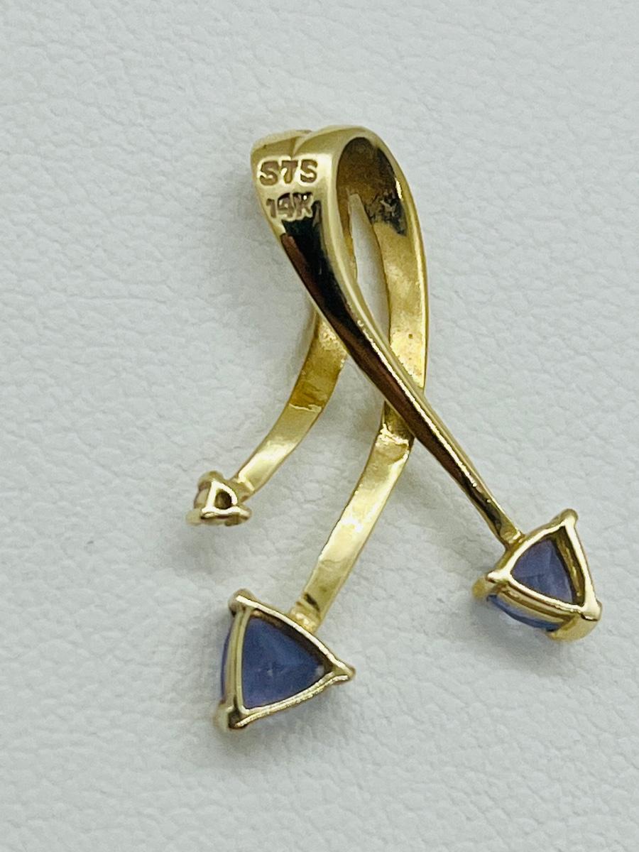 Lot 143: 14k STS Two Trillion Cut Tanzanites & Small Diamond Chip