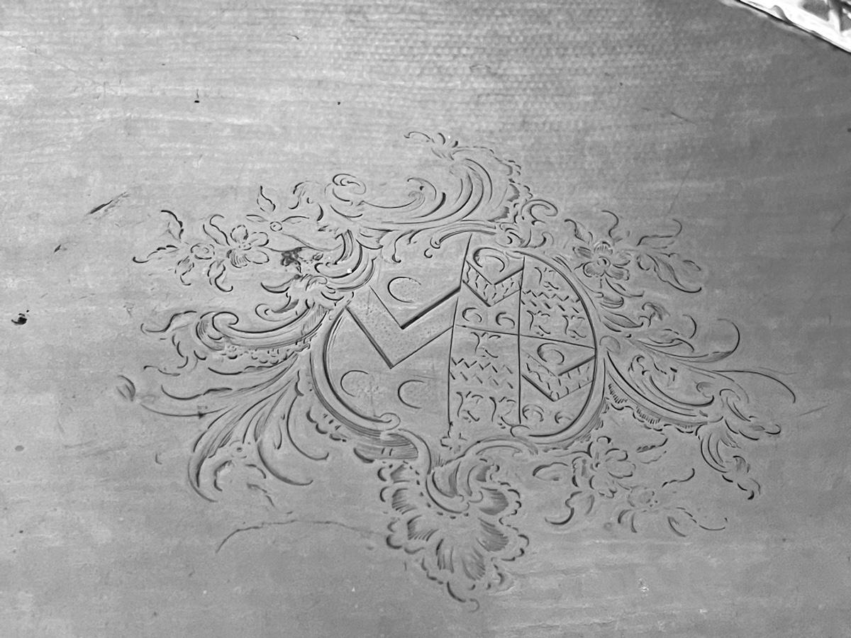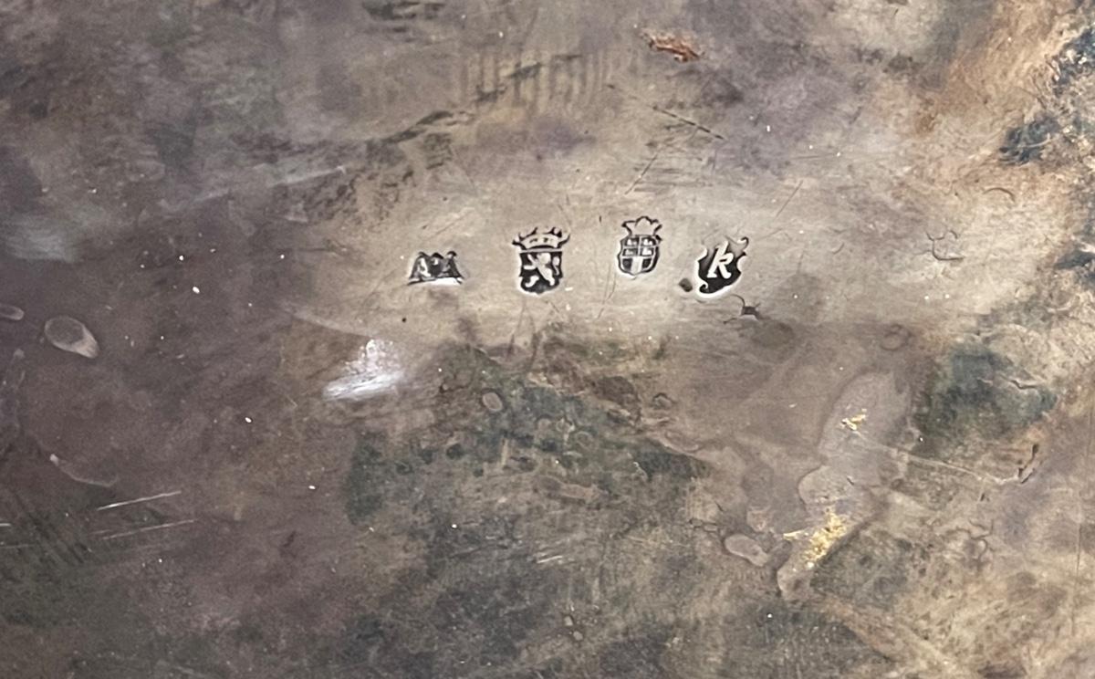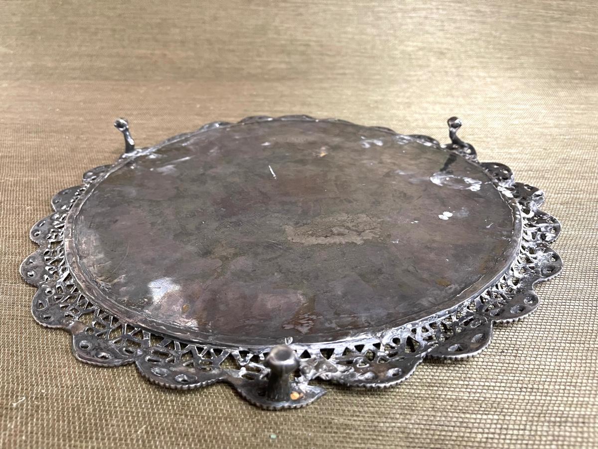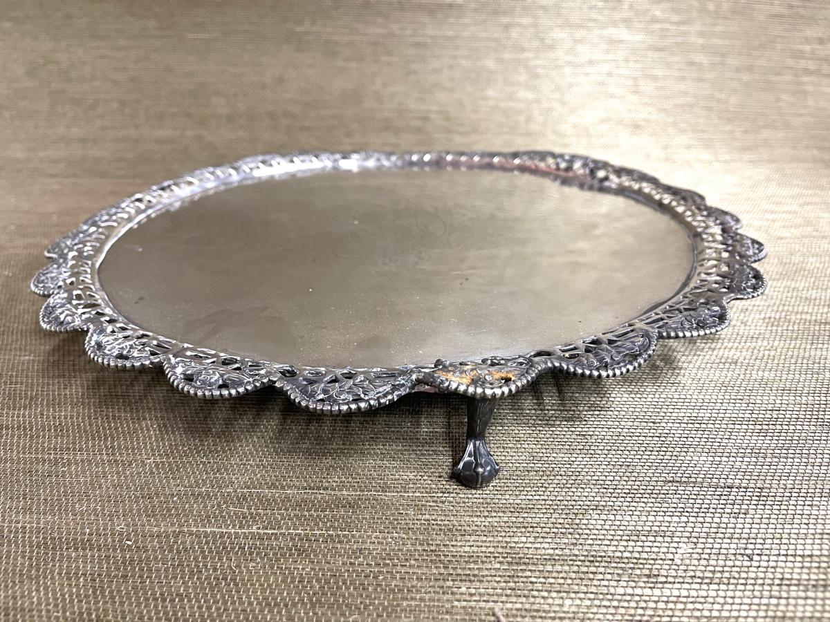 LOT 143 - Antique Silver Tray with Old Markings. It has some damage near one leg. Weight is around 1113 grams.. This item is part of the David-Pleydell-Bouverie Estate at Bouverie Ranch in Glen Ellen. This item can be viewed at our Green + Cate Showroom in Sebastopol from July 15th - July 18th between the hours of 9am-5pm. For the benefit of the Bouverie Preserve of Audubon Canyon Ranch.