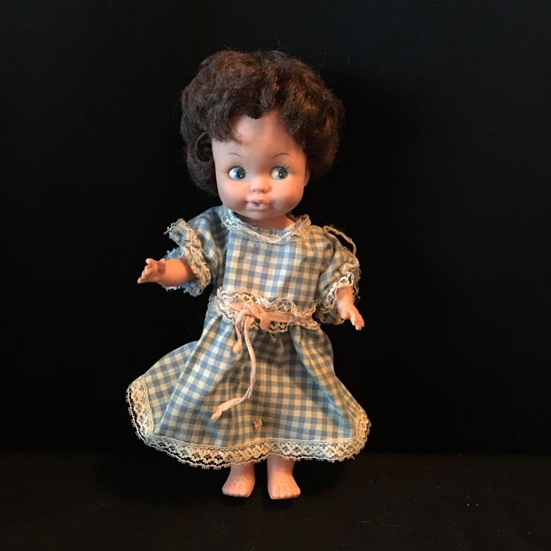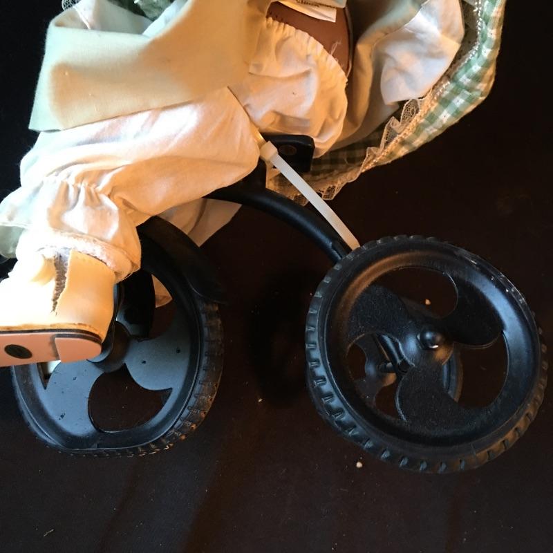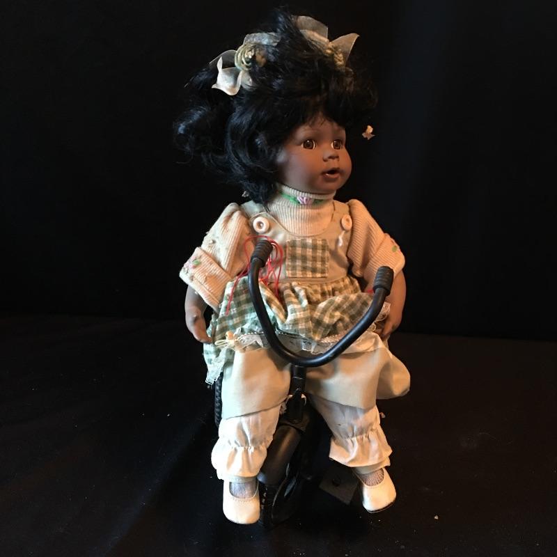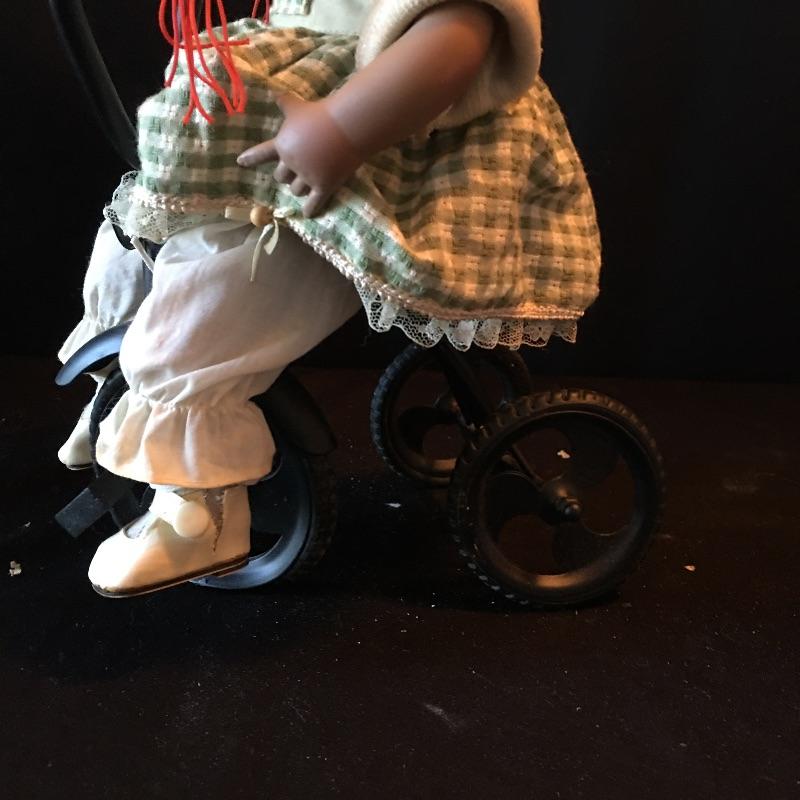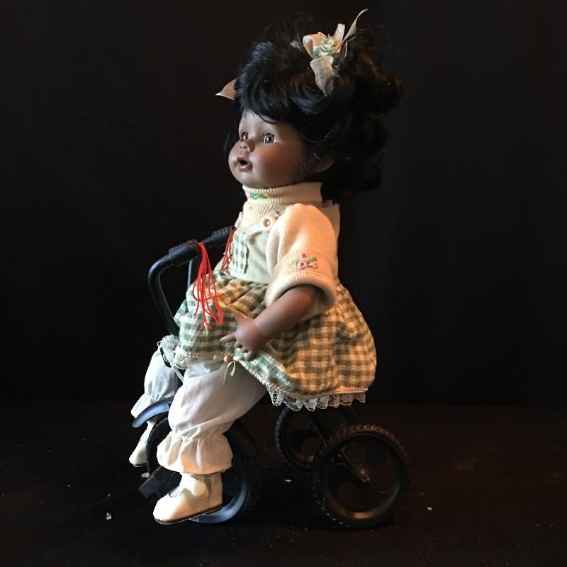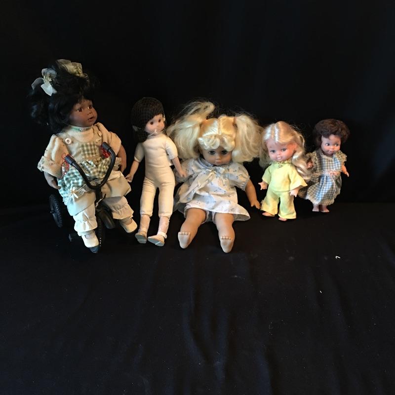 Array of dolls includes five dolls made in China. Porcelain doll on tricycle, doll that has eyes that open and close when upright or laying down and three smaller dolls. One is still has original hair net still on it. Doll and tricycle measure 8” x 9” x 15”.