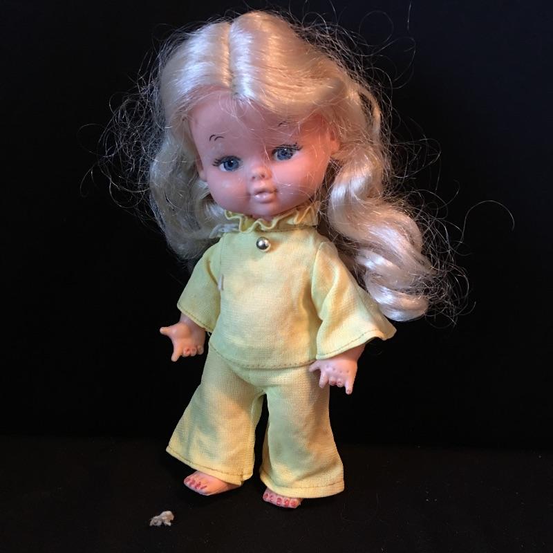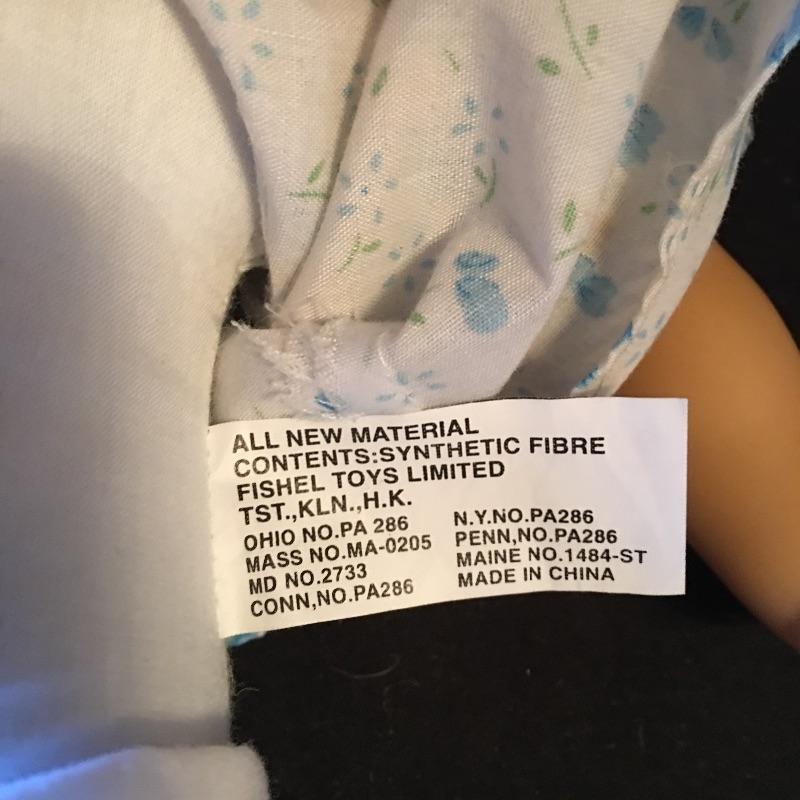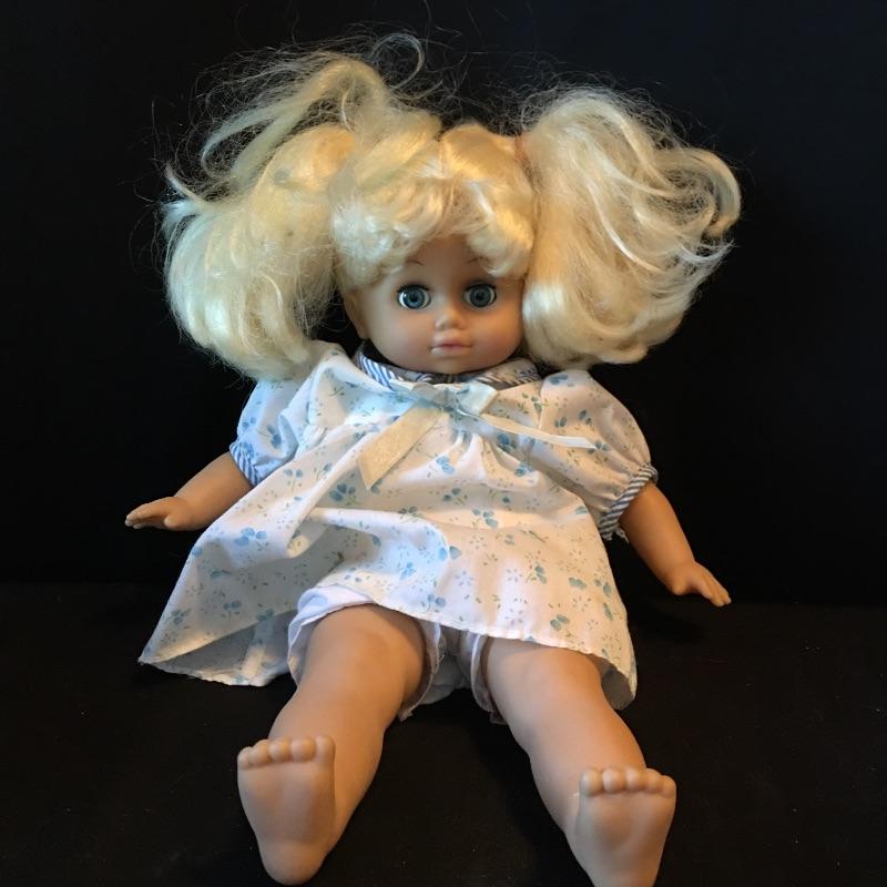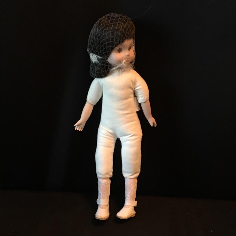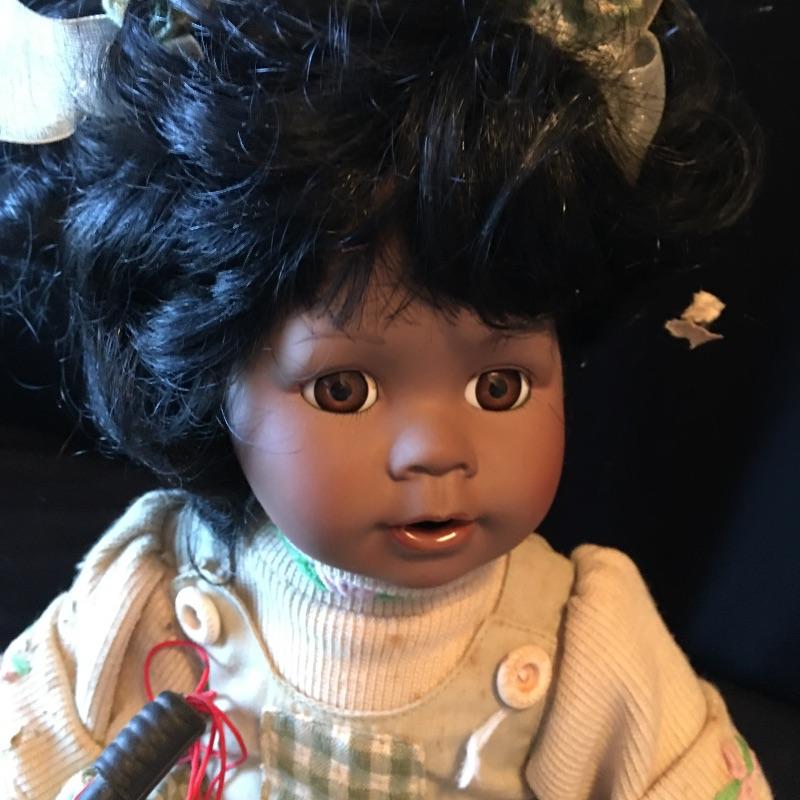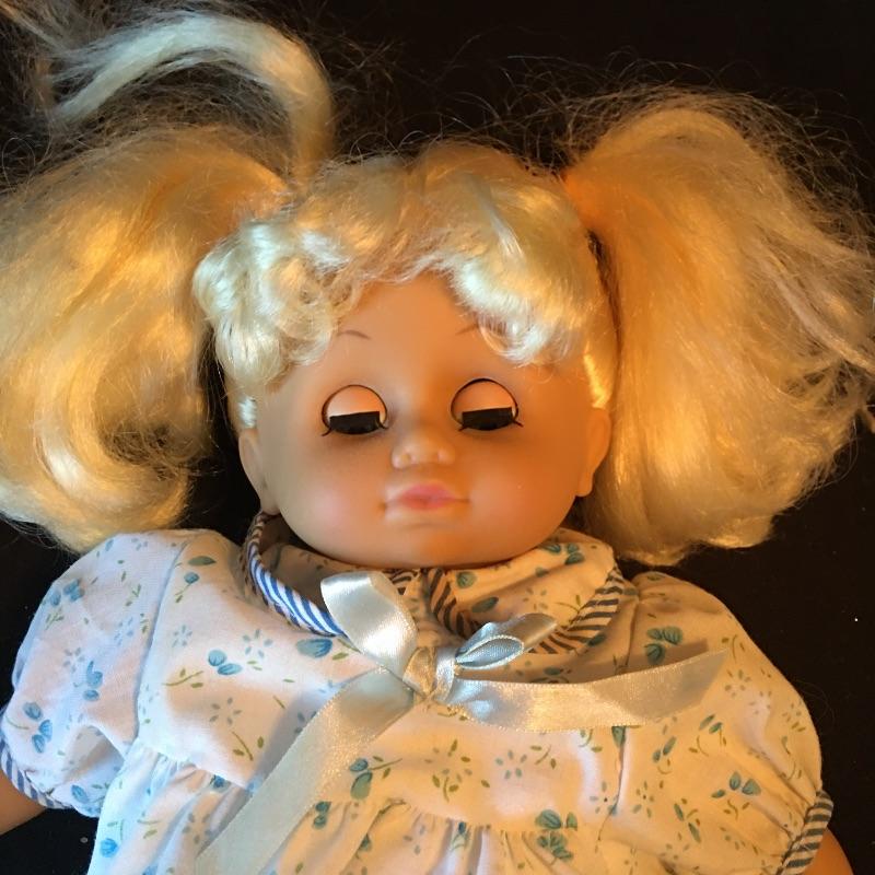 Array of dolls includes five dolls made in China. Porcelain doll on tricycle, doll that has eyes that open and close when upright or laying down and three smaller dolls. One is still has original hair net still on it. Doll and tricycle measure 8” x 9” x 15”.