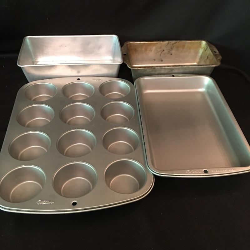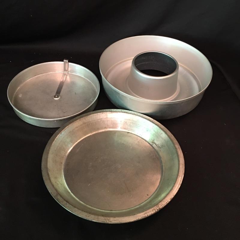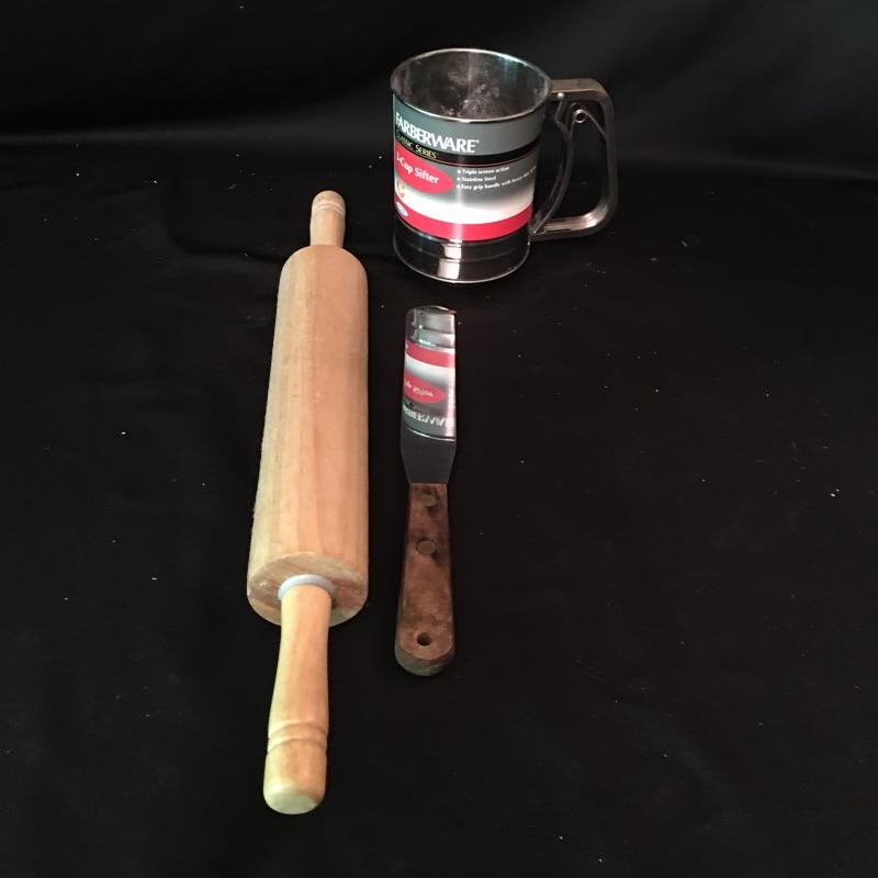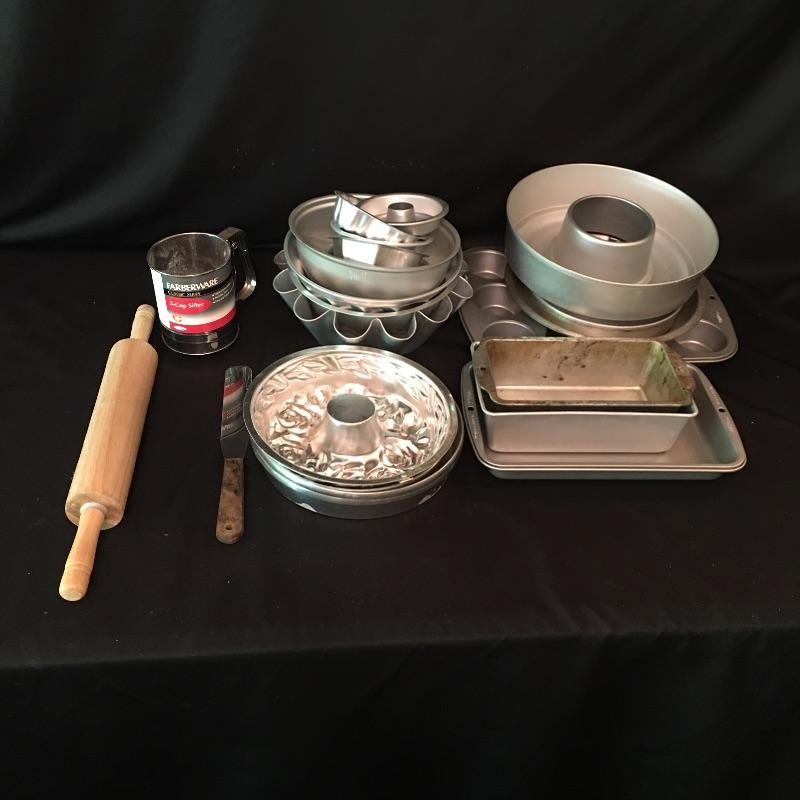 Baking Lot. Lot includes rolling pin, flour sifter. Bread pans, cake pans, small molds and more.