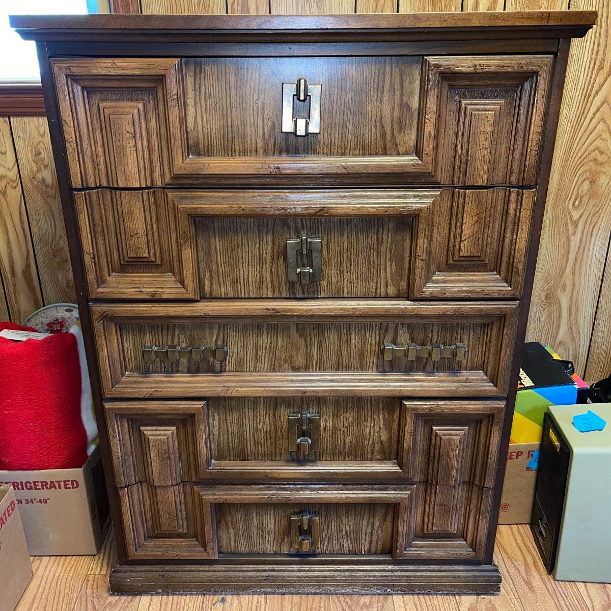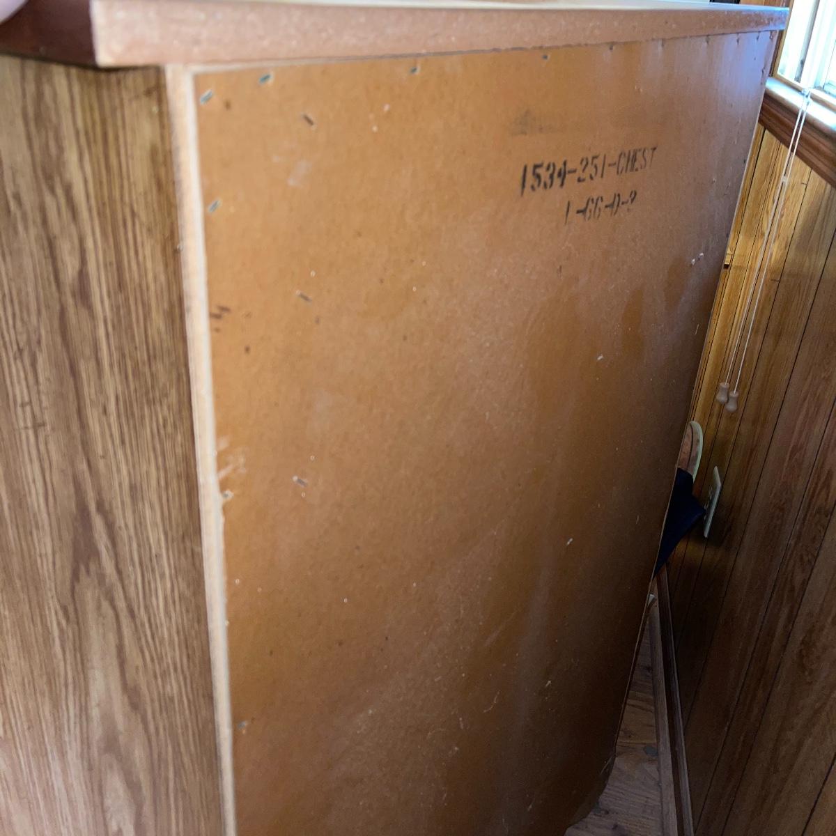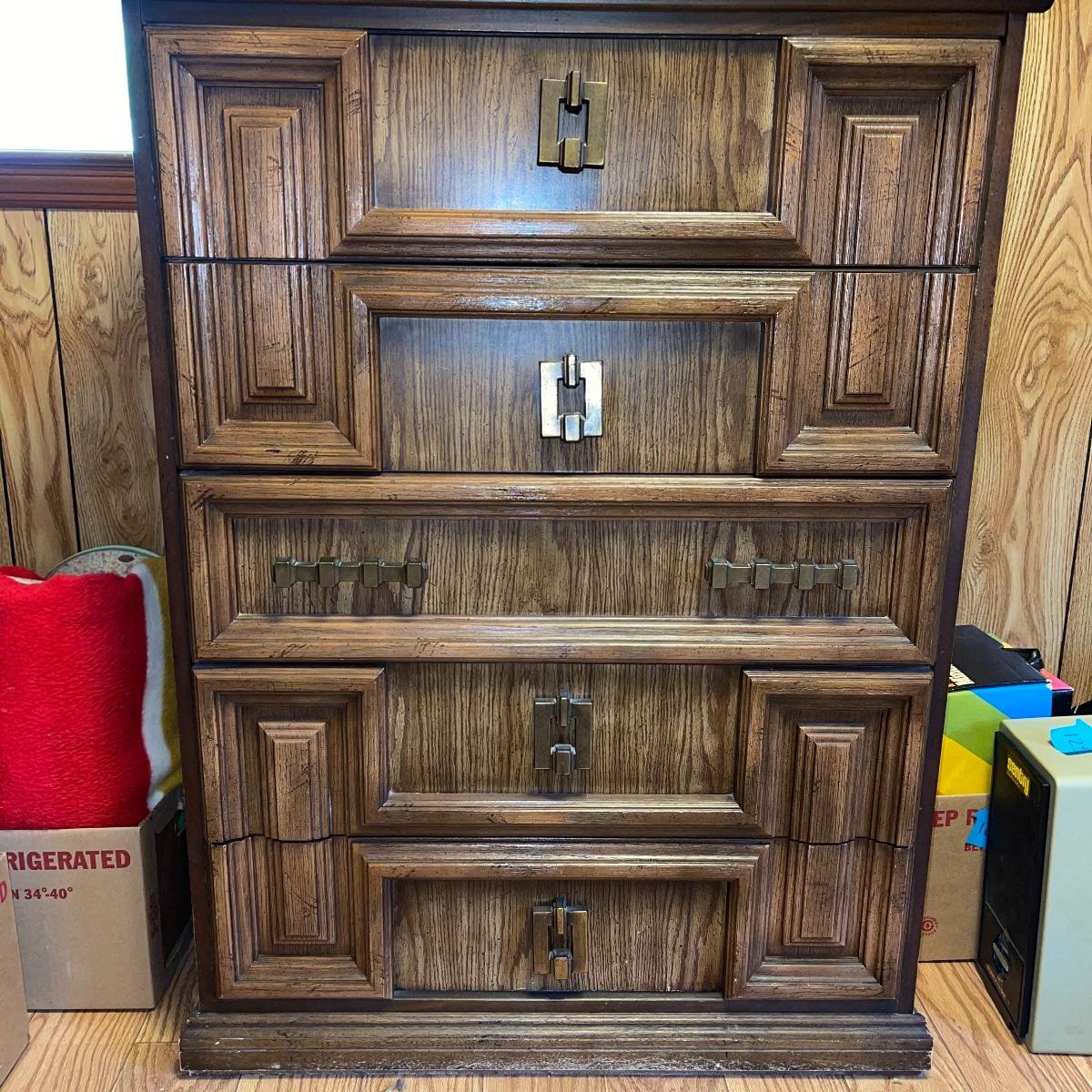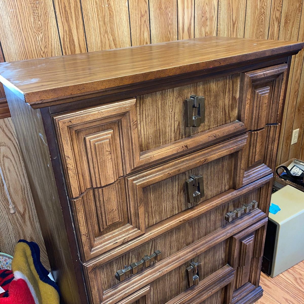 Matching full sized bed frame and five drawer dresser. The dresser is 36 inches long, 18 inches wide, and 48.5 inches tall. On top of the dresser there are mild paint/scuff marks.