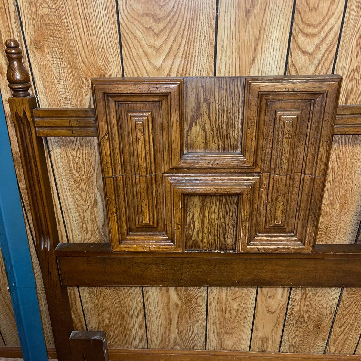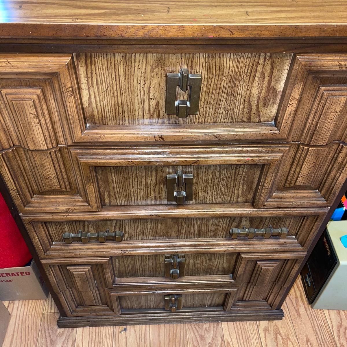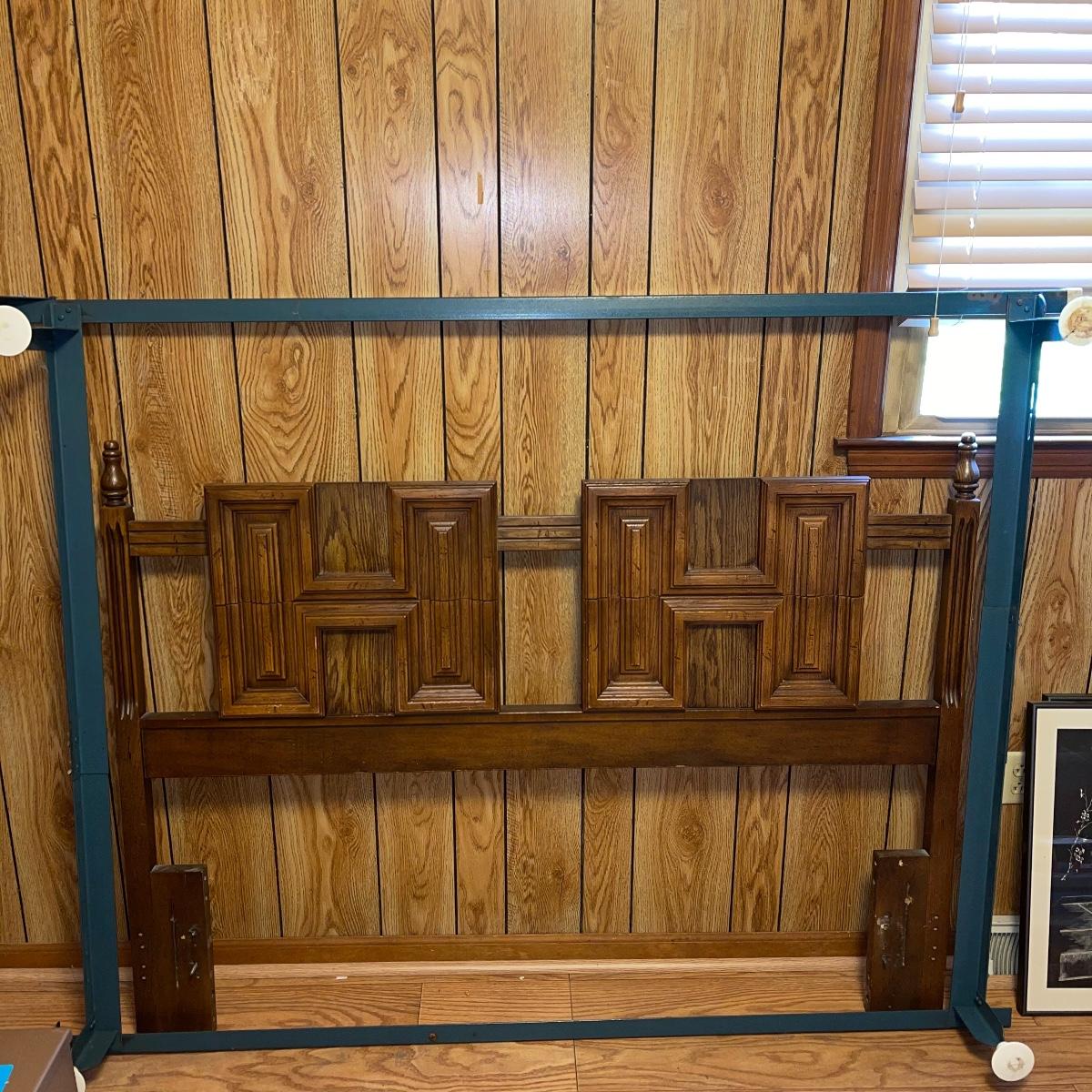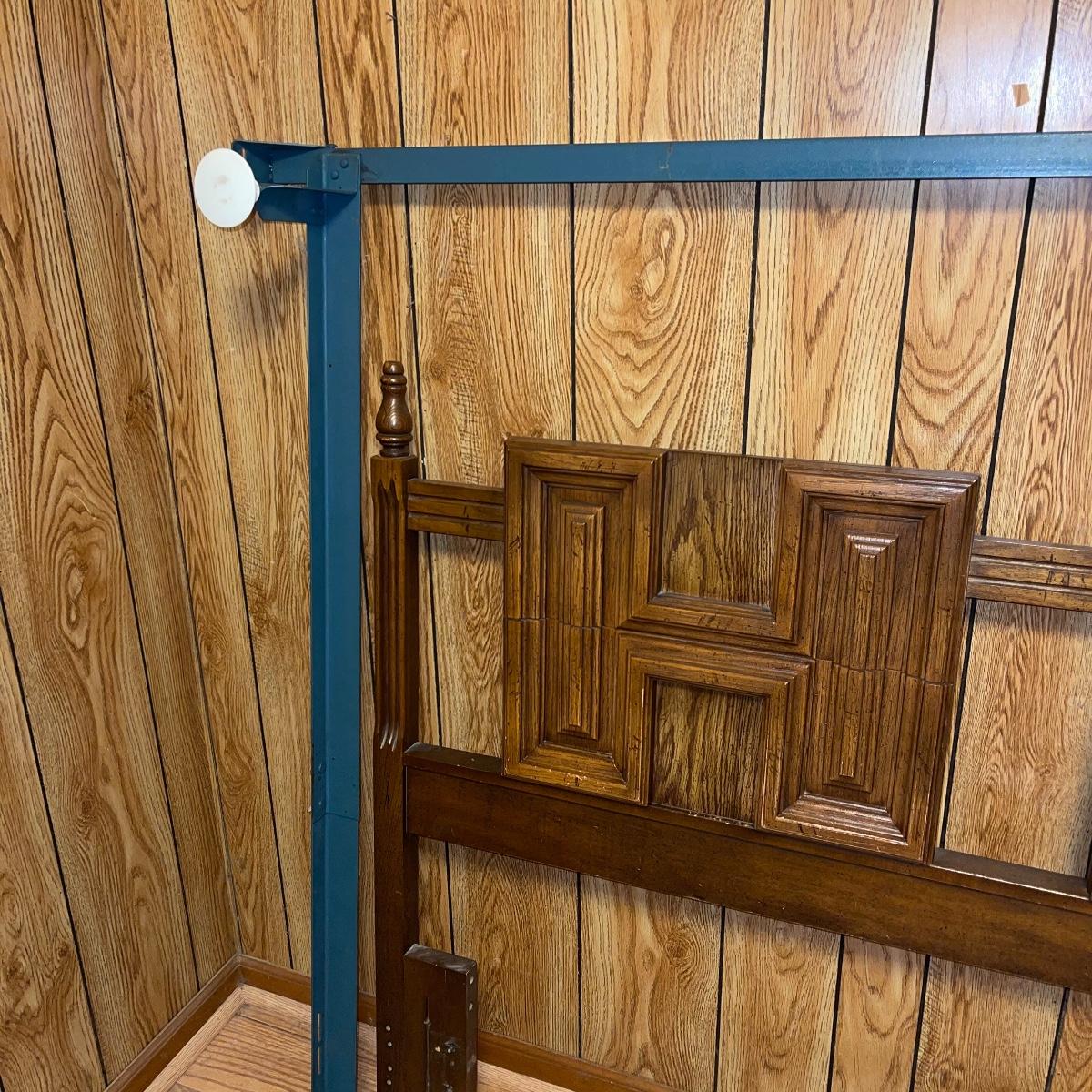 Matching full sized bed frame and five drawer dresser. The dresser is 36 inches long, 18 inches wide, and 48.5 inches tall. On top of the dresser there are mild paint/scuff marks.