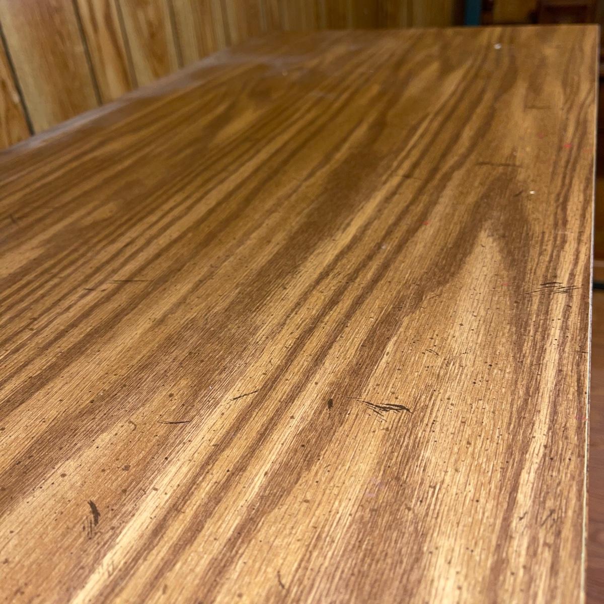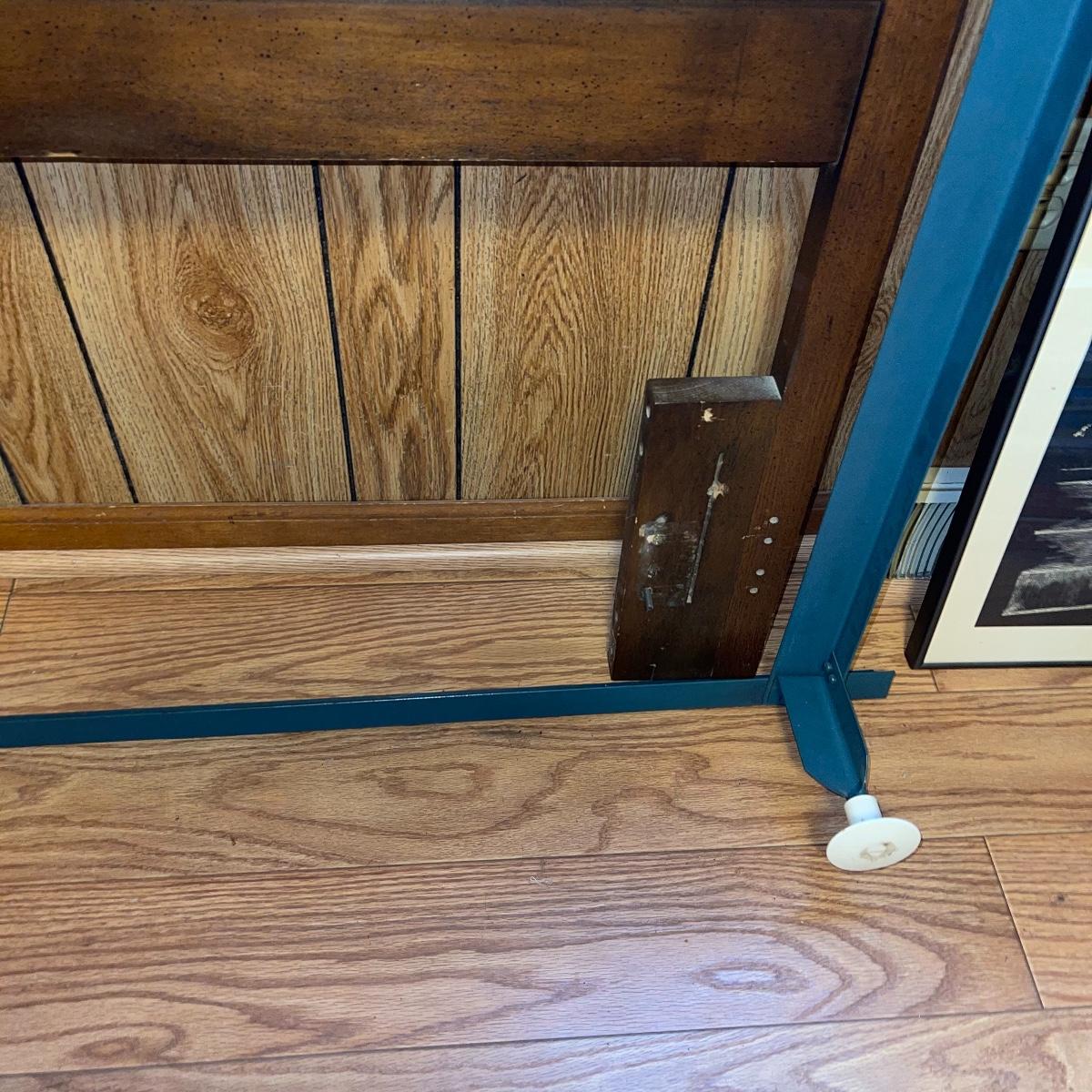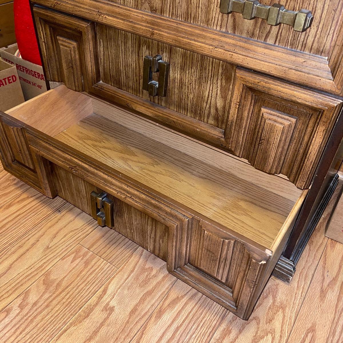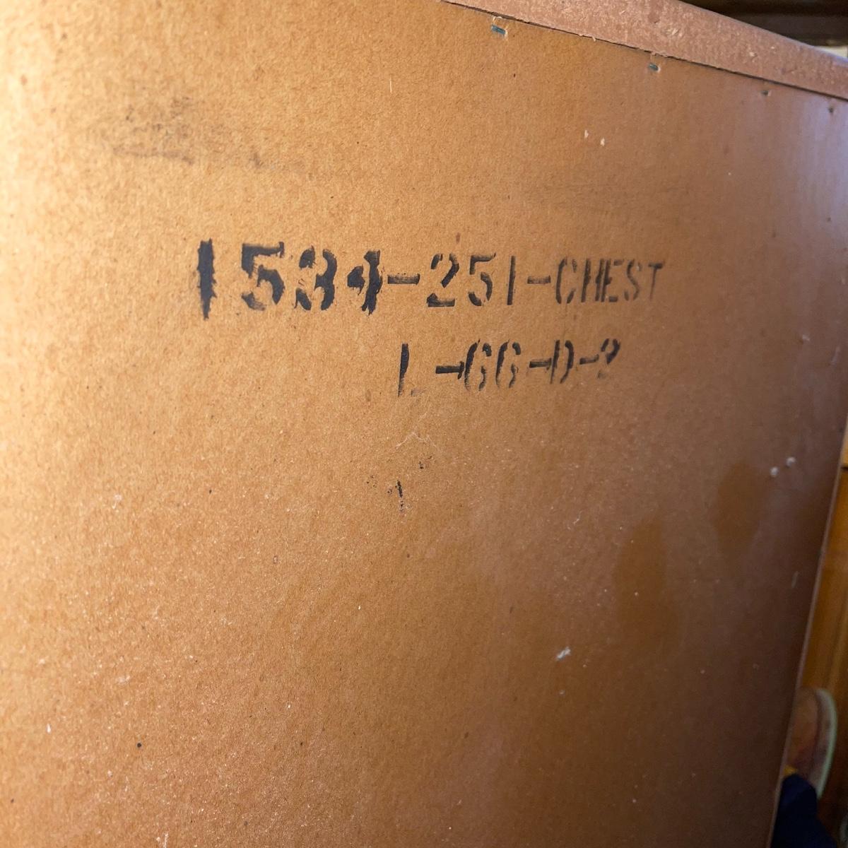 Matching full sized bed frame and five drawer dresser. The dresser is 36 inches long, 18 inches wide, and 48.5 inches tall. On top of the dresser there are mild paint/scuff marks.
