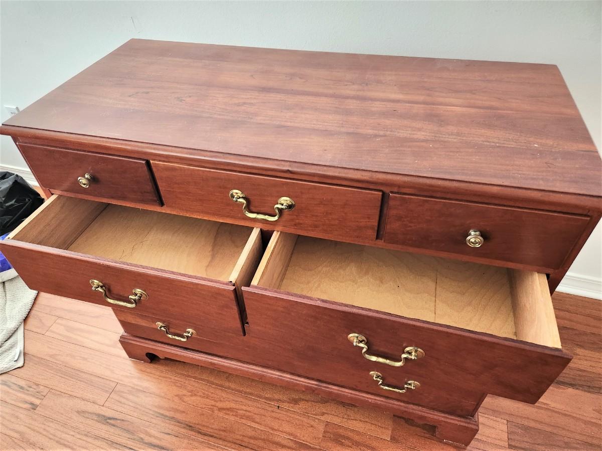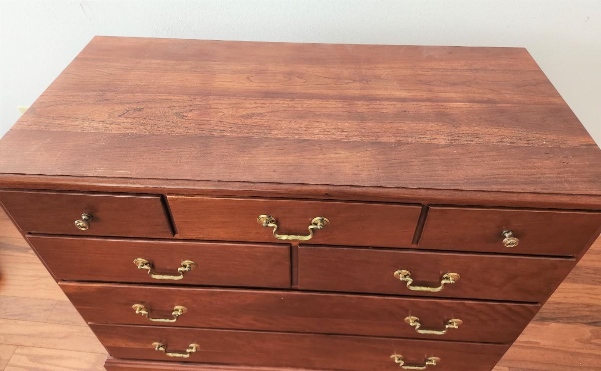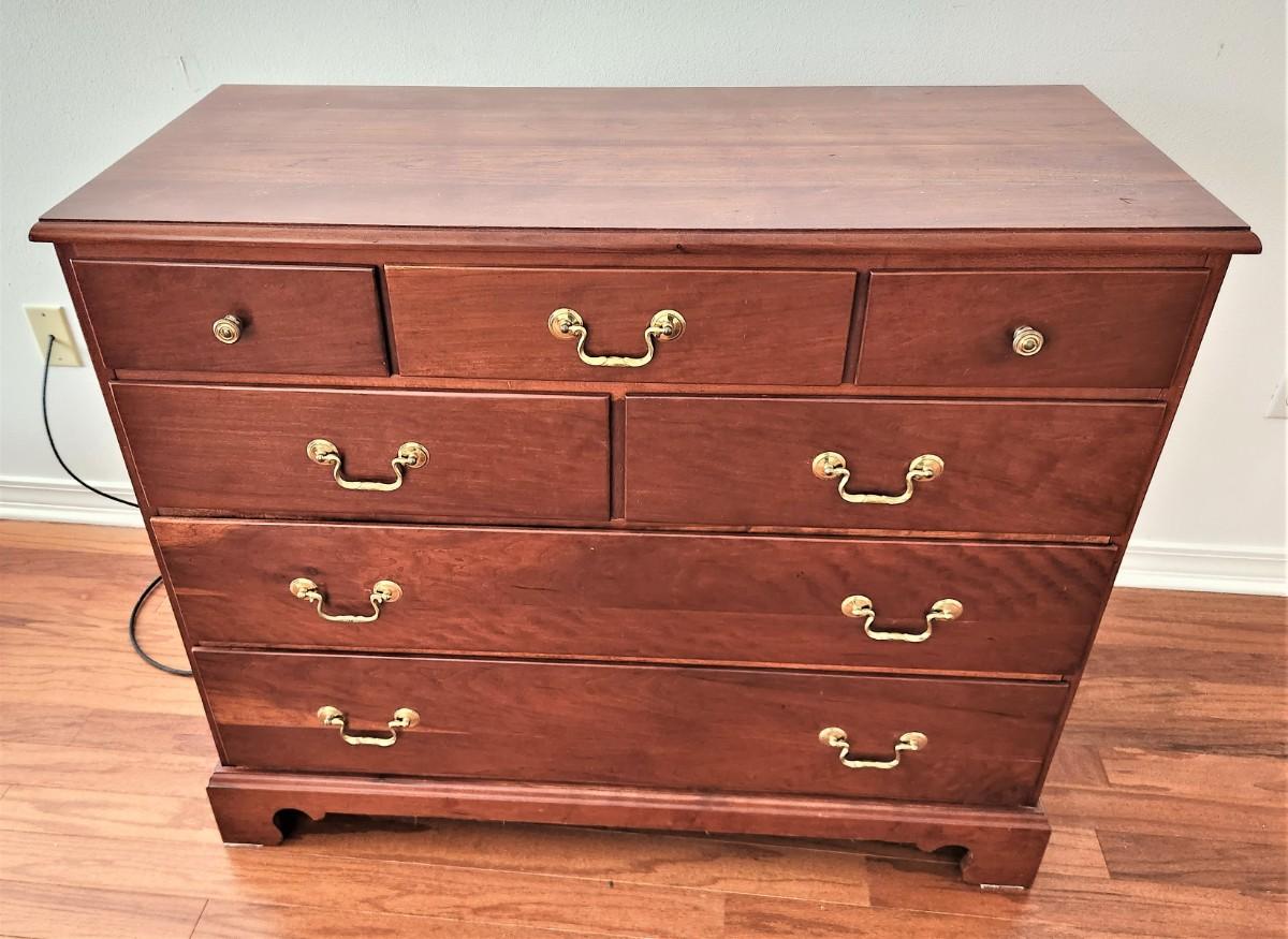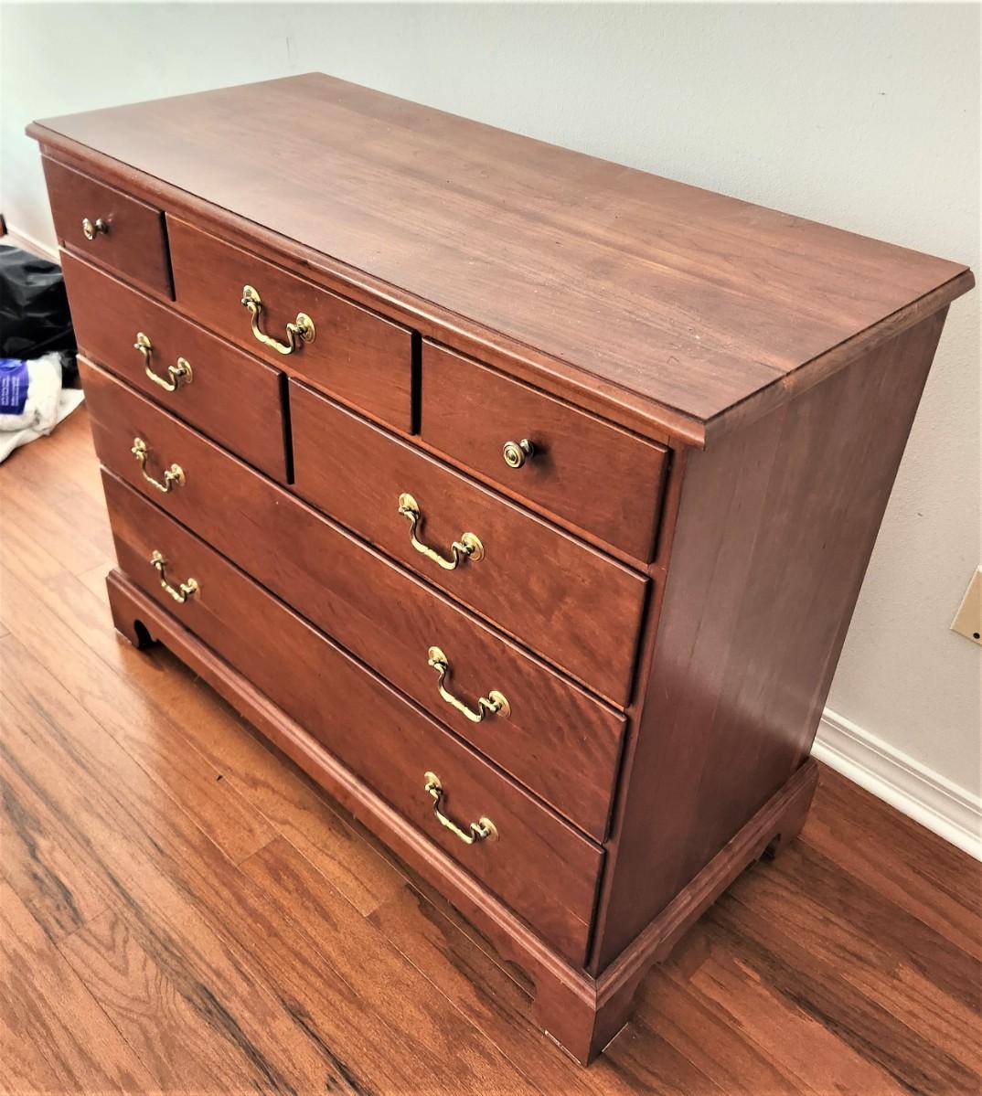 7-drawer Chest of Drawers, oak finish, brass hardware. Contemporary. 19" dep, 42" across, 34" tall. Clean, good condition.