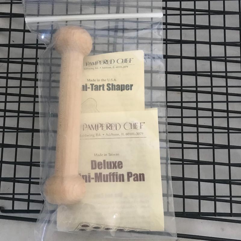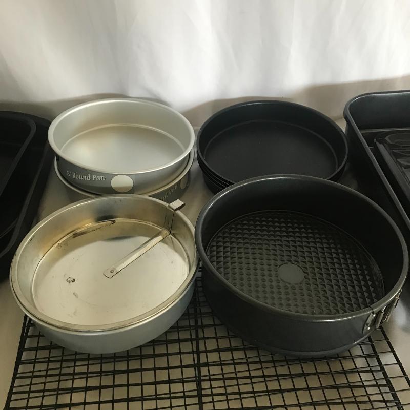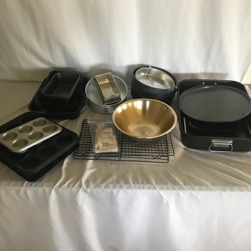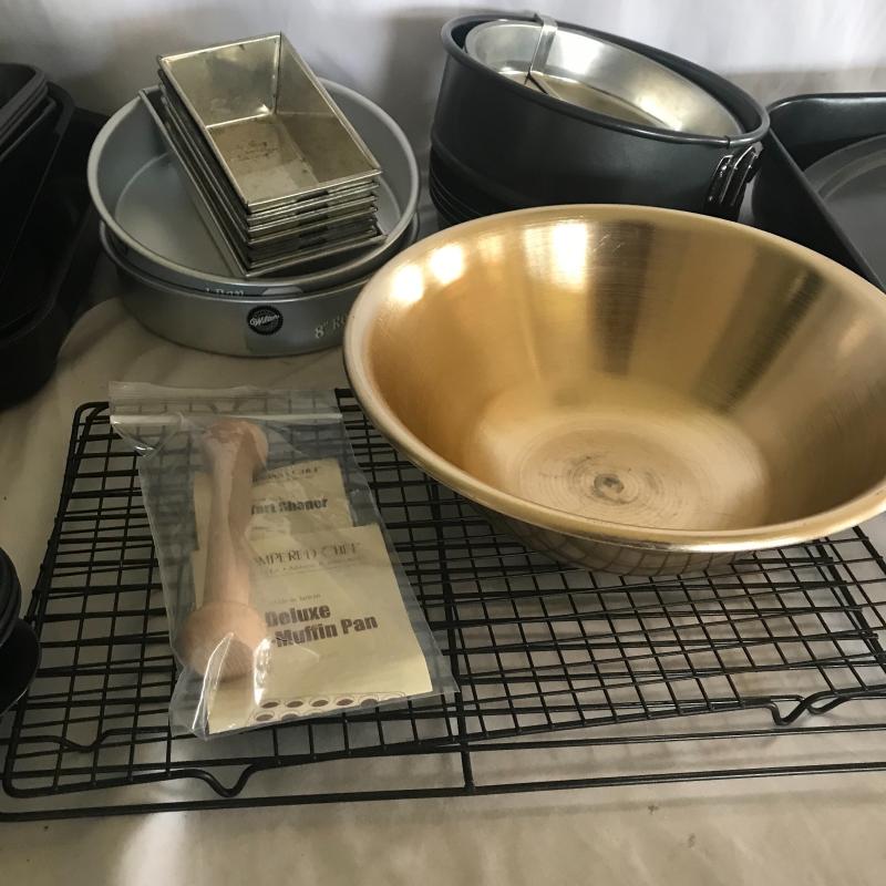Five muffin pans of 3 different sizes, seven mini loaf pans, four cake pans, cookie sheets, two pizza pans, two cooling racks, mixing bowl, wooden tart shaper by Pampered Chef and more. Local pick up only.