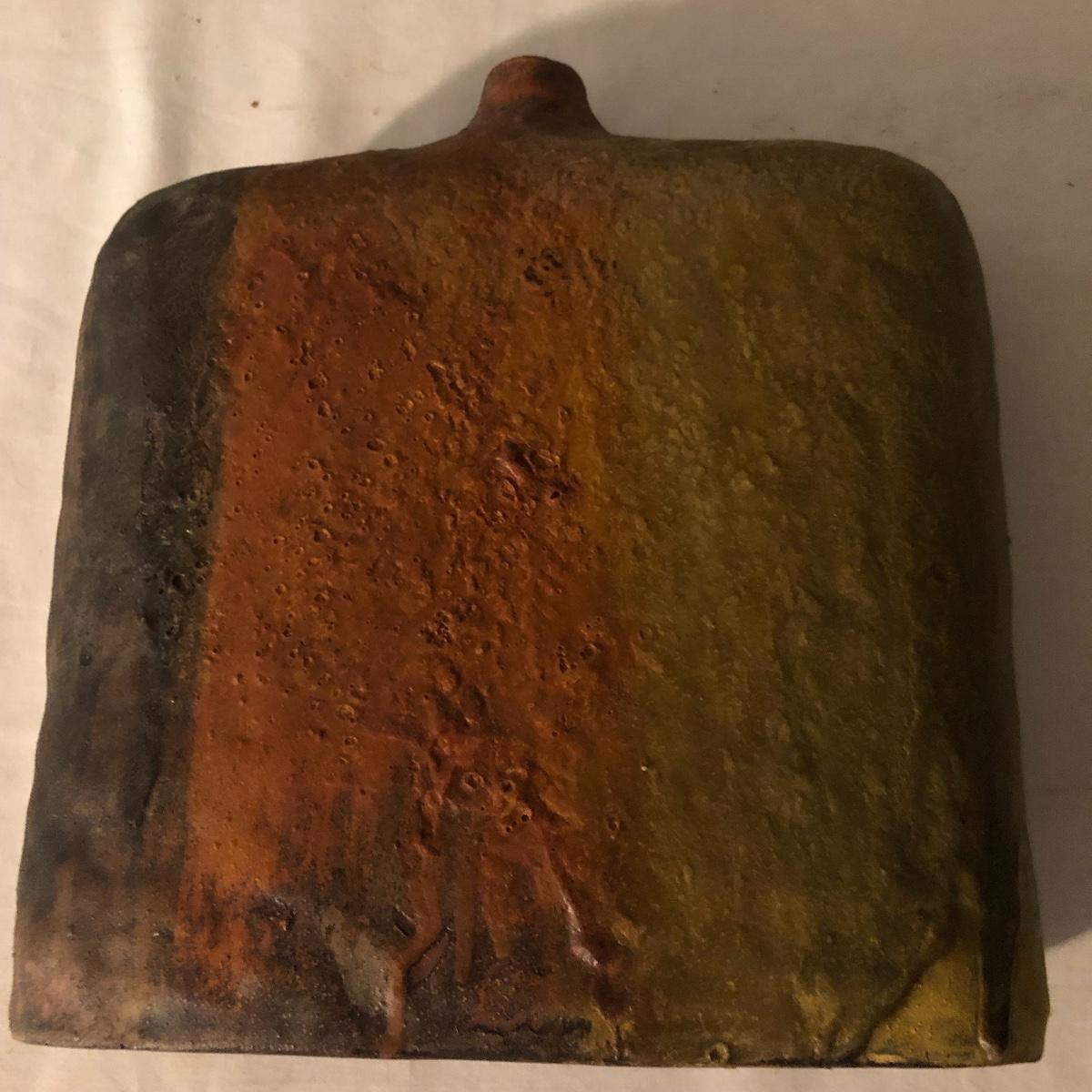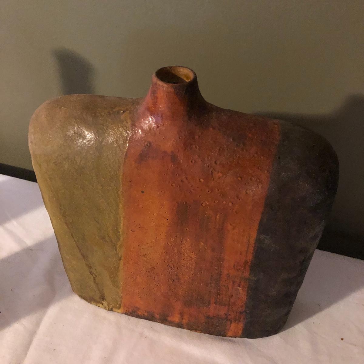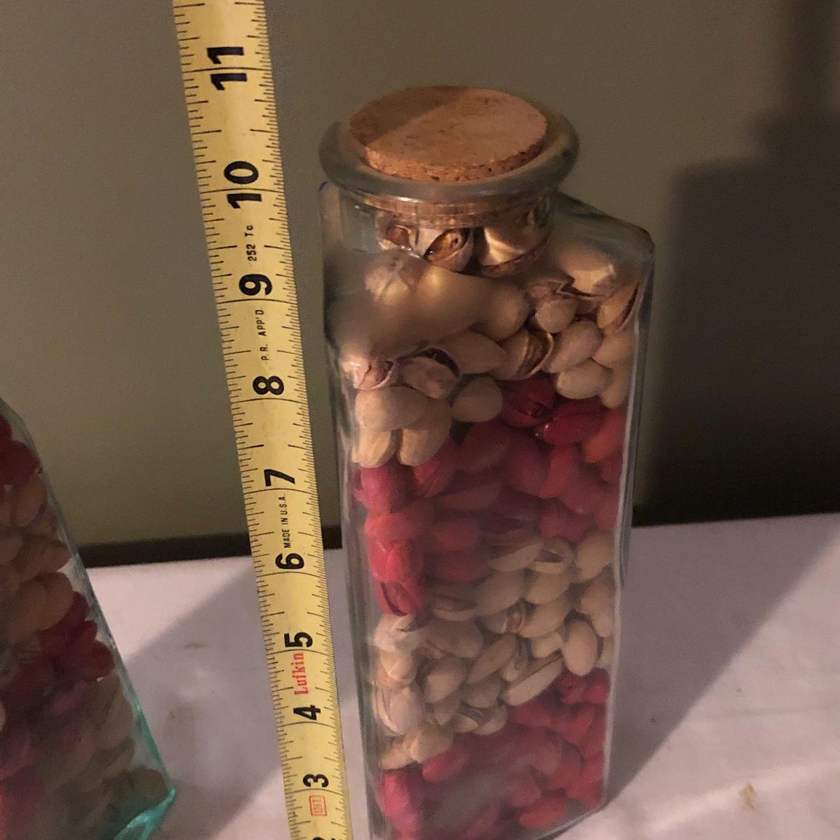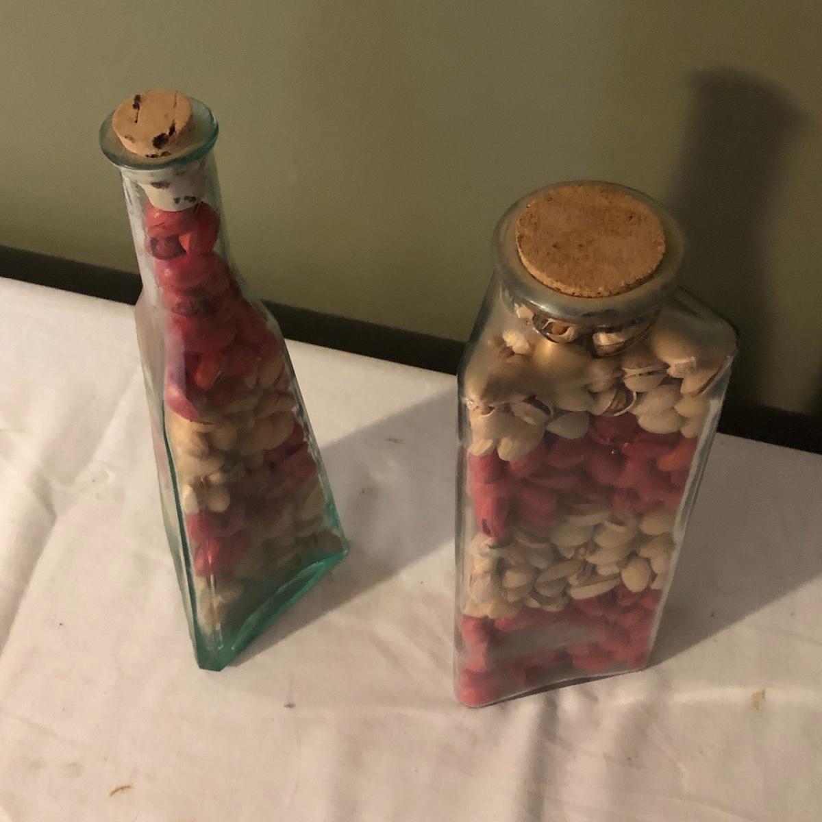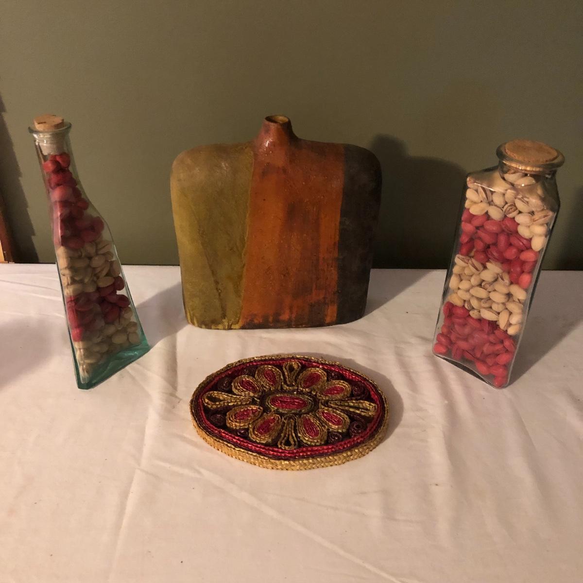 Decorate your kitchen with this lot containing a signed clay vase, straw trivet and two glass bottles filled with pistachios. The ceramic vase is signed and has an unique finish. Please note the chip. The vase measures approximately 8.5” wide x 2” deep x 10” tall. Shipping Available.