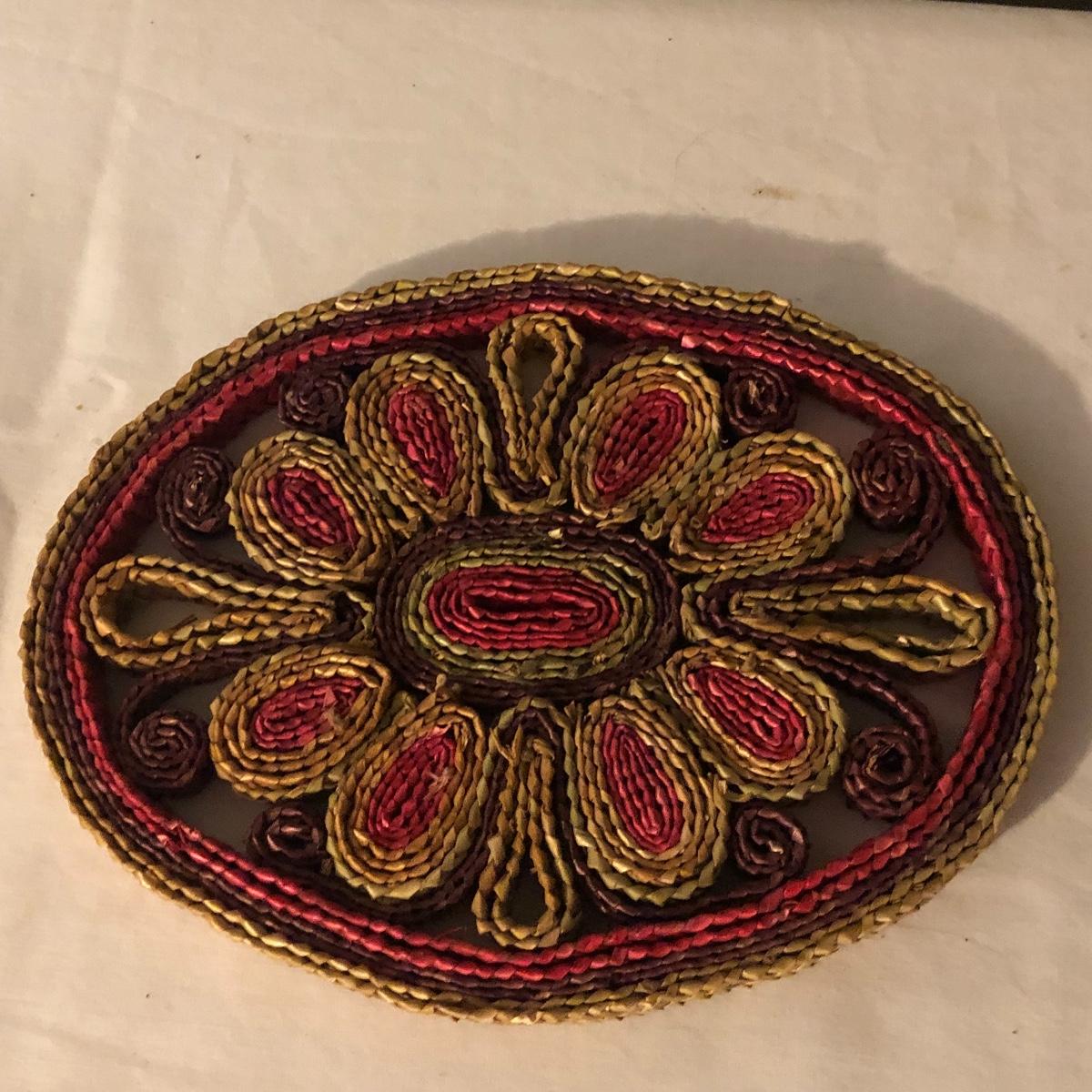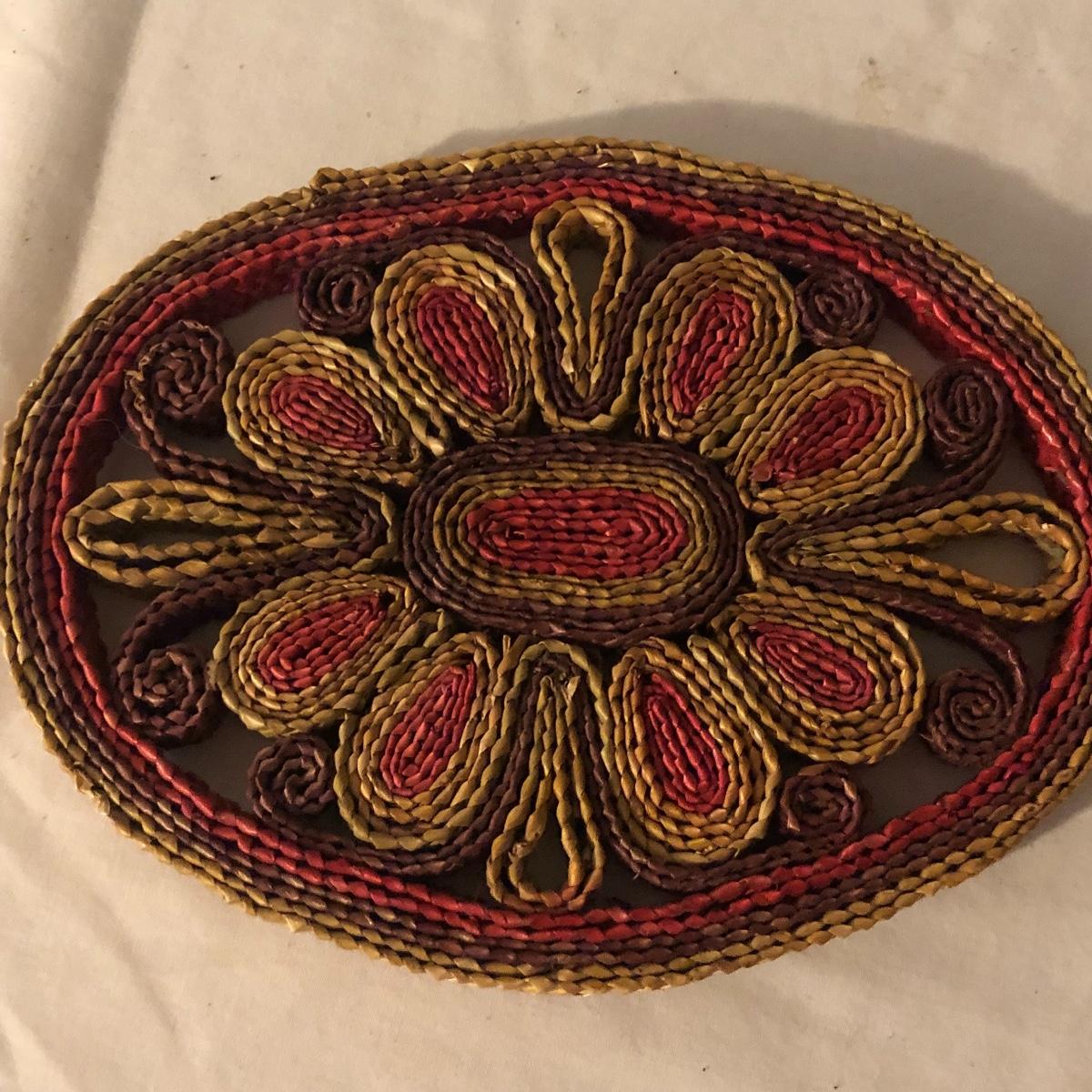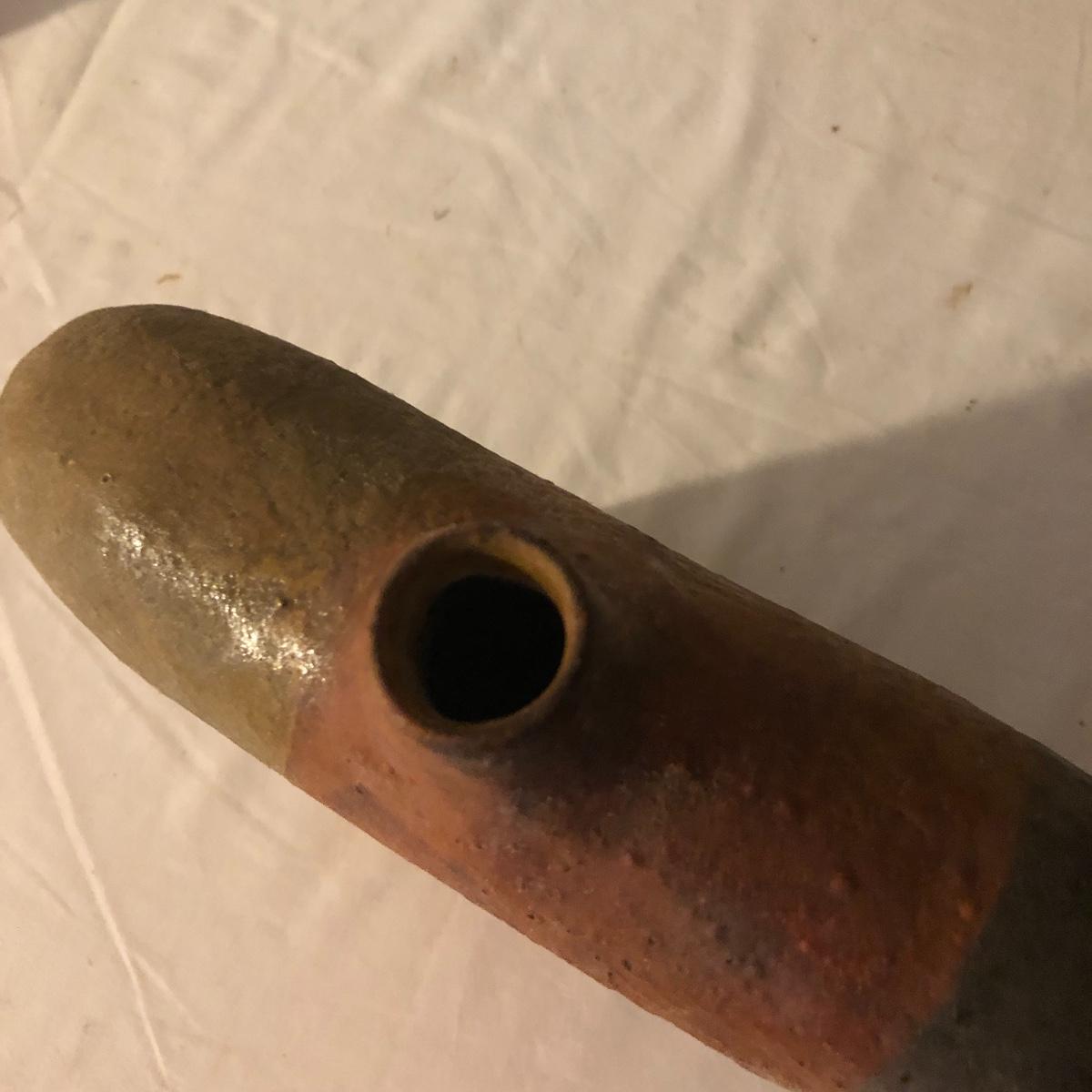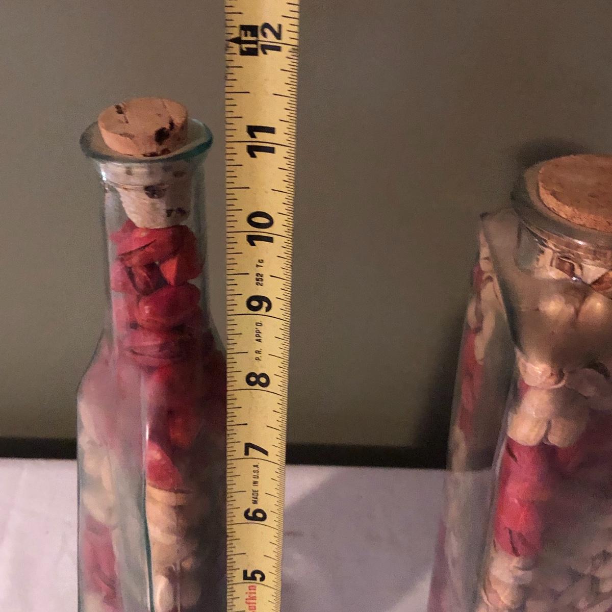 Decorate your kitchen with this lot containing a signed clay vase, straw trivet and two glass bottles filled with pistachios. The ceramic vase is signed and has an unique finish. Please note the chip. The vase measures approximately 8.5” wide x 2” deep x 10” tall. Shipping Available.