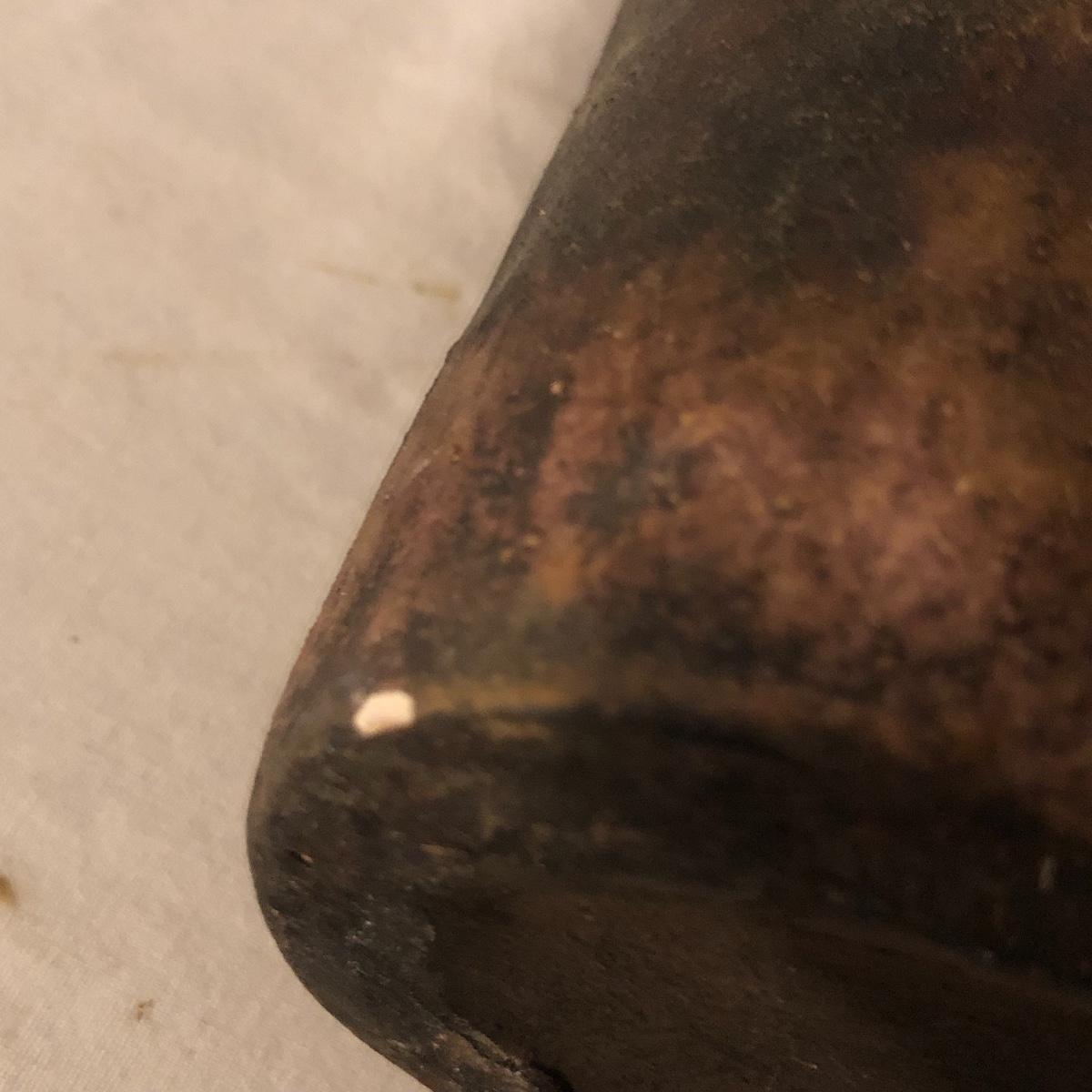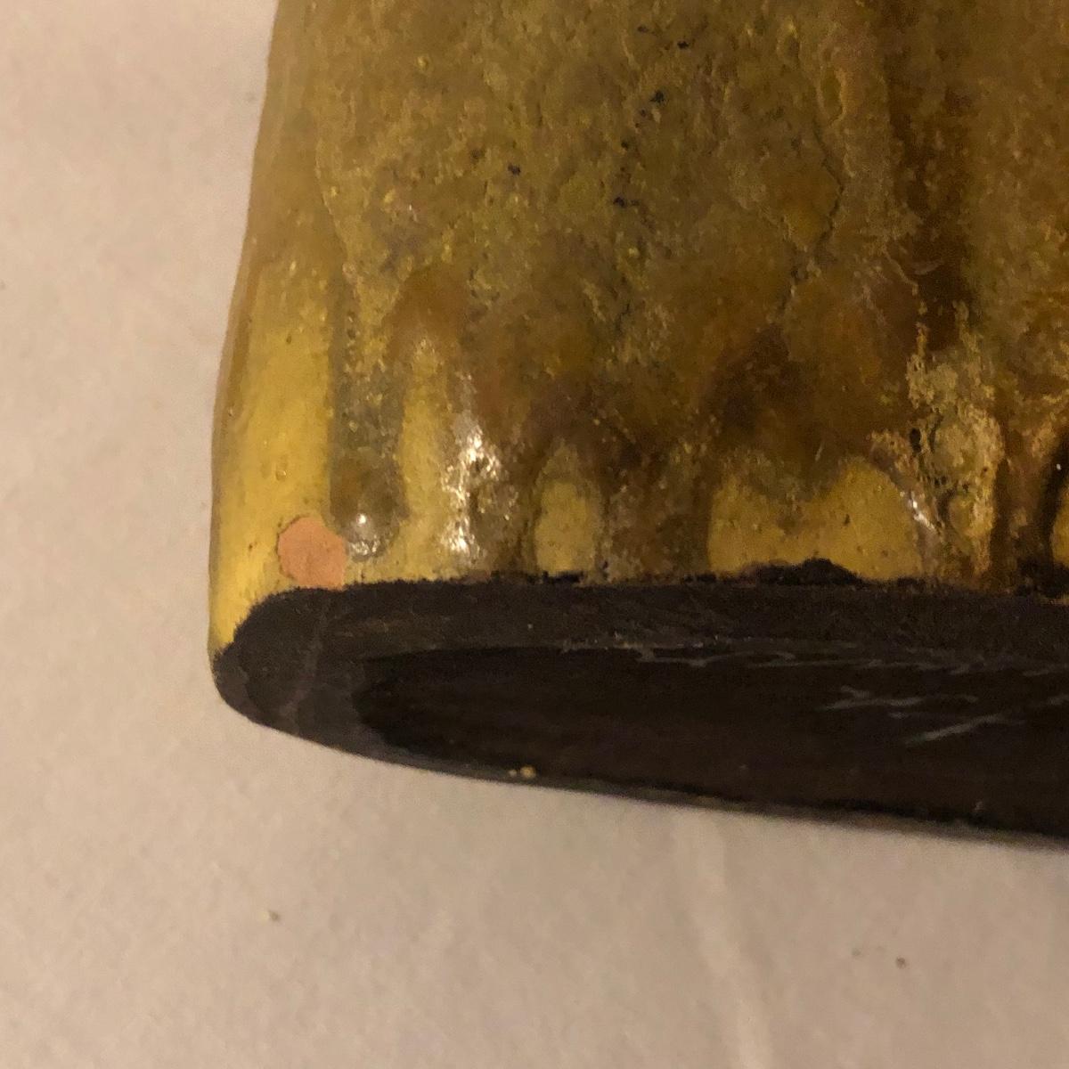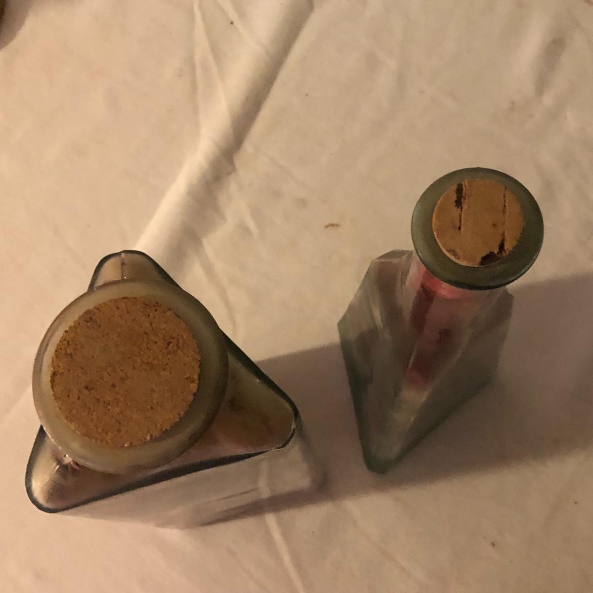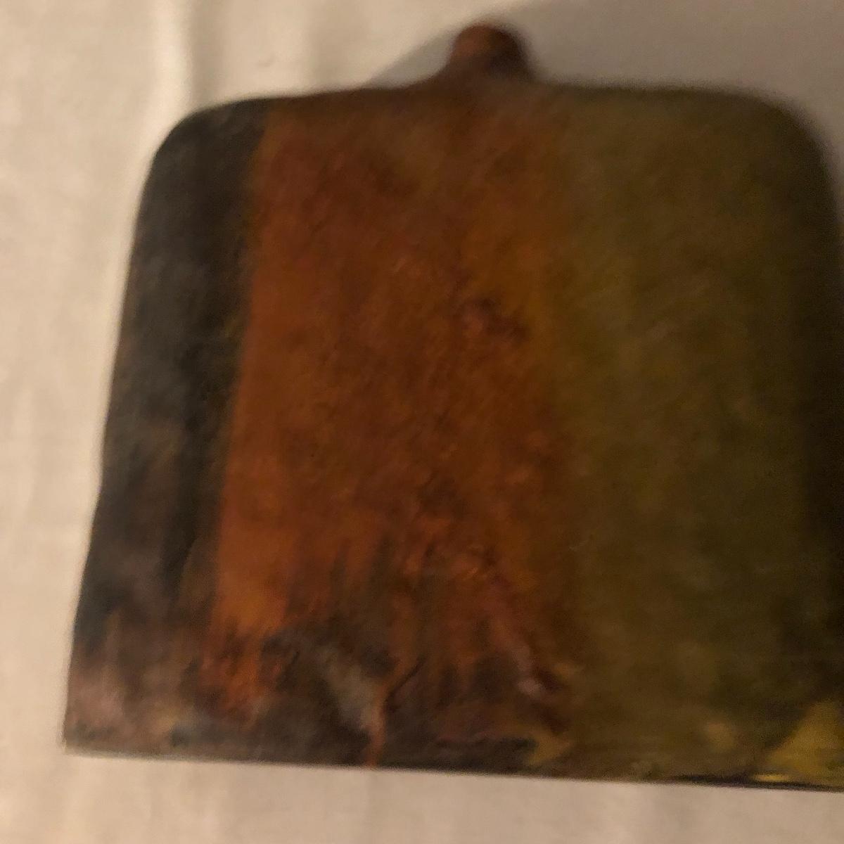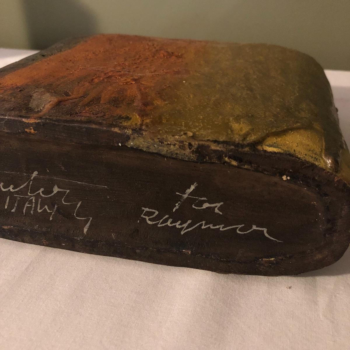Decorate your kitchen with this lot containing a signed clay vase, straw trivet and two glass bottles filled with pistachios. The ceramic vase is signed and has an unique finish. Please note the chip. The vase measures approximately 8.5” wide x 2” deep x 10” tall. Shipping Available.