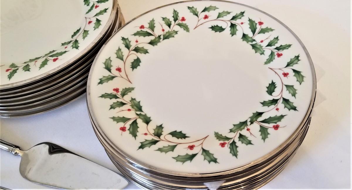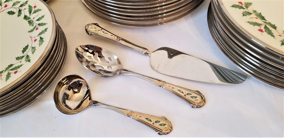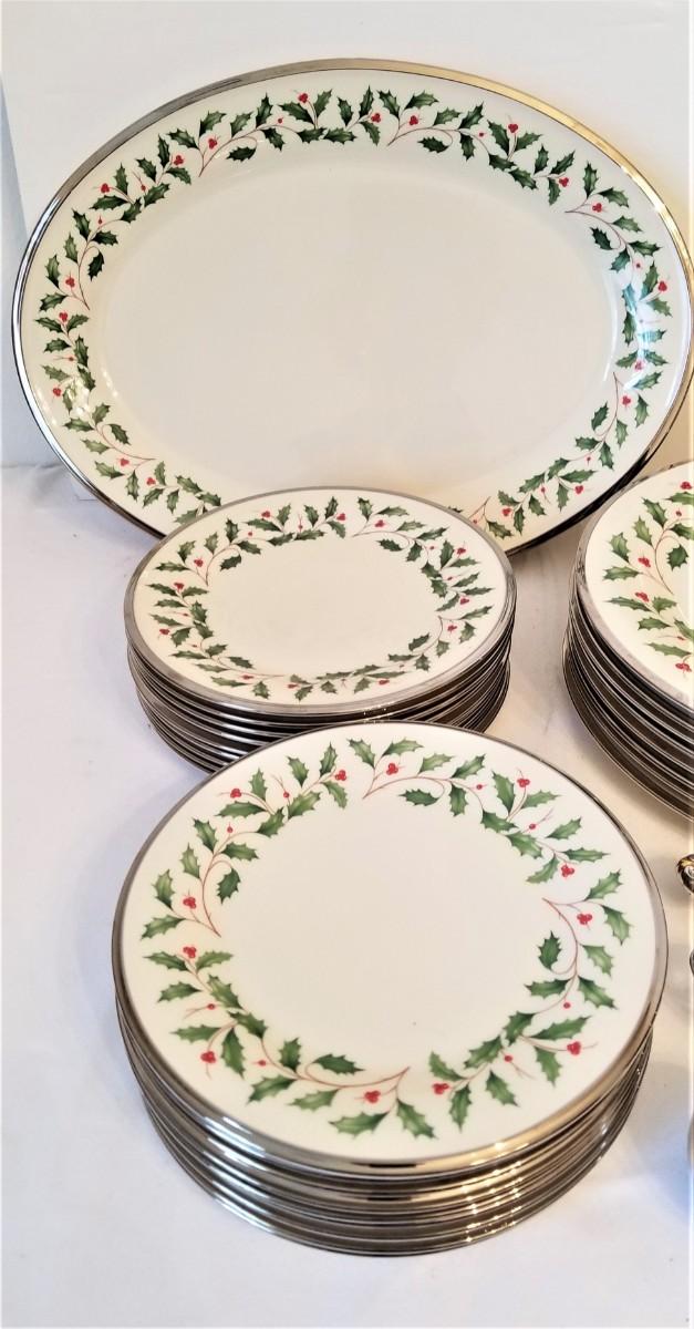You get all you see here: Platinum style rim, dishwasher safe - Platter, 18 salad plates, 16 dinner plates, 2 boxes of matching candles, 3 serving pieces. Platter is 16" long, plates 10.5" across. All in good condition.