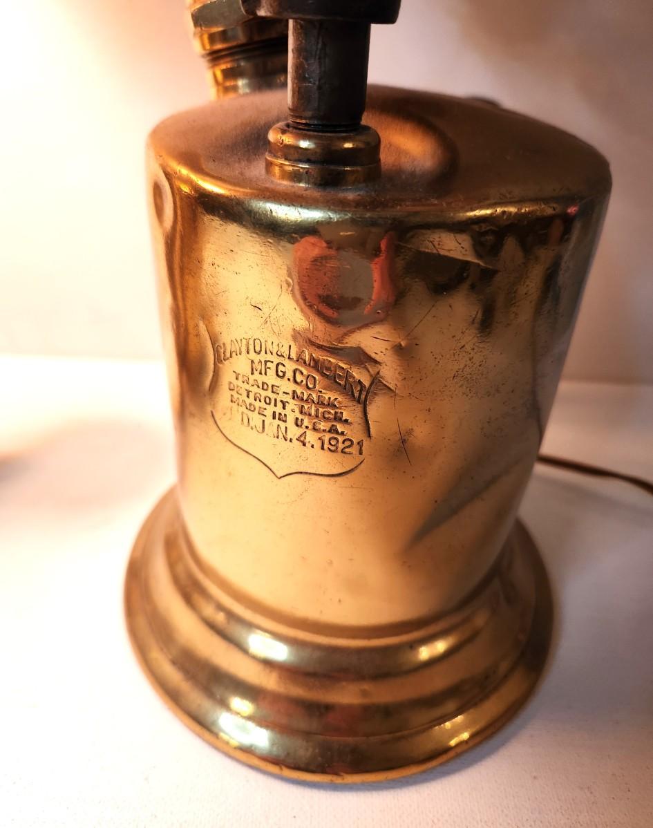 Lot of 2 Lamps made from Vintage brass blow torches - both work - each about 19" tall with shades - vintage cords and plugs.