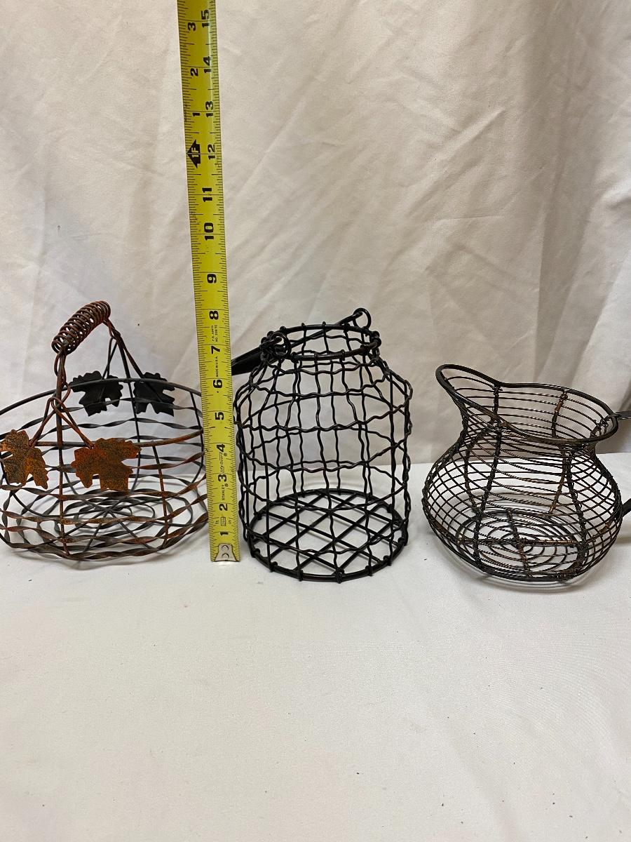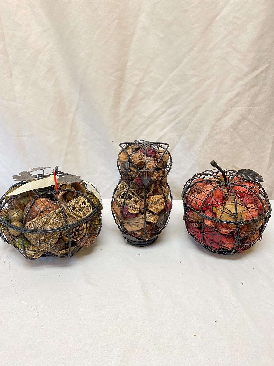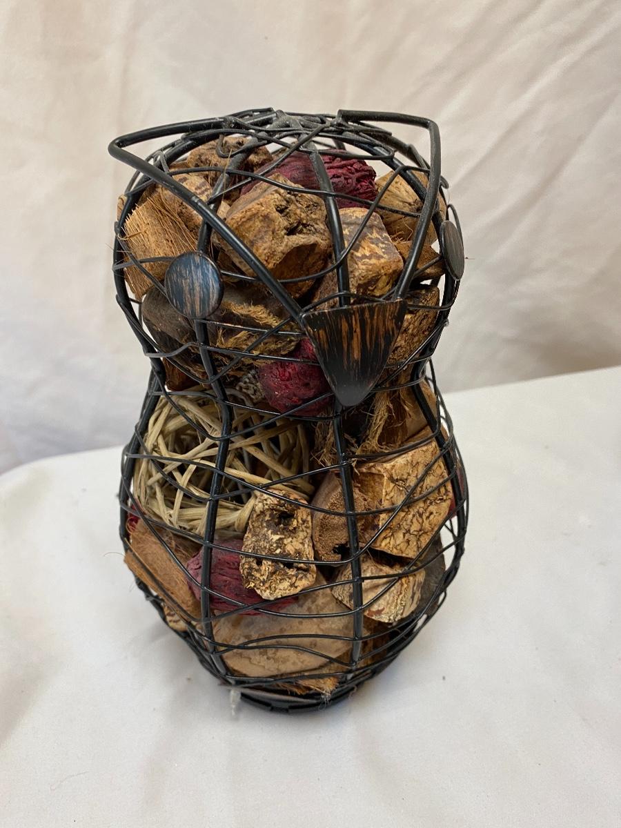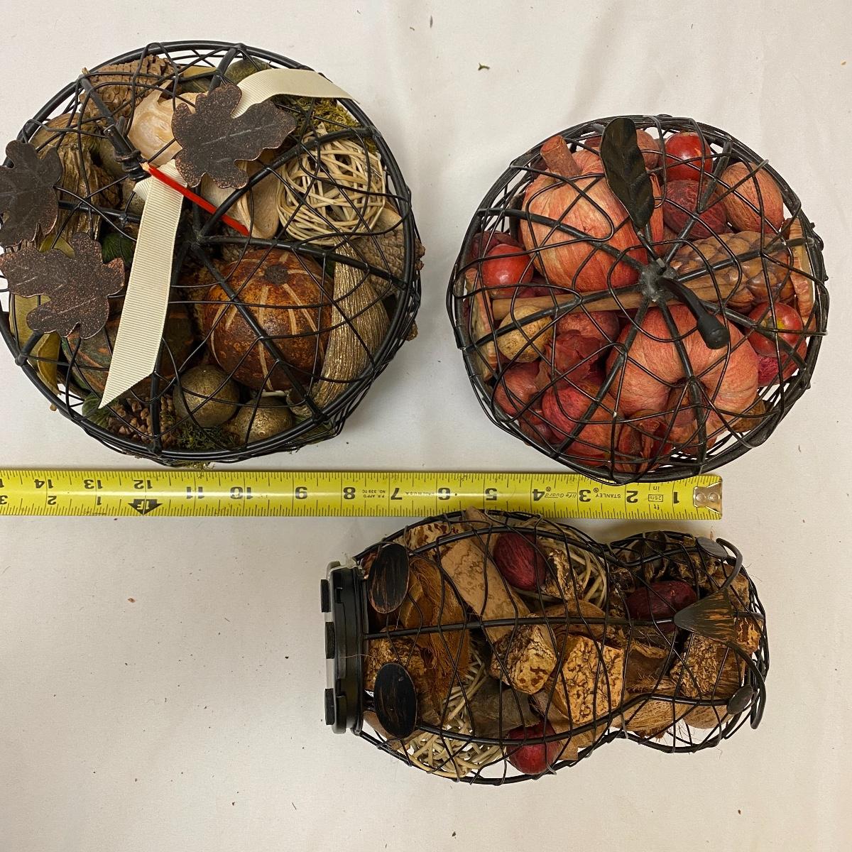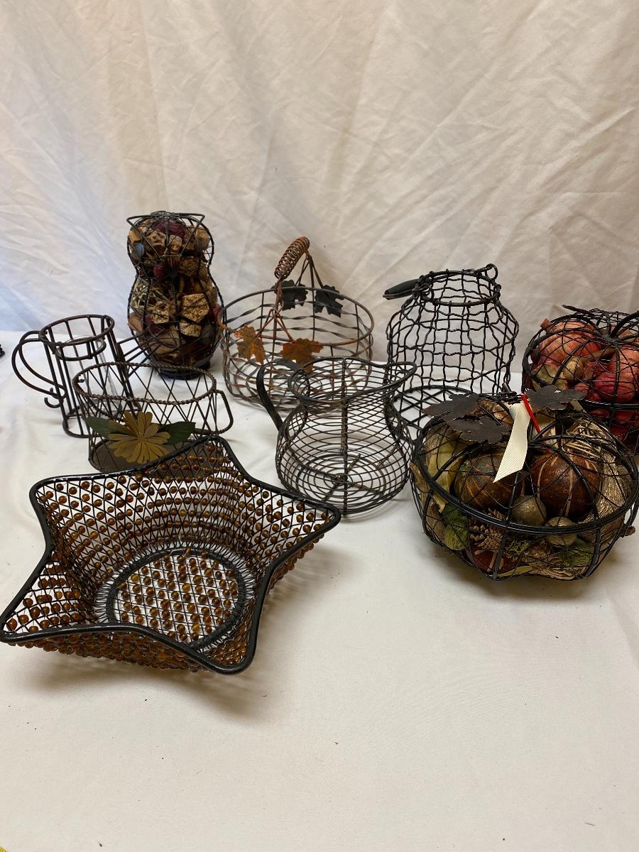Depart from the norm and get a hold of these wire or tin containers. This lot includes a cute wheelbarrow metal basket and three metal wire baskets that hold potpourri (apple, pumpkin and owl items). These appear to open from the base to replace potpourri with fresh potpourri. There are copper and silver colored tins and black and green wire baskets. Don’t miss the beaded star metal basket! It measures 10.5” across from point to point. See pix for more measurements. Great variety to use around your home and garden. Local pick up only.