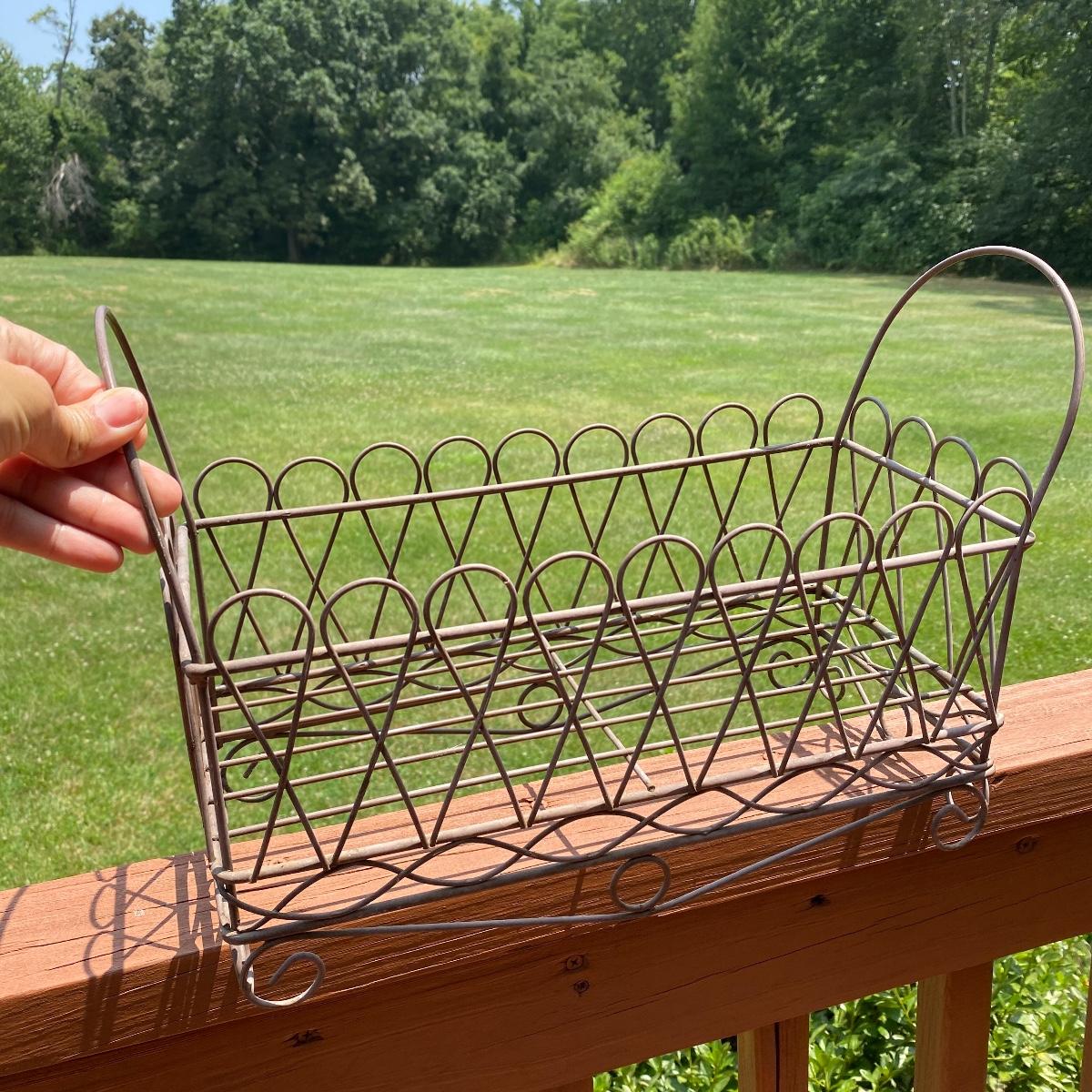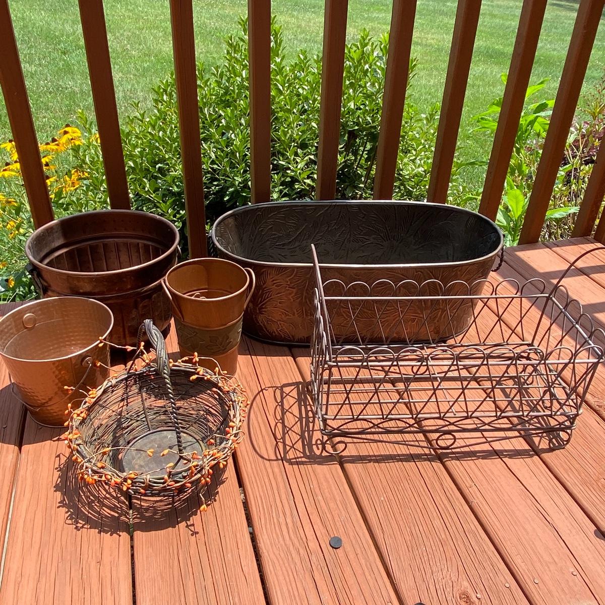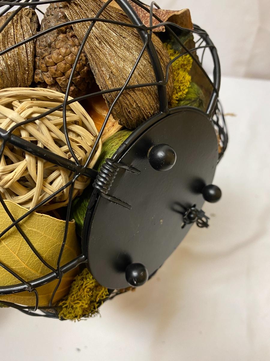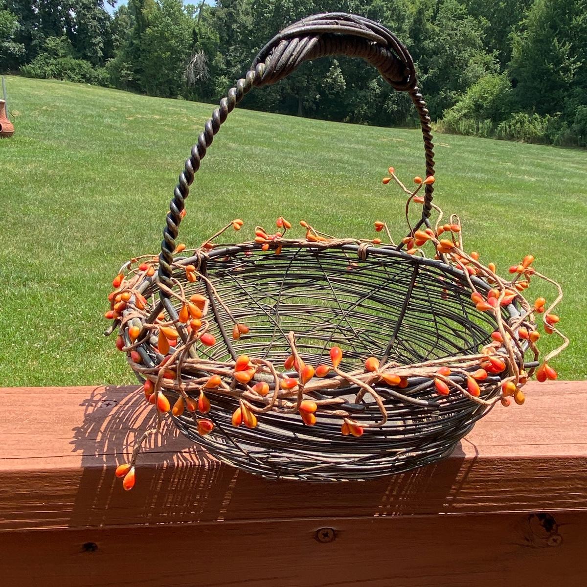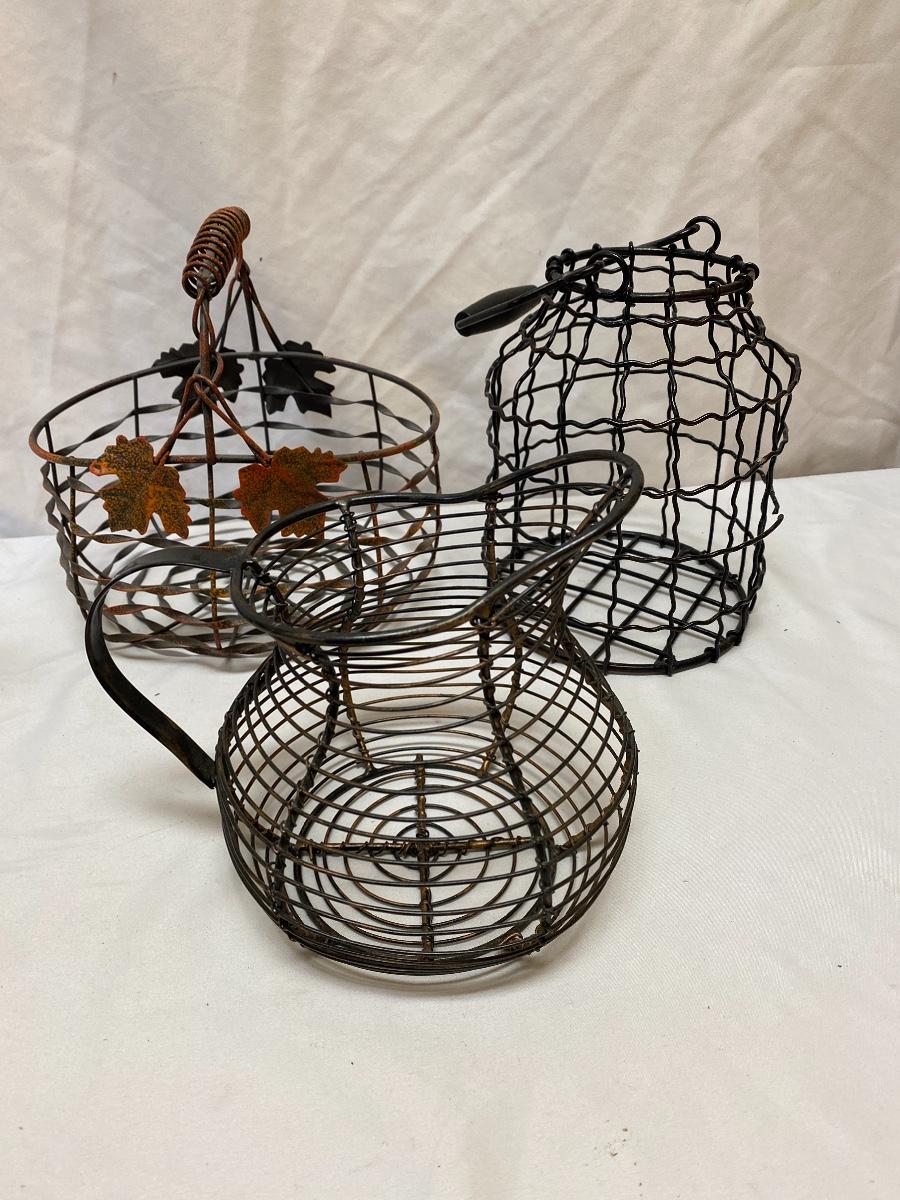Depart from the norm and get a hold of these wire or tin containers. This lot includes a cute wheelbarrow metal basket and three metal wire baskets that hold potpourri (apple, pumpkin and owl items). These appear to open from the base to replace potpourri with fresh potpourri. There are copper and silver colored tins and black and green wire baskets. Don’t miss the beaded star metal basket! It measures 10.5” across from point to point. See pix for more measurements. Great variety to use around your home and garden. Local pick up only.