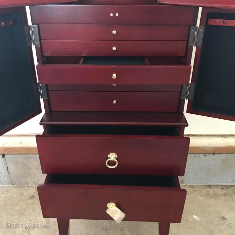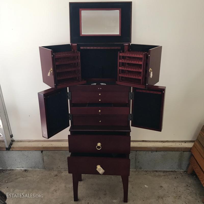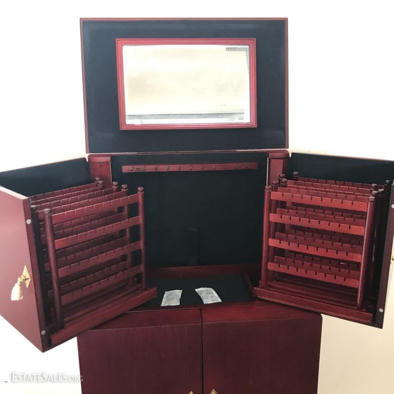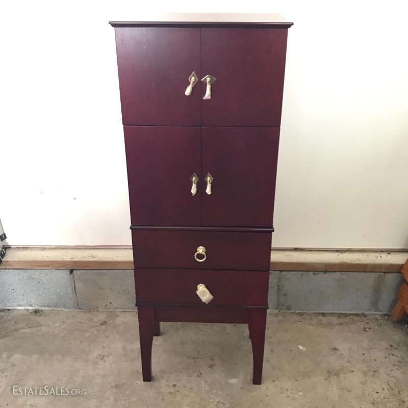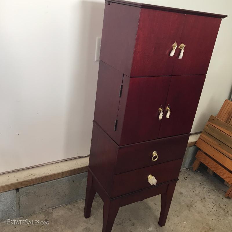 Cherry wood colored jewelry storage from "Clever & Unique Creations by Lori Greiner". Never been used. Opens up with lots of clever storage for earrings, necklaces and more. Classy design to fit in with your decor. 16.5"l x 10.5"w x 44.5"h. No shipping. Local pick up in Mills River, NC.