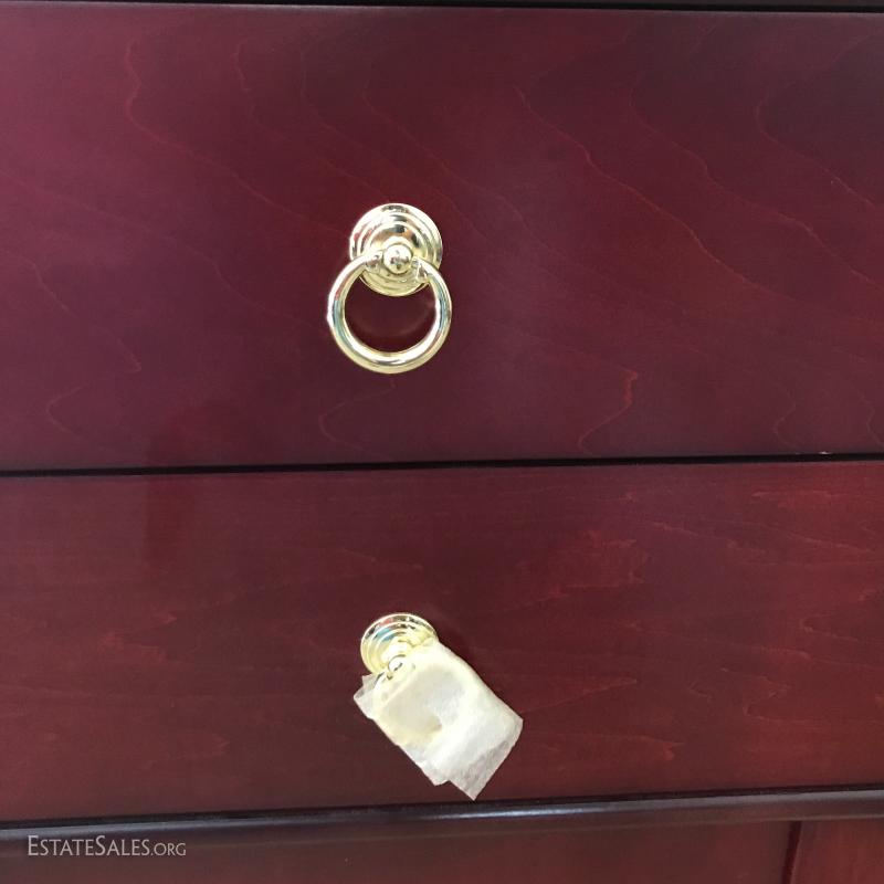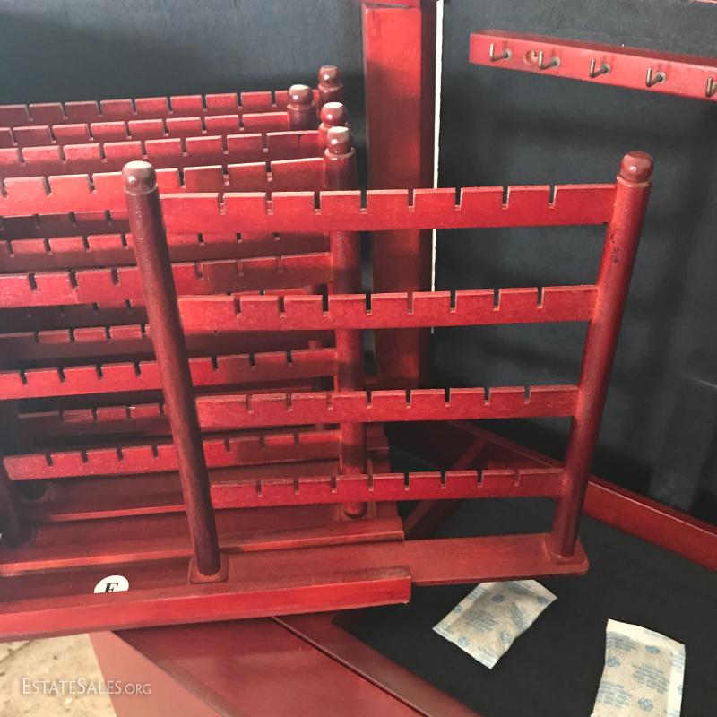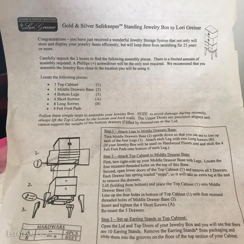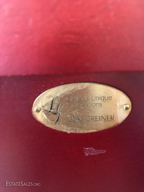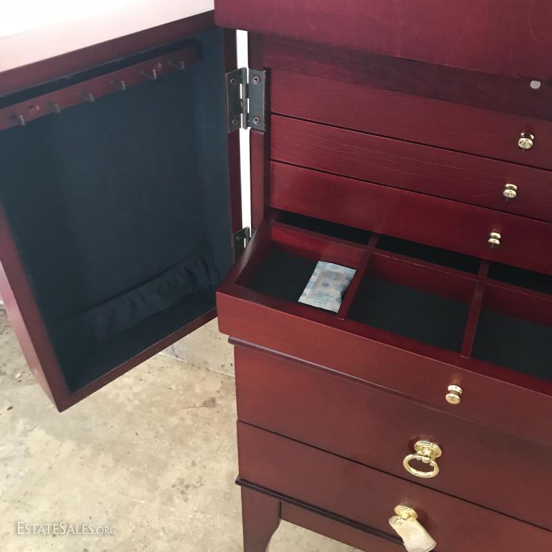 Cherry wood colored jewelry storage from "Clever & Unique Creations by Lori Greiner". Never been used. Opens up with lots of clever storage for earrings, necklaces and more. Classy design to fit in with your decor. 16.5"l x 10.5"w x 44.5"h. No shipping. Local pick up in Mills River, NC.