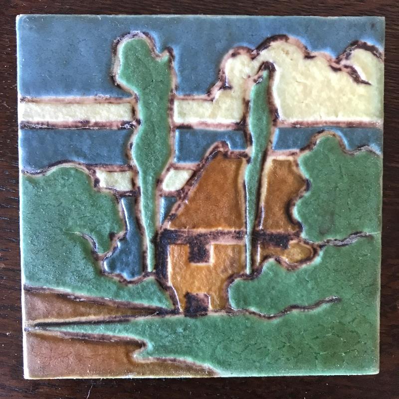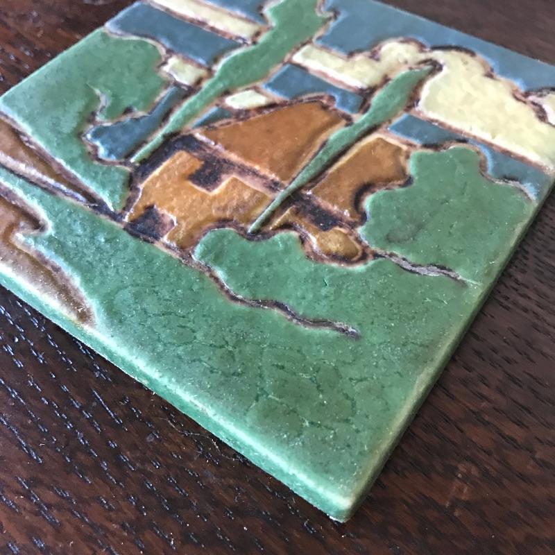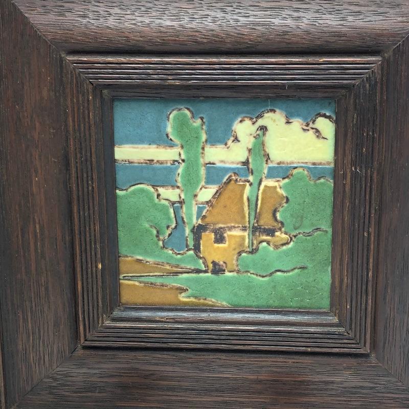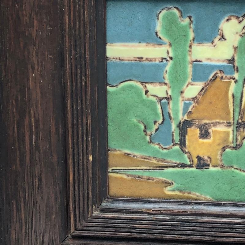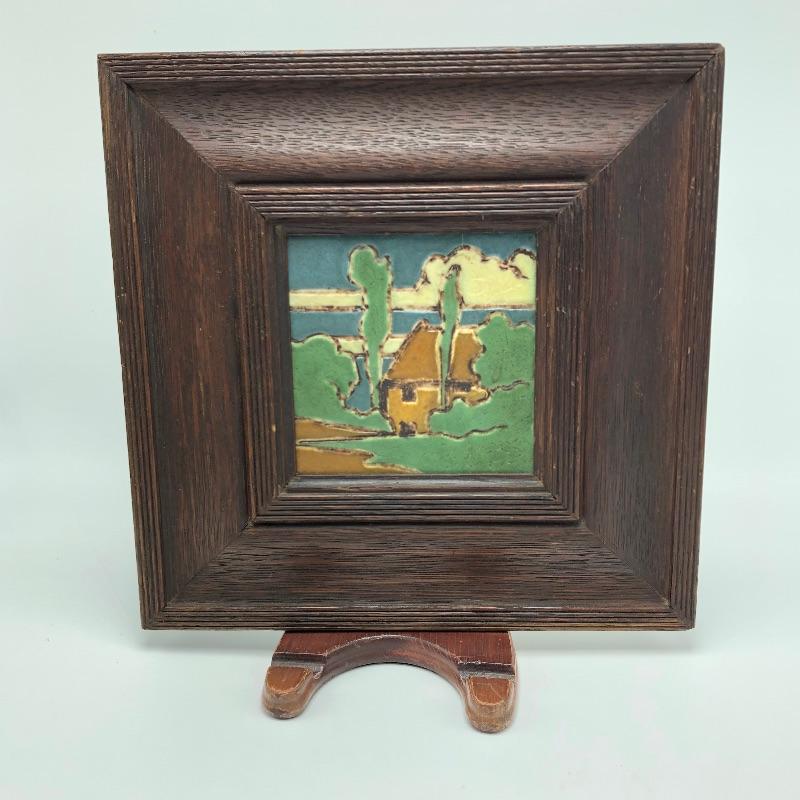 This is a Grueby tile made prior to Pardee Works take over. The scenic tile of an Arts & Crafts home. In green and brown glazes. Wooden tile frame. Minor blemishes noted in photos.