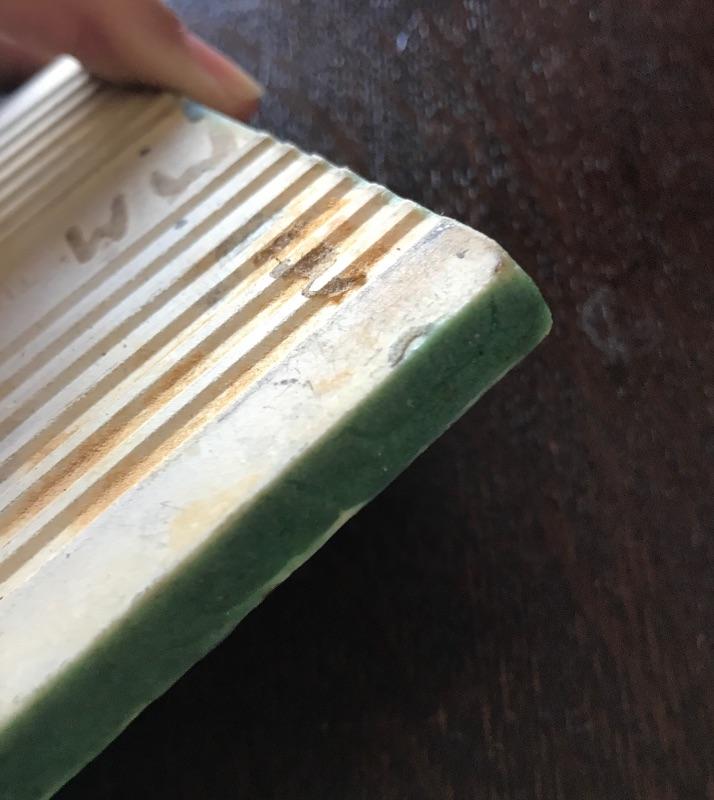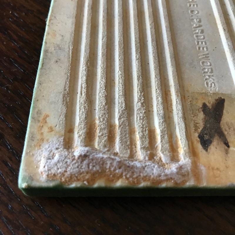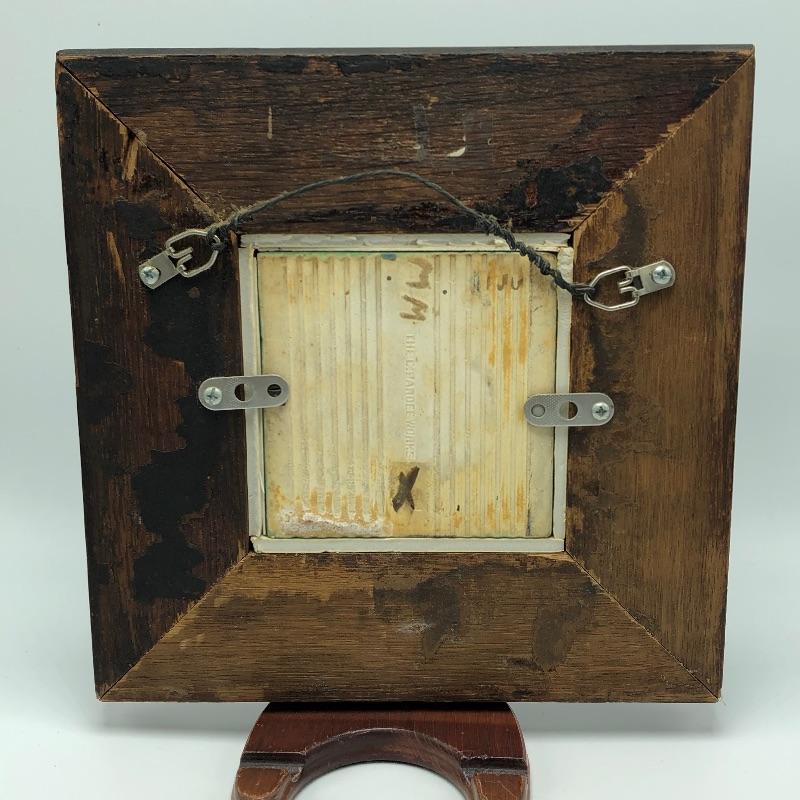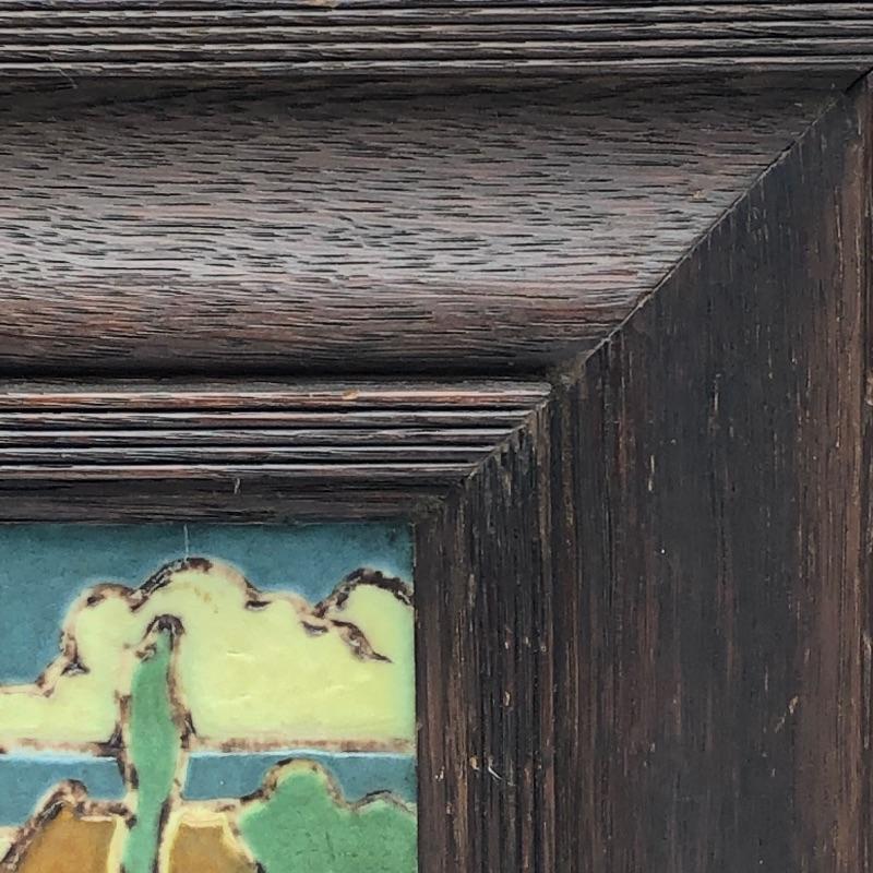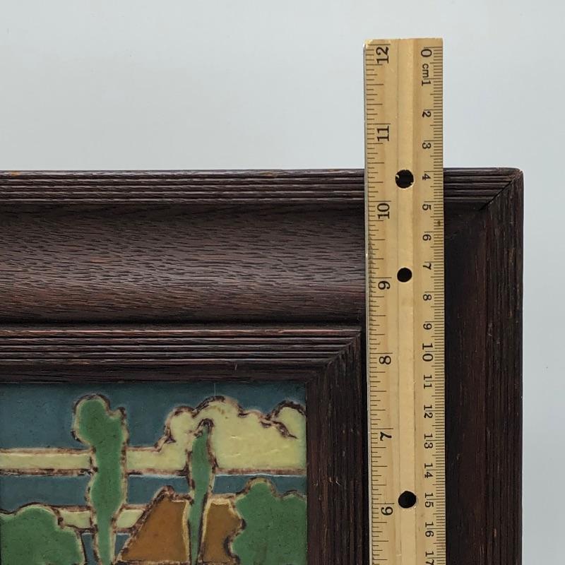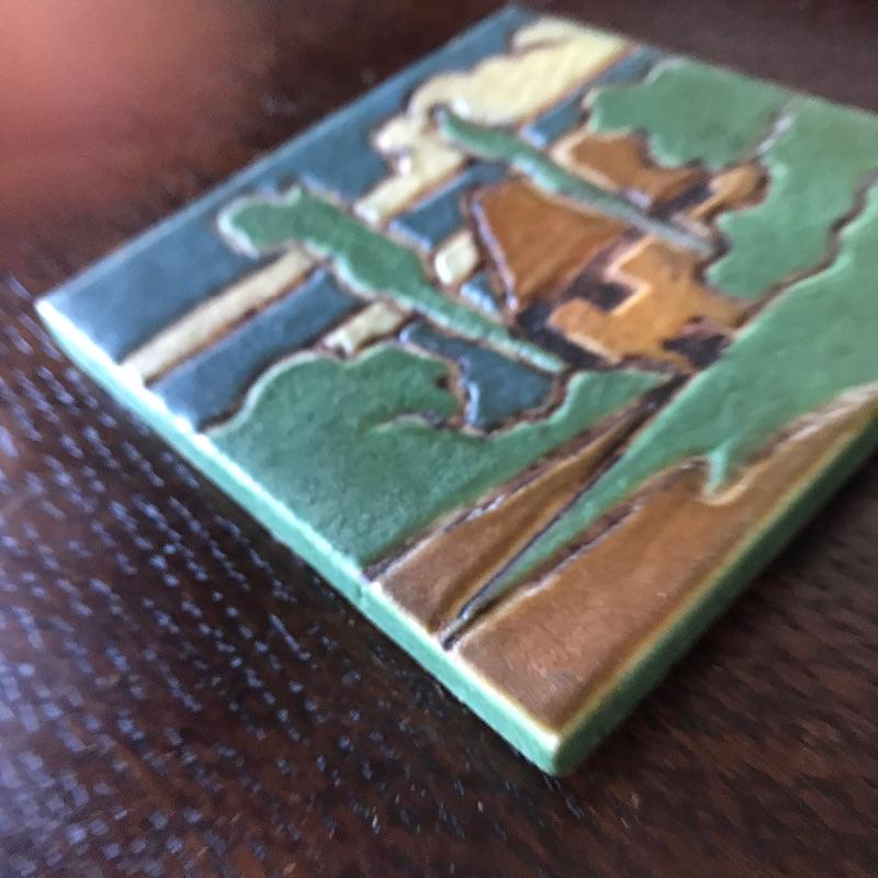 This is a Grueby tile made prior to Pardee Works take over. The scenic tile of an Arts & Crafts home. In green and brown glazes. Wooden tile frame. Minor blemishes noted in photos.