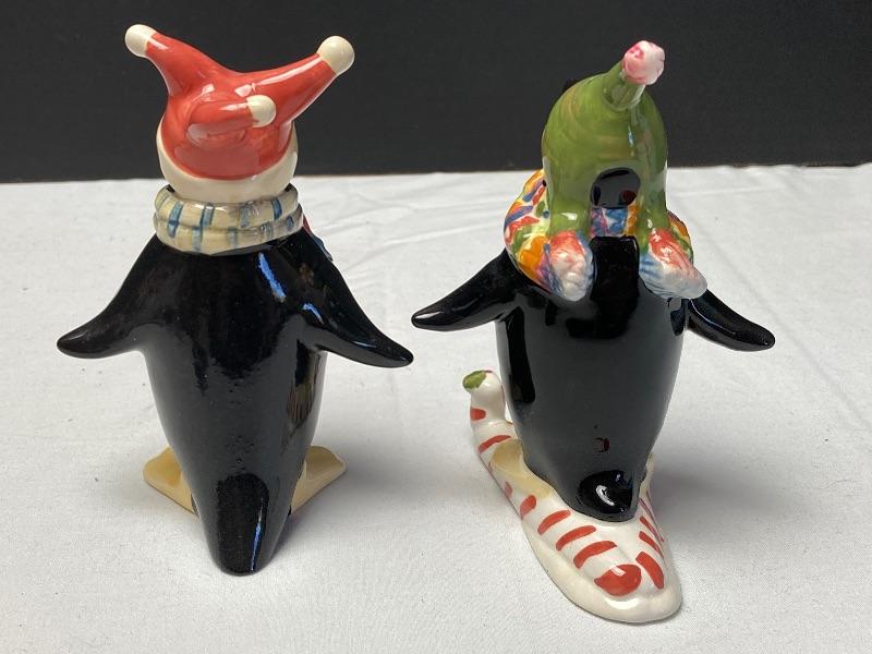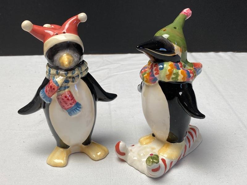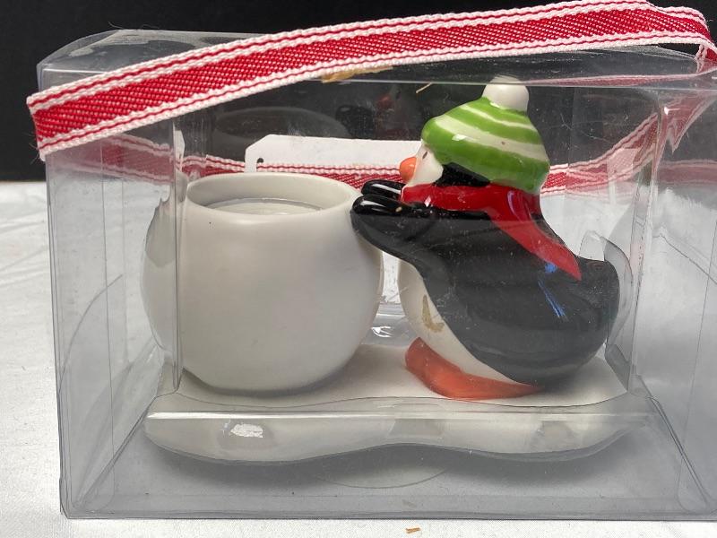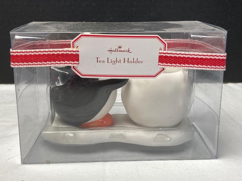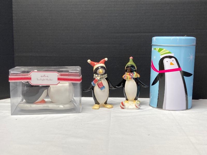 Penguin salt and pepper shakers, tin, Hallmark tea light candle holder