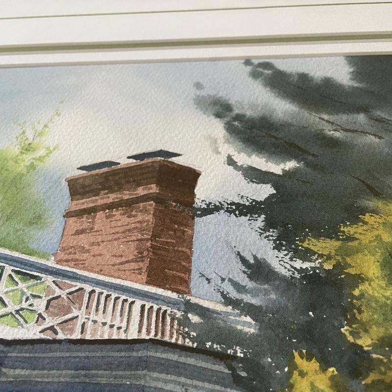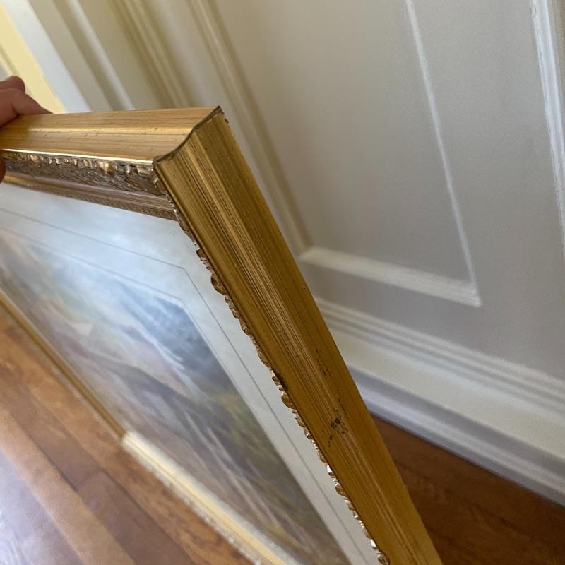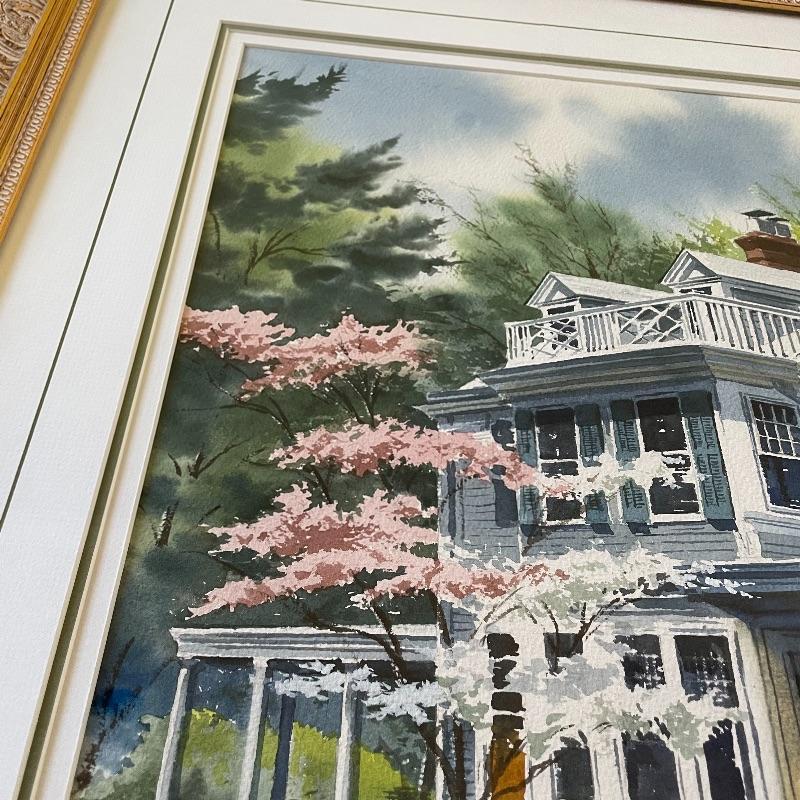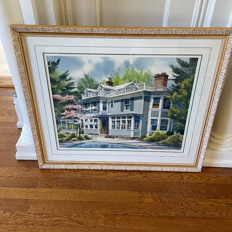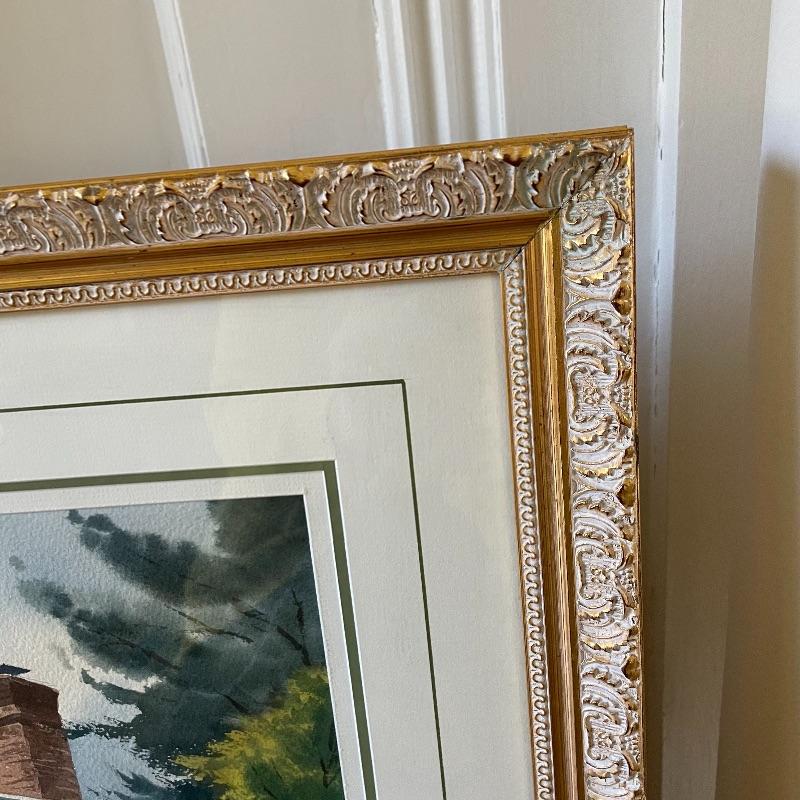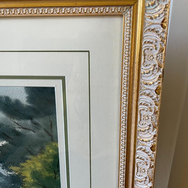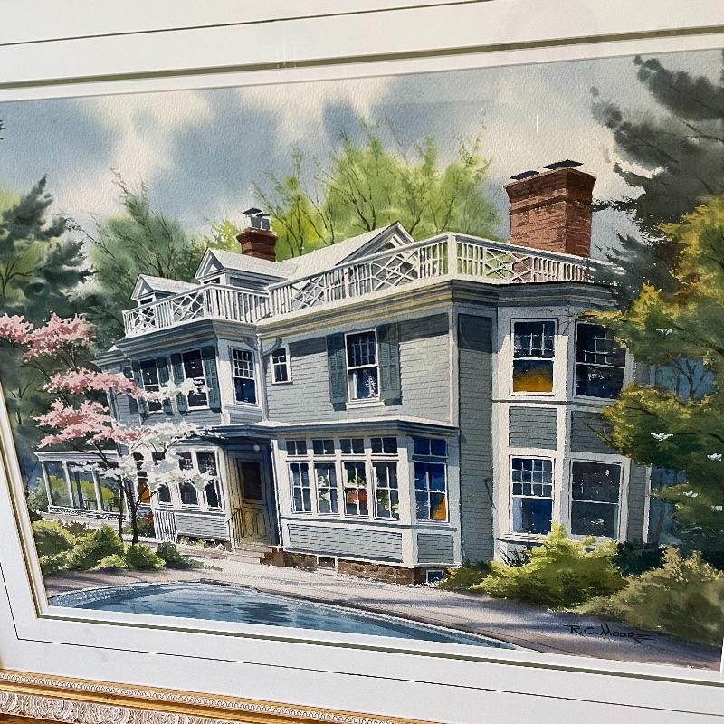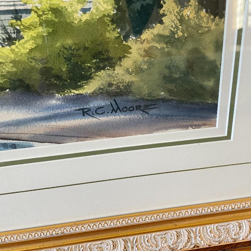 Lovely estate art signed R.C. Moore. This art sits behind glass and nice layered matting. The painted wooden frame is about 31.5” x 26.5”. See images. Shipping available. Please call UPS with dimensions at 828-252-6930 for a shipping quote prior to bidding.