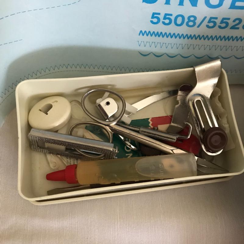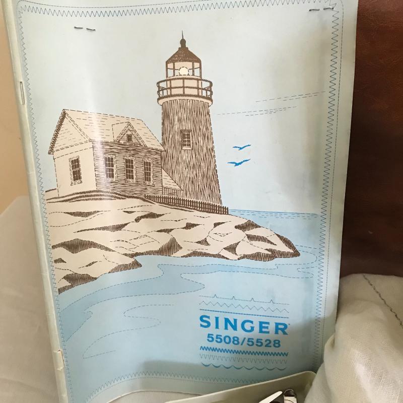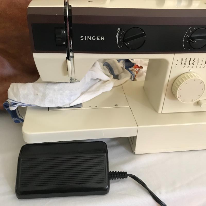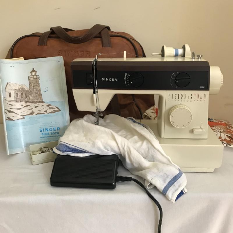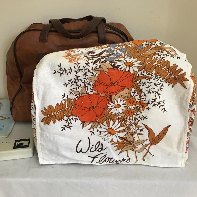 Singer Sewing Machine in nice condition, obviously stored well in leather-looking vinyl case. Complete with flowered cover, which appears to be hand-made, pedal and kit, see photos. Local pick up only.
