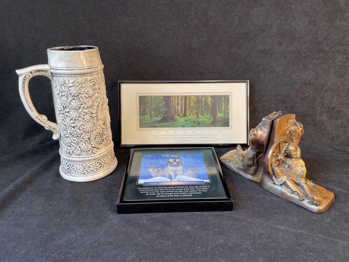 Large Stein, Brass Bookends and 2 Motivational Pictures