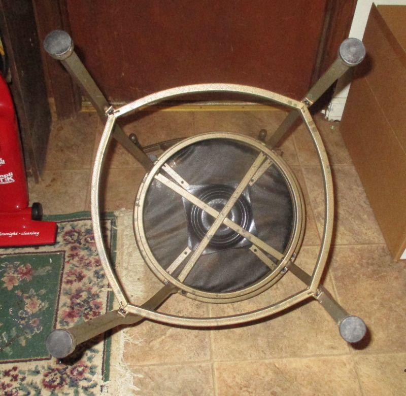 I'm calling this the "Willy Wonka" bar stool (if you've ever seen the original Willy Wonka, then you understand). The legs are not quite right and I debated on listing this one, but then I realized that it looks more like an assembly issue than a defect. I took pictures of the underside so that you can see more. If it's an assembly issue, then the winner could probably just unsrew and then re-screw the legs and braces in. However, I am not sure that this is the case so please use your best judgement. It is 44.75" tall and the seat is at 27.75" with a diameter of 16.25".