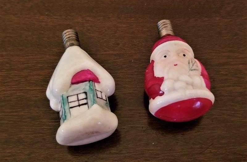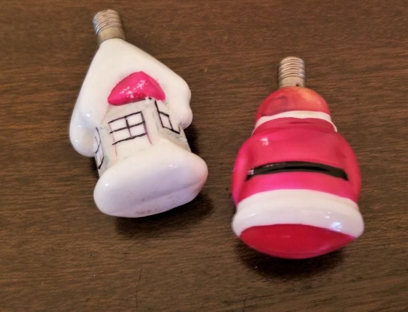 Two sweet little vintage figural Christmas lights - cottage and Santa. Each about 2.5" tall.