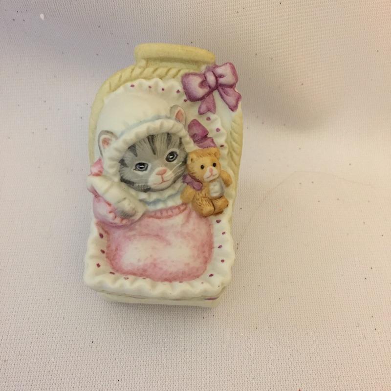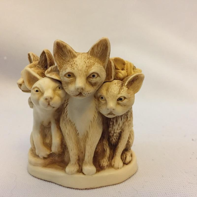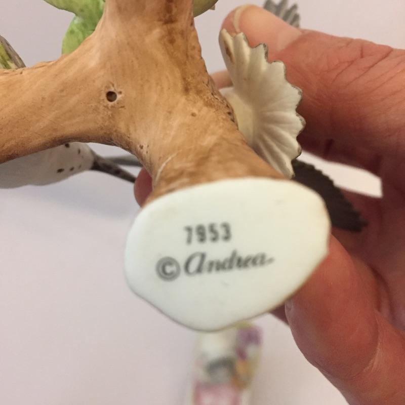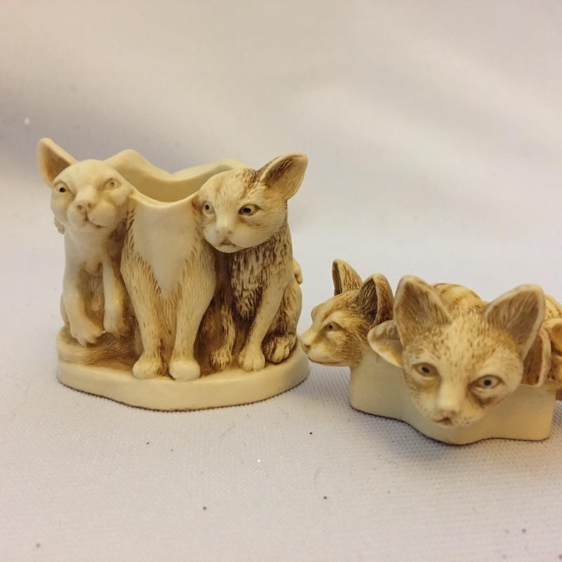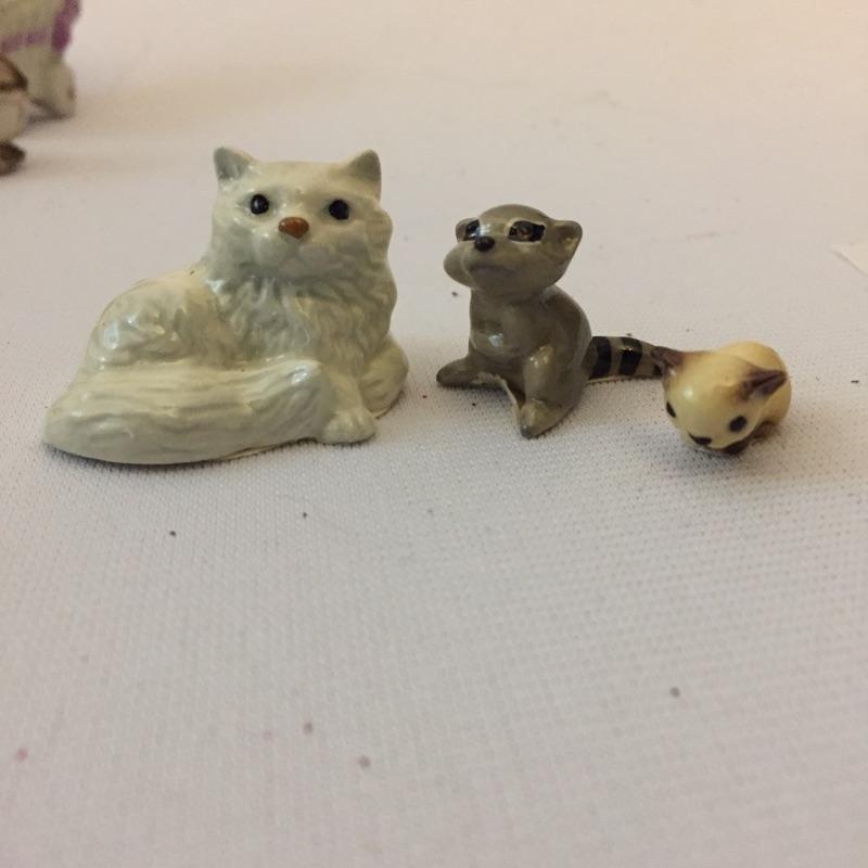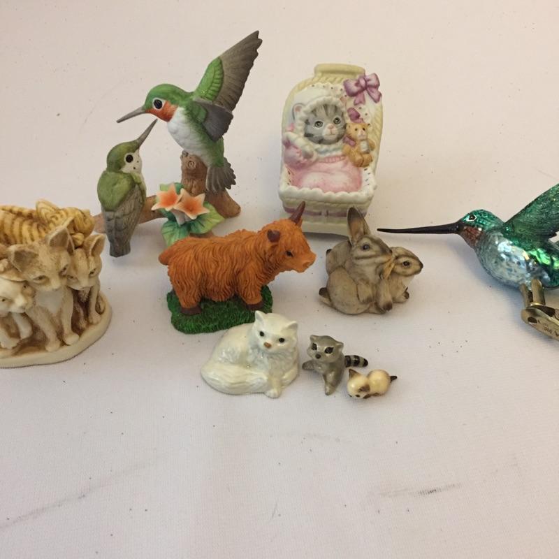 A little figurine assortment that includes three small adorable and vintage cats as well as a random assortment of other animal figurines. The blue hummingbird is made from glass and has a clip on bottom. The ceramic two hummingbirds on a branch is by Andrea and is the largest piece measuring 3.5” tall. The unique cat container is lidded and Made in England.