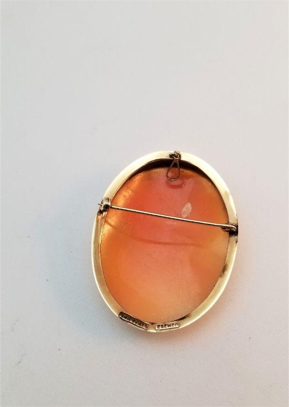 This classic carved cameo brooch has a bale and can also be worn as a pendant. 14kt Gold mount, measures 2" tall. ca. 1940's - 1950's. The scrap value of the mount is approx. 100.00. Item will not be sold for less than the scrap price.
