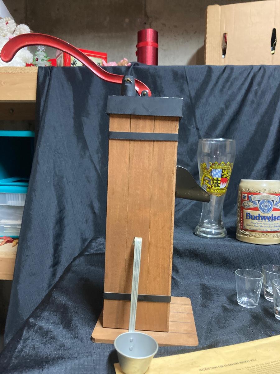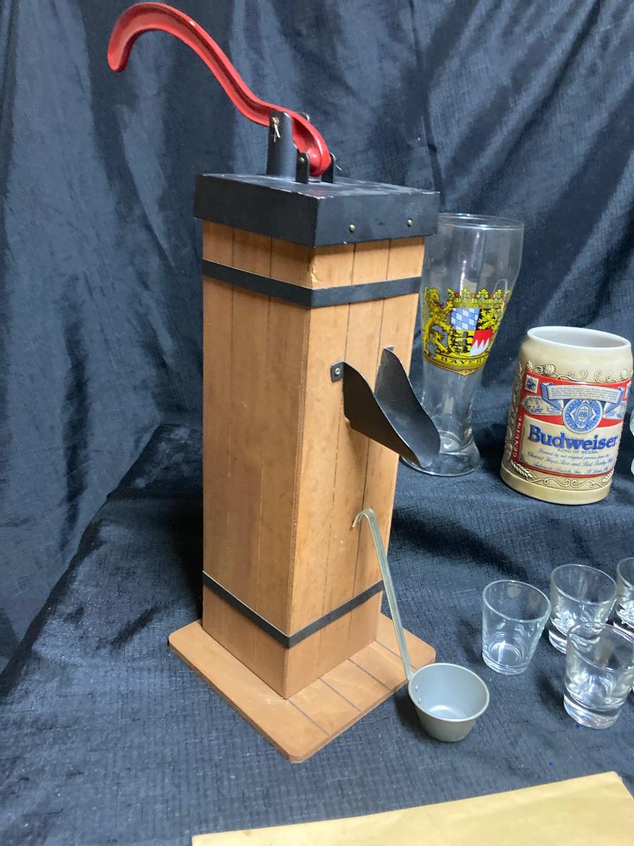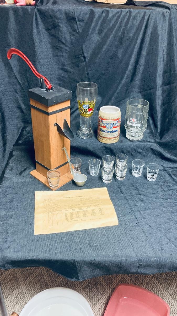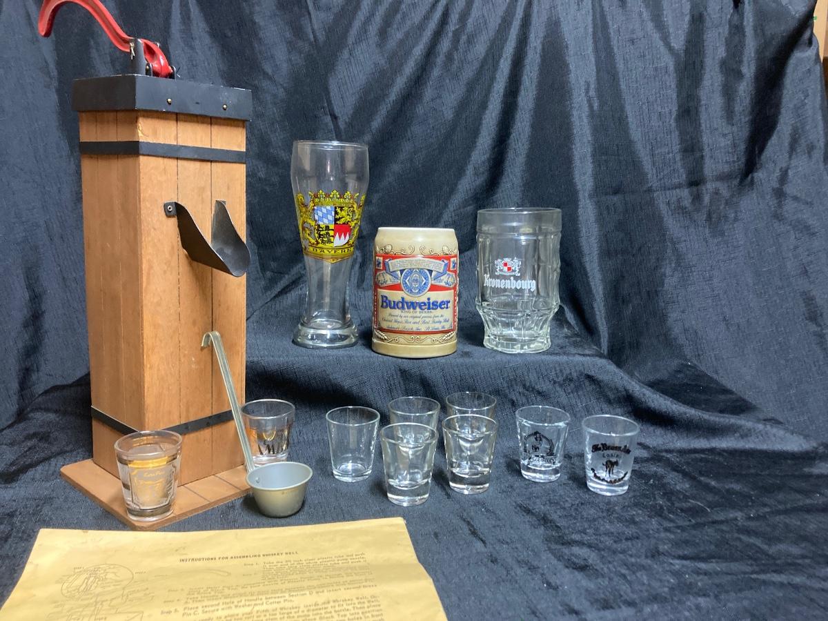 LOT 143 VINTAGE WHISKEY WELL, SHOT GLASSES, BUDWEISER BEER STEIN AND BEER GLASSES (Basement)