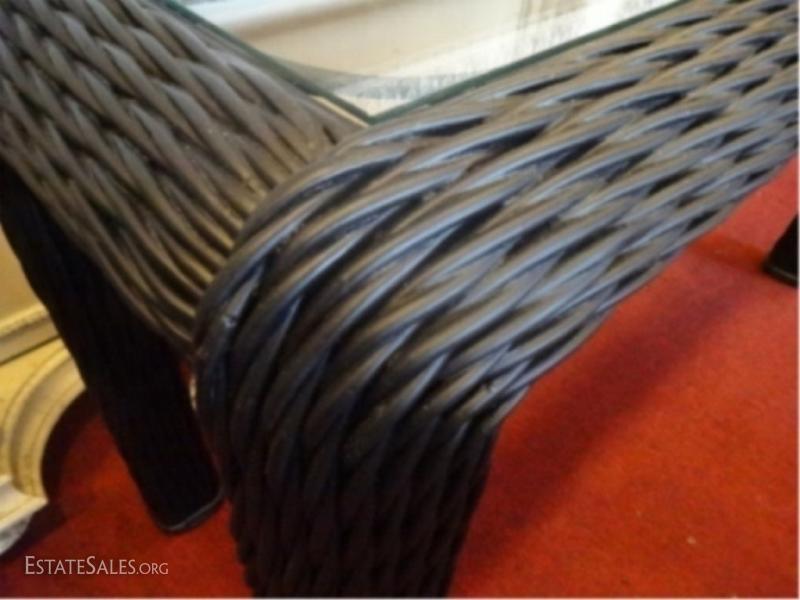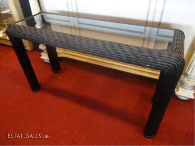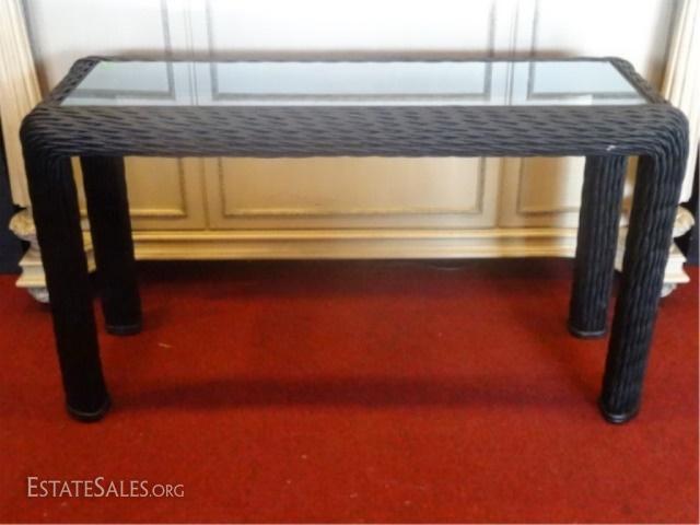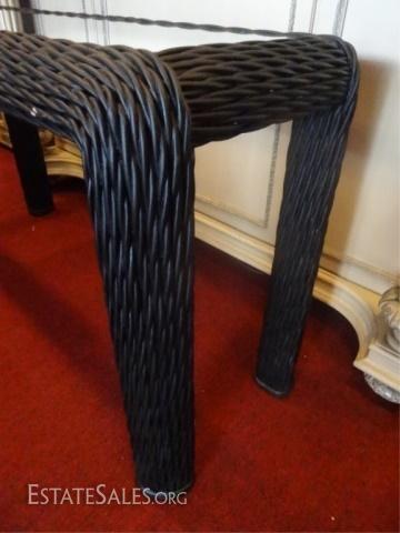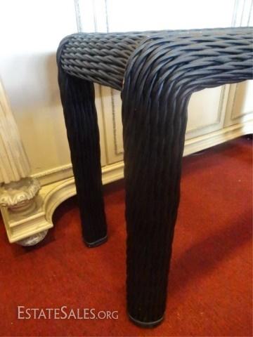 LOT 143A: MID CENTURY RATTAN CONSOLE TABLE, BLACK PAINTED FINISH