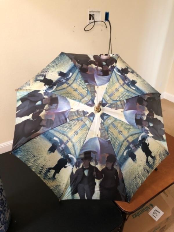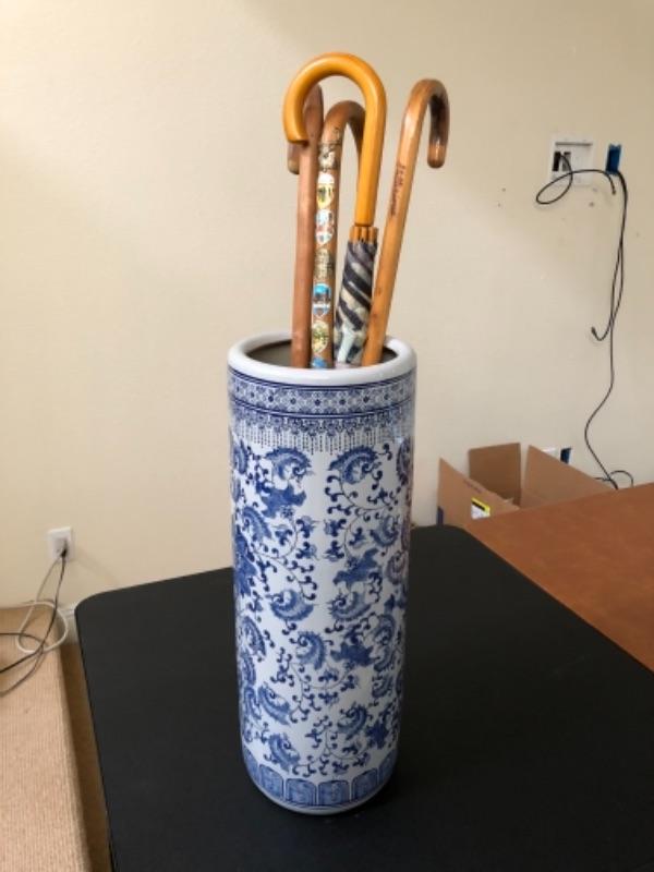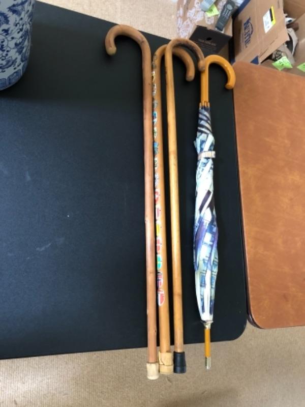 Lot 143U. Ceramic Asian-style umbrella stand with art print umbrella and three wooden canes, one vintage with international badges--$35