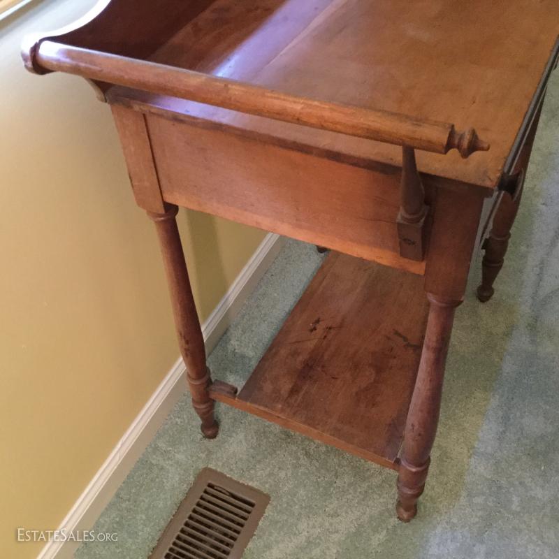 Nice antique wash stand measures 30"l x 17"w x 32"h. Use it as a side table in your home! This lot includes a side chair with a perfectly worn leather seat. 18"l x 14"w x 39"h. See photos for details. No Shipping. Only local pick up in Flat Rock, NC.
