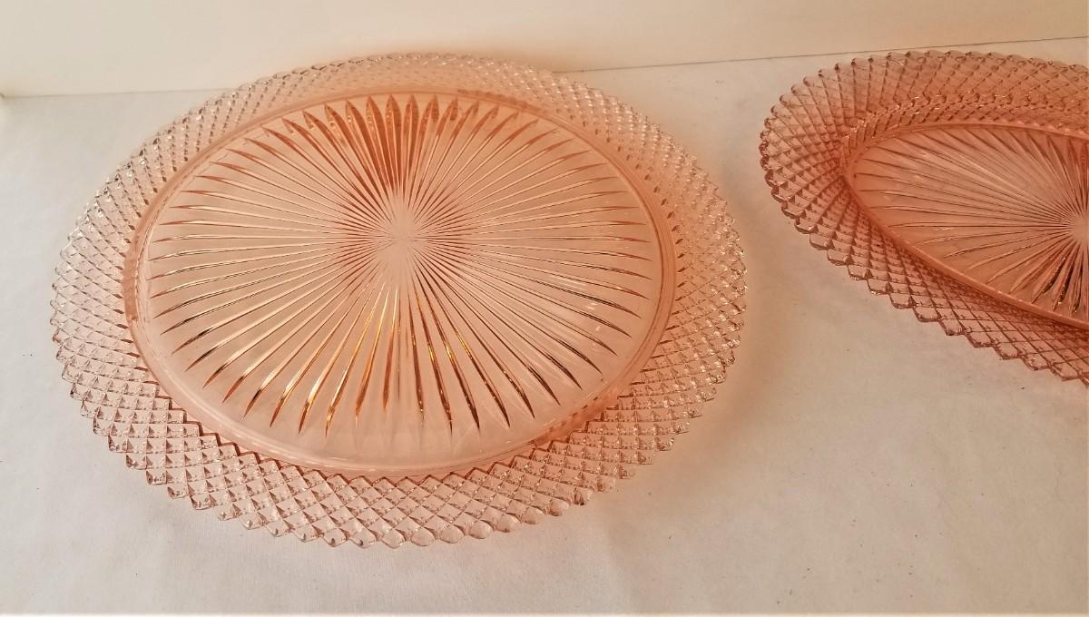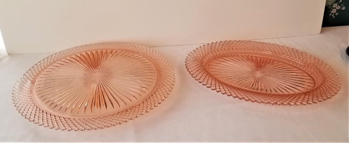 Depression glassware - Small platter and Cake Plate in the pink "Miss America" pattern. The footed Cake Plate is 12" across - there is a TINY chip on one foot (you have to feel to find it). Small platter is 12" long - good condition. The cake plate is rather hard to find.