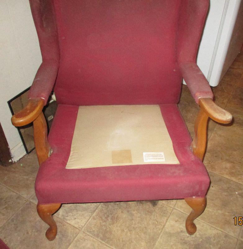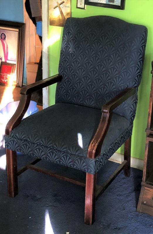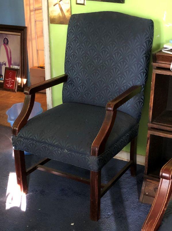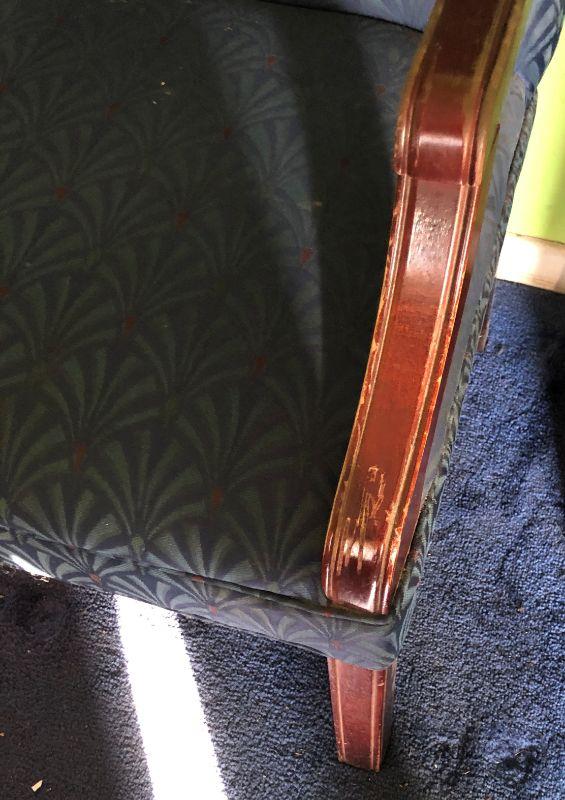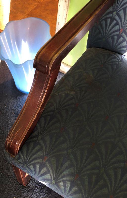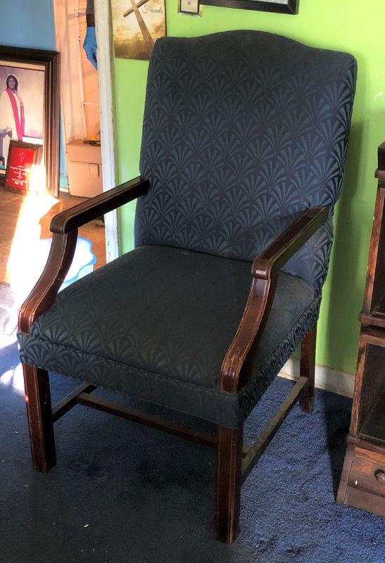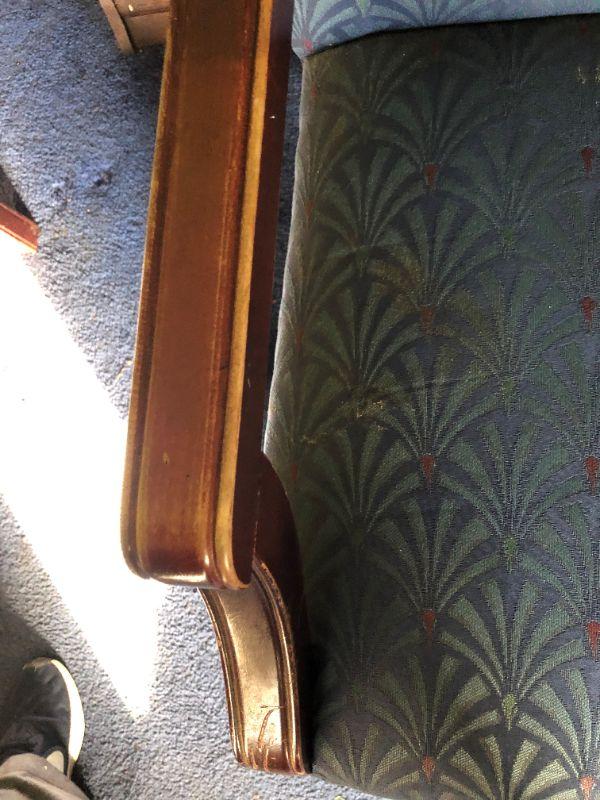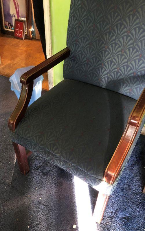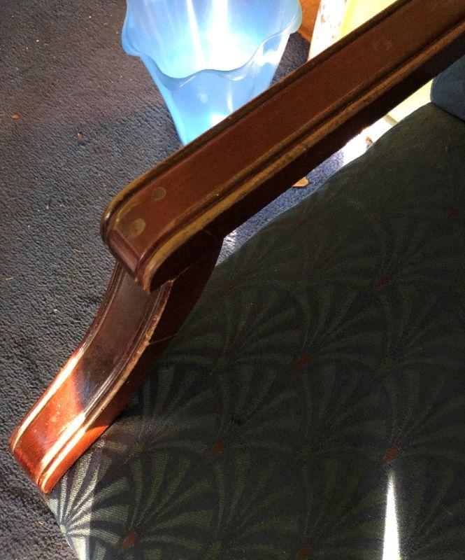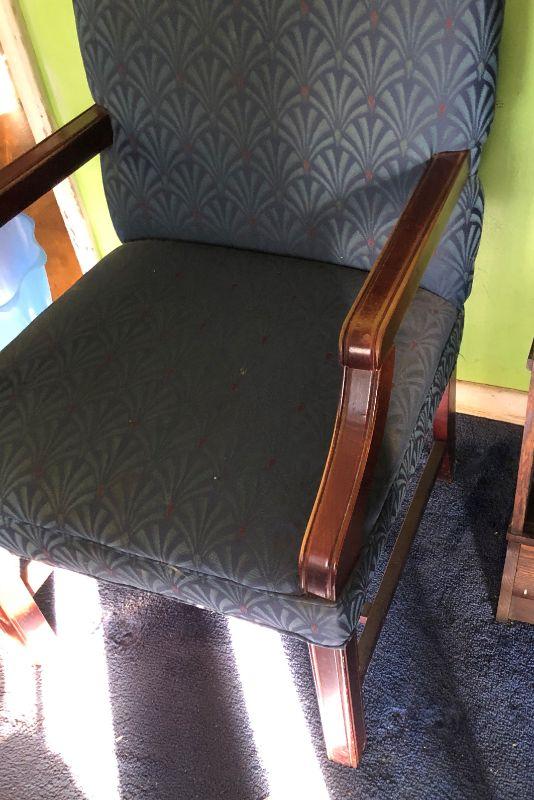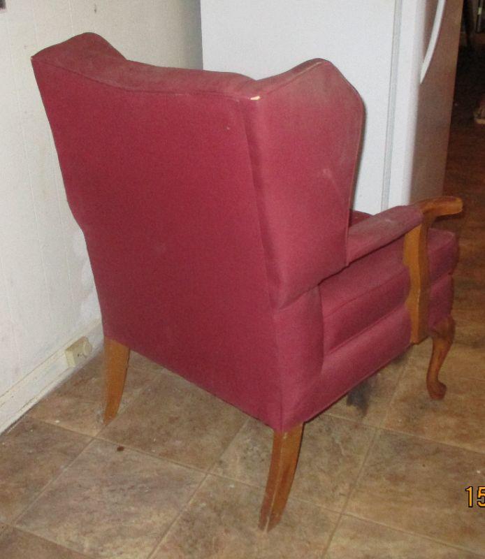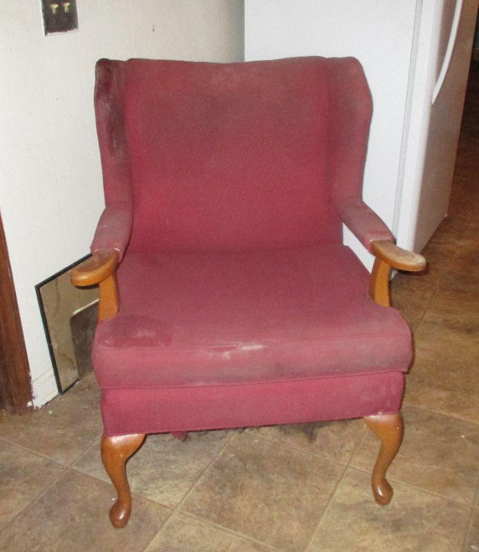 Great structural condition, but the upholstery on the two matching chairs could use a good cleaning. There are some spots of finish wear on the arms, but it's cosmetic and not damage. It is 40" tall and the seat is 18" tall. On the vintage wingback chair, it could use re-upholstering or a slipcover, but it is very comfortable and has a spring bottom.